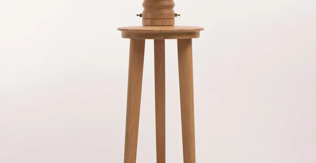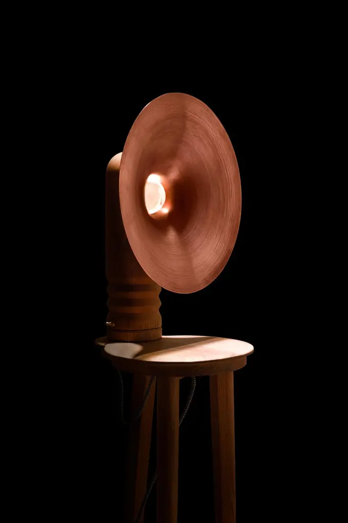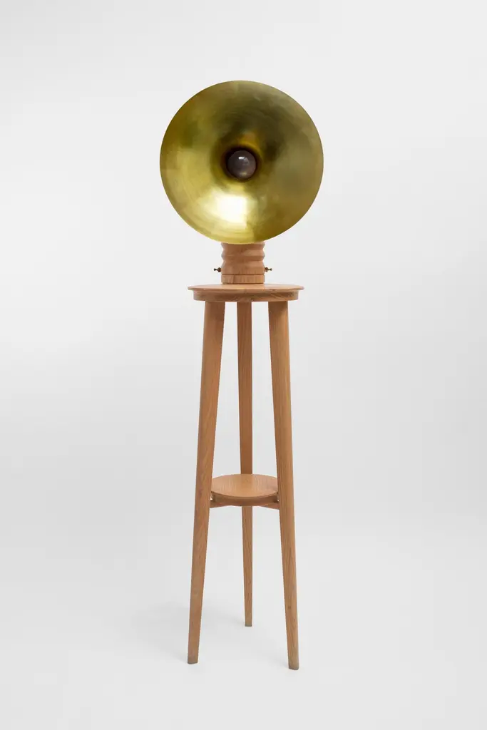 Sousaphone floor lamp by AcoocooroDimensions: W 40 x D 29 x H 152 cm.Materials: Two-tier solid oak wood tripod; copper or brass screen, and resin difuser; and brass accents and lightswitch.All our lamps can be wired according to each country. If sold to the USA it will be wired for the USA for instance.Sousaphone draws inspiration from the gleaming gramophones of the early twentieth century and reinterprets them to illuminate spaces. Its brass or copper screen creates unique and soft reflections. Where social gatherings were once enlivened by the gramophone's rough sound, Sousaphone now seeks to recreate its shine, silhouette, and presence.This piece is carved and polished by hand, and assembled using traditional wood joints. Both the metallic screen and the two-tier oak tripod offer some options for customization.Founded in 2017 by Martín Diego Salido-Orcillo and Antonio Mendoza Bravo, ACOOCOORO is a furniture, lighting and artifacts studio, a lab, focused on aesthetic and historic research, on objects' narrative and emotional relation with individuals and space.Every object, every piece, more than a product in a collection, is the result of exploration and experimentation through materials, processes and artisanal work. These elements fill every one of them with history, stories and memories: those of the individuals that conceive and create them, and those of the people that live their lives through and with them.Silent Design, finally, is a guiding principle in ACOOCOORO's practice, whenever the collaboration with artisan groups is involved, with a complex yet clear goal: the establishment of non-extractive, cooperative, self-sufficient relations, where craftsmanship, economic benefit, authorship, property, and narrative are reclaimed by and rebalanaced in favor of the artisans themselves, and notthe designers.