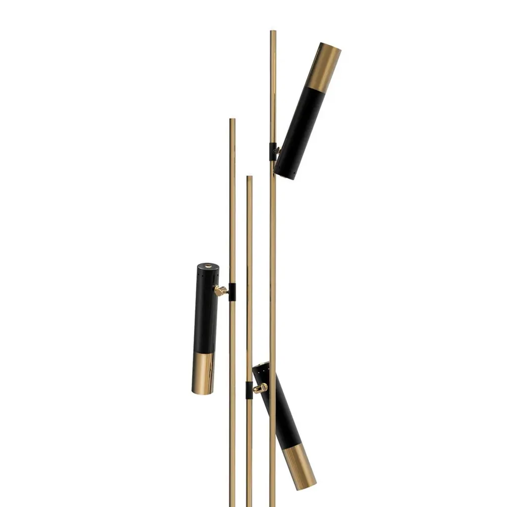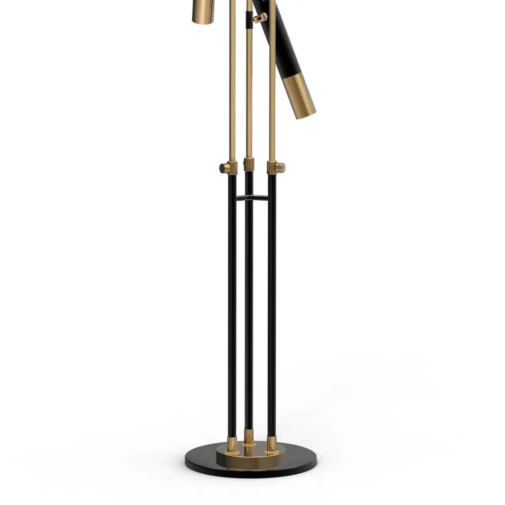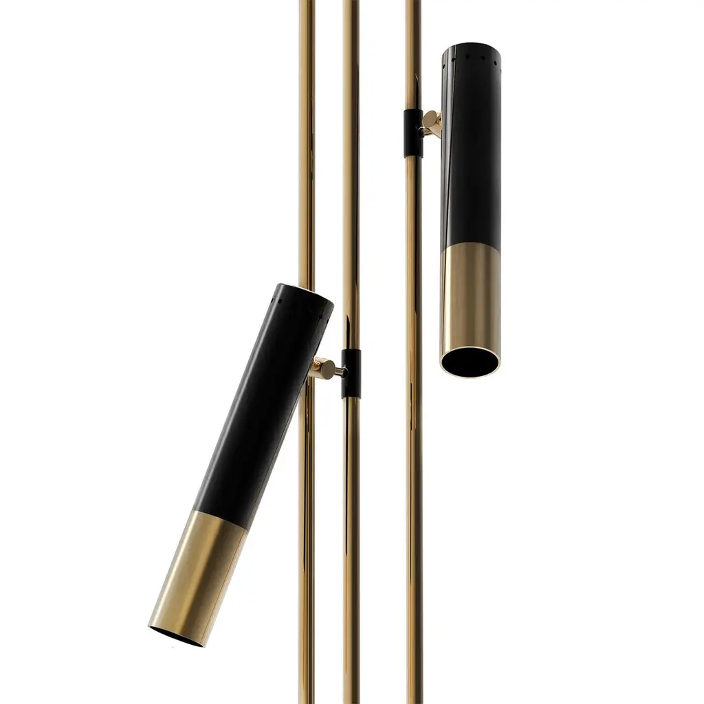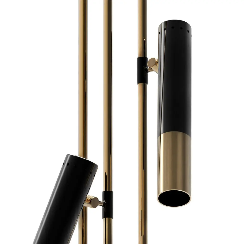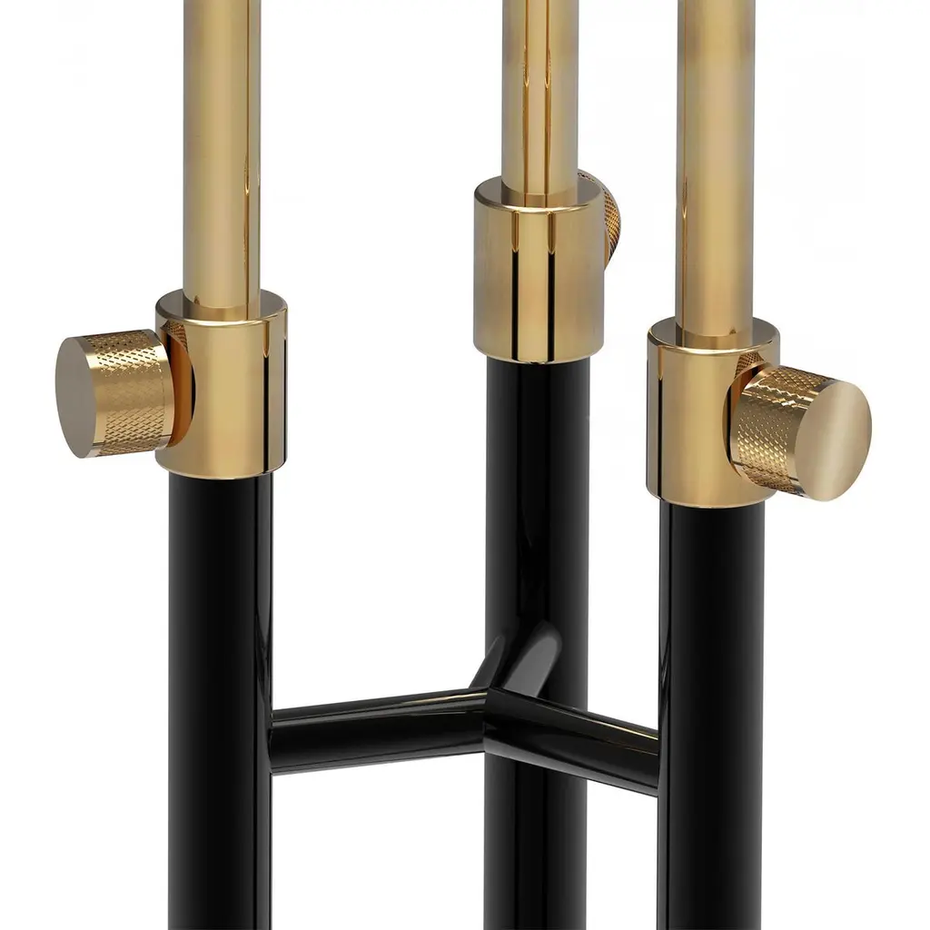 Floor lamp spike with base and 3 arms structurein brass in black finish and polished brass finish.With screwing system to adjust the height eachtelescopic arm. Shades in aluminum and brassin polished brass and in black finish.With 3 bulbs, lamp holder type G9, max 40wattsper bulb. Bulbs not included.