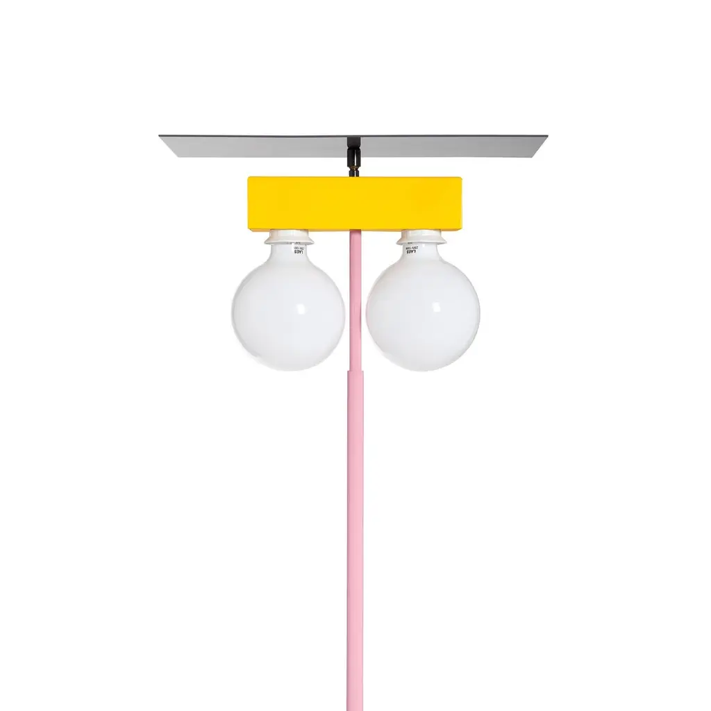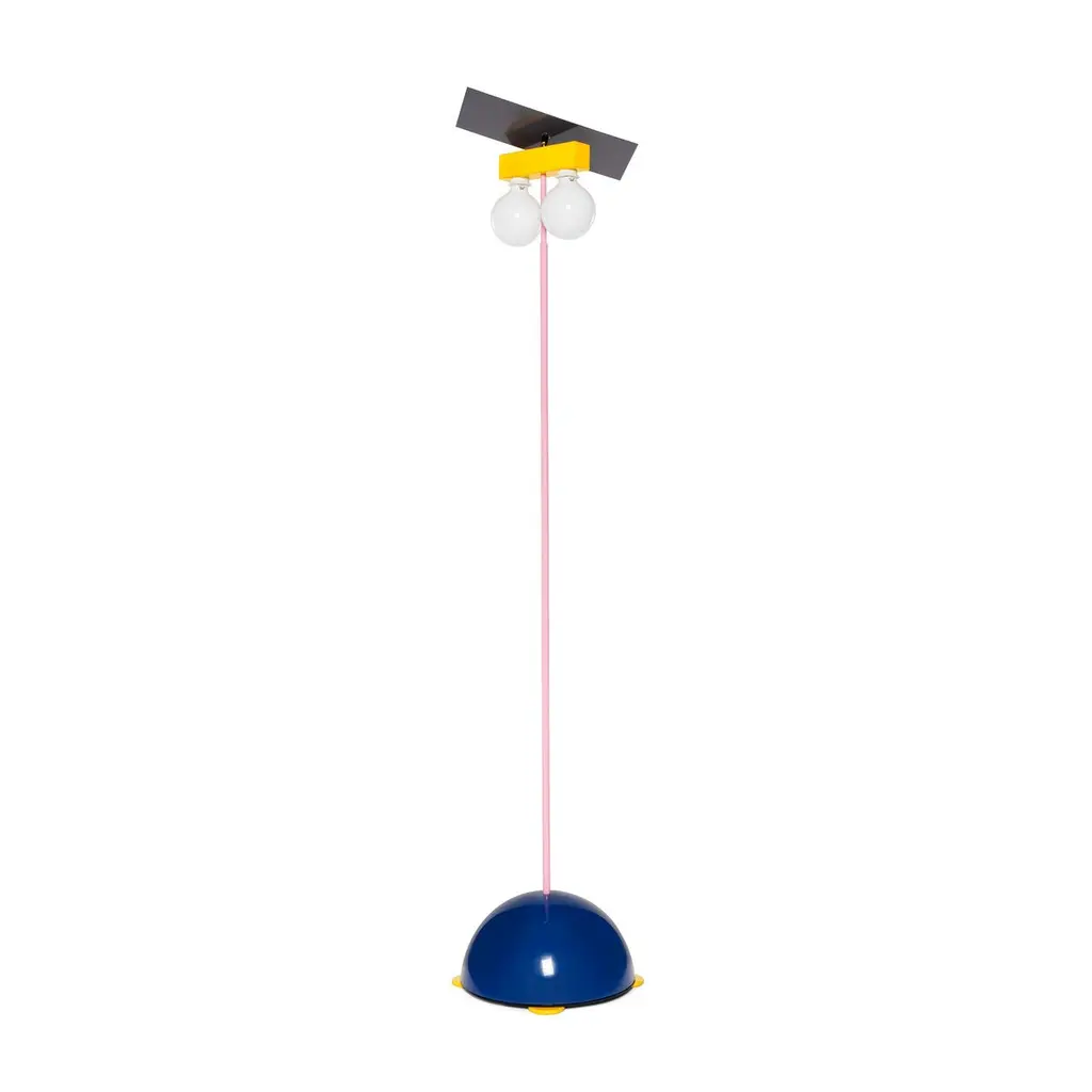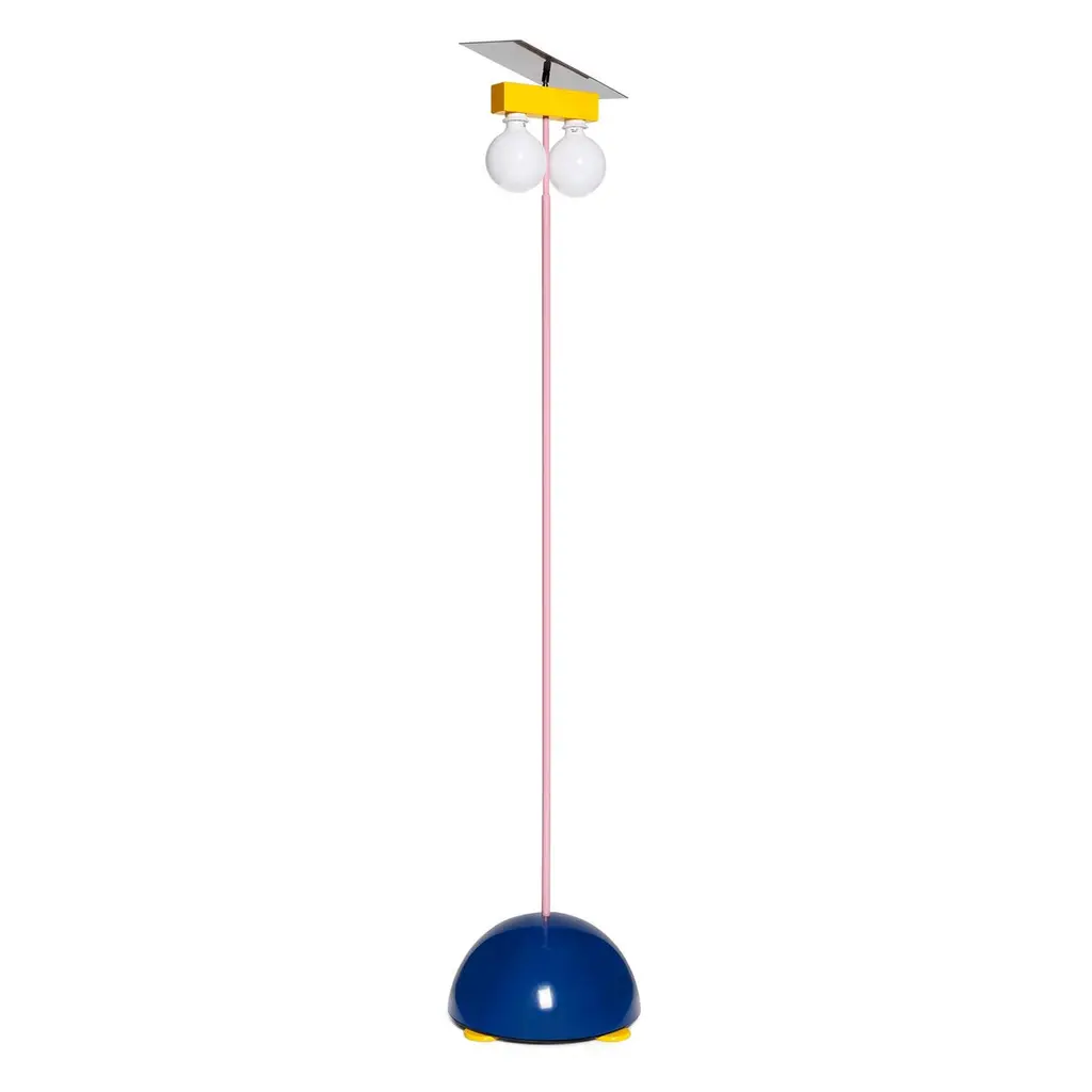 Painted metal floor lamp.An elegant floor lamp, Splendid astonishes with its colors and materials, glazed in blue and yellow gold.Precious, sacred and eternal colors, rooted in a cultural tradition that Memphis constantly rejects and embraces.Splendid, designed in 1981 by Martine Bedin, is a floor lamp composed of a semi spherical base that supports a slender steel post terminating in two light bulbs. The base is the part that strikes and intrigues the observer, due to the presence of thin lateral disks that poke out from the rim like little feet, giving the lamp an anthropomorphic aspect.Bedin has suggested that the love of the bright, warm colors utilized in her creations comes from her personal history. In particular, the Mediterranean identity of the French designer is the characteristic that immediately brought her closer to the Memphis group, through the use of outlandish colors and unique juxtapositions.