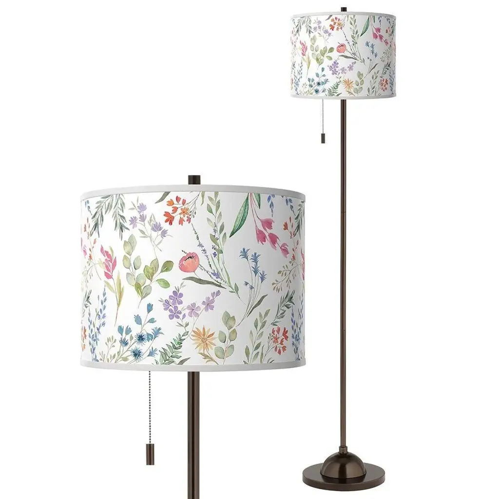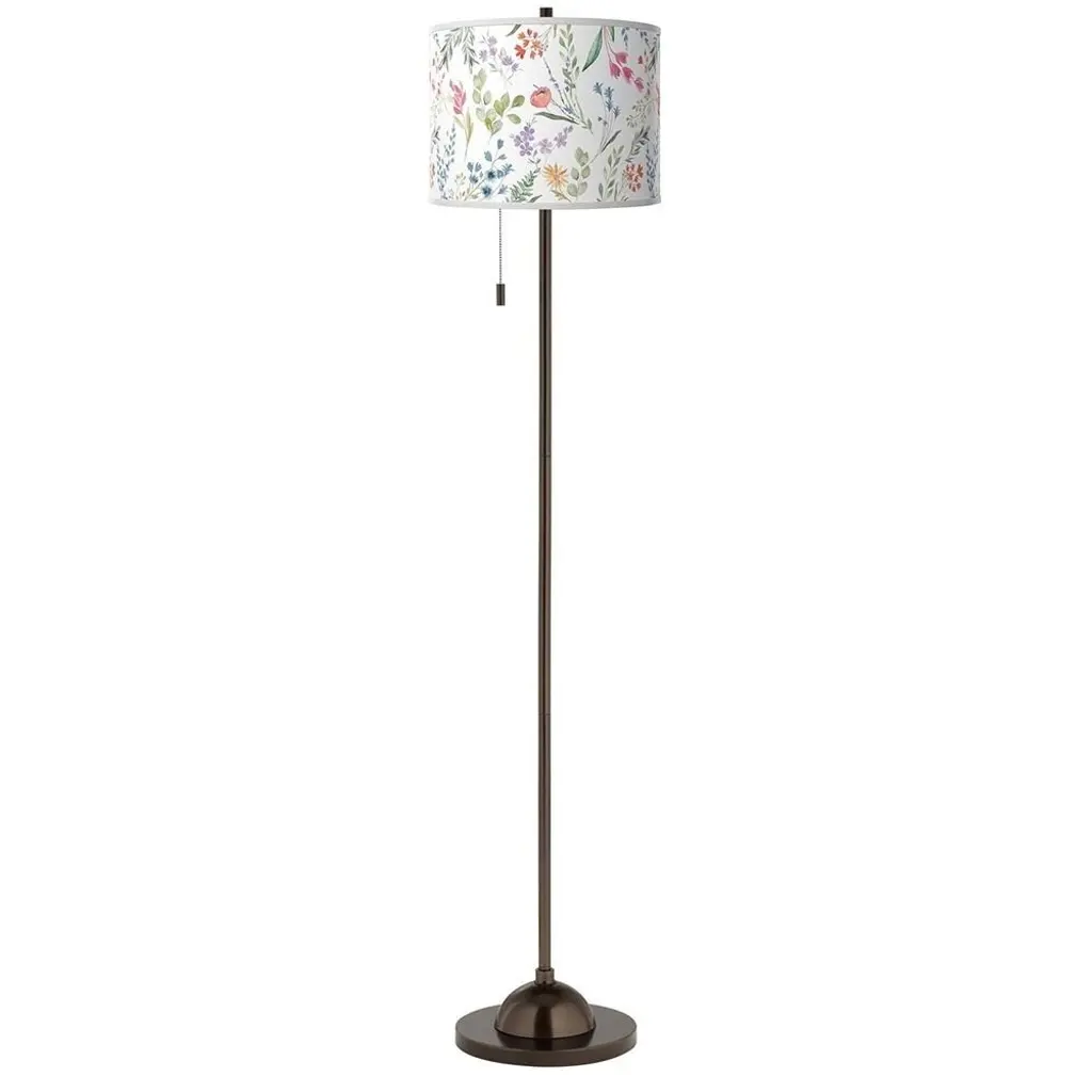 PRODUCT DETAILS: Overall: 62" high. Shade is 13 1/2" wide x 10" high. Base is 11" wide. Takes one maximum 100 watt bulb (not included). On-off pull chain. Club floor lamp with slim profile. Tiger bronze finish. Custom printed Spring's Joy pattern drum shade. DESCRIPTION: Add style to your favorite room with this club style floor lamp. The lamp comes in a tiger bronze finish and has a slim profile perfect for seating areas, bedrooms and more. Up top is a drum shade with a stylish Spring's Joy printed giclee pattern. An on-off pull chain hangs below the shade within easy reach. Custom made-to-order shade design.