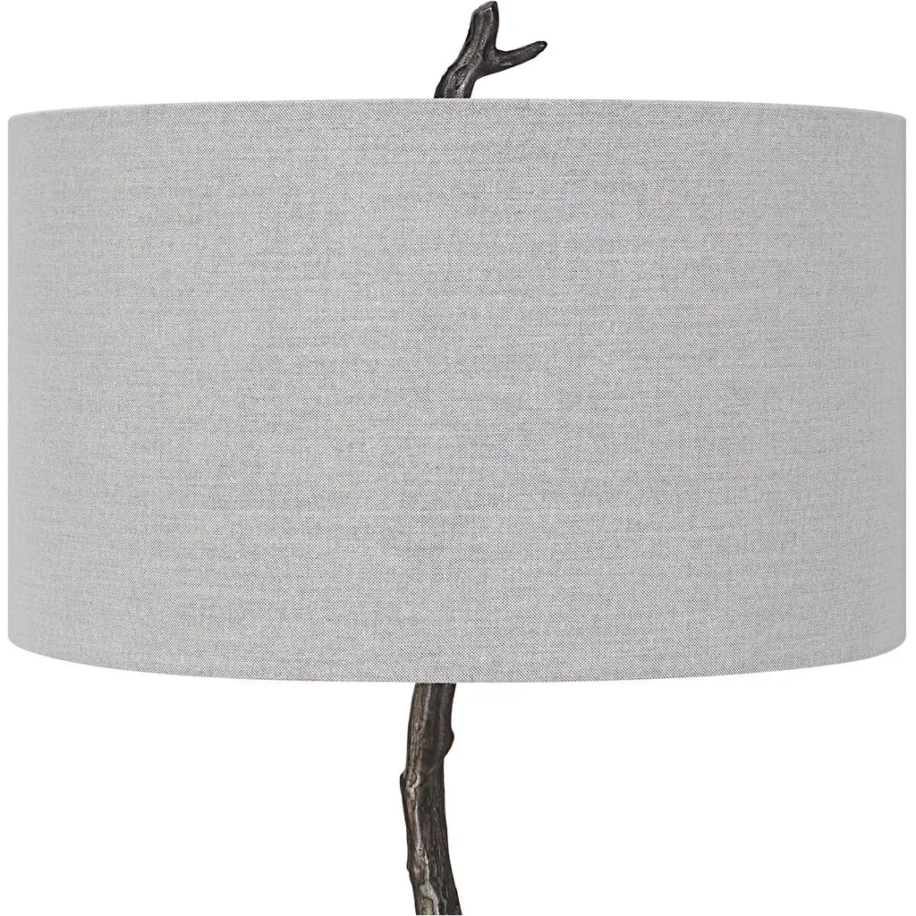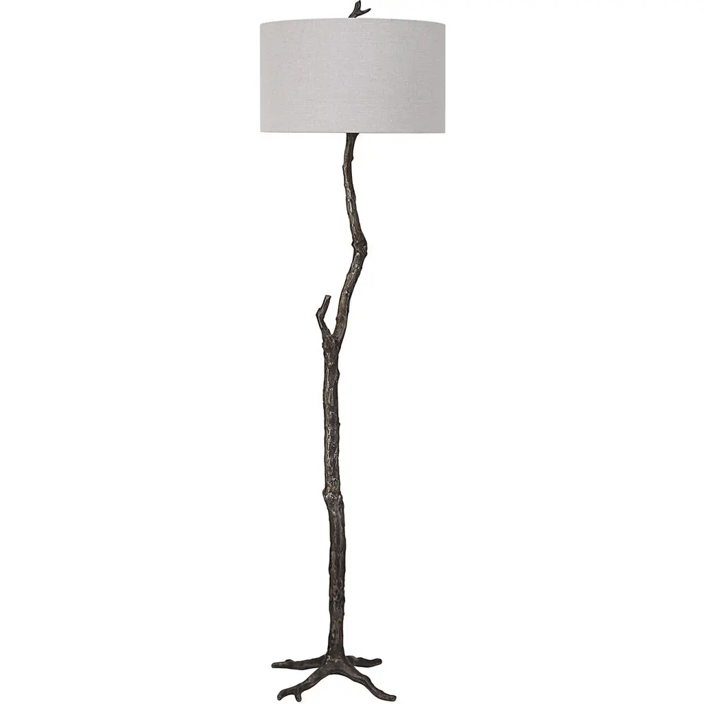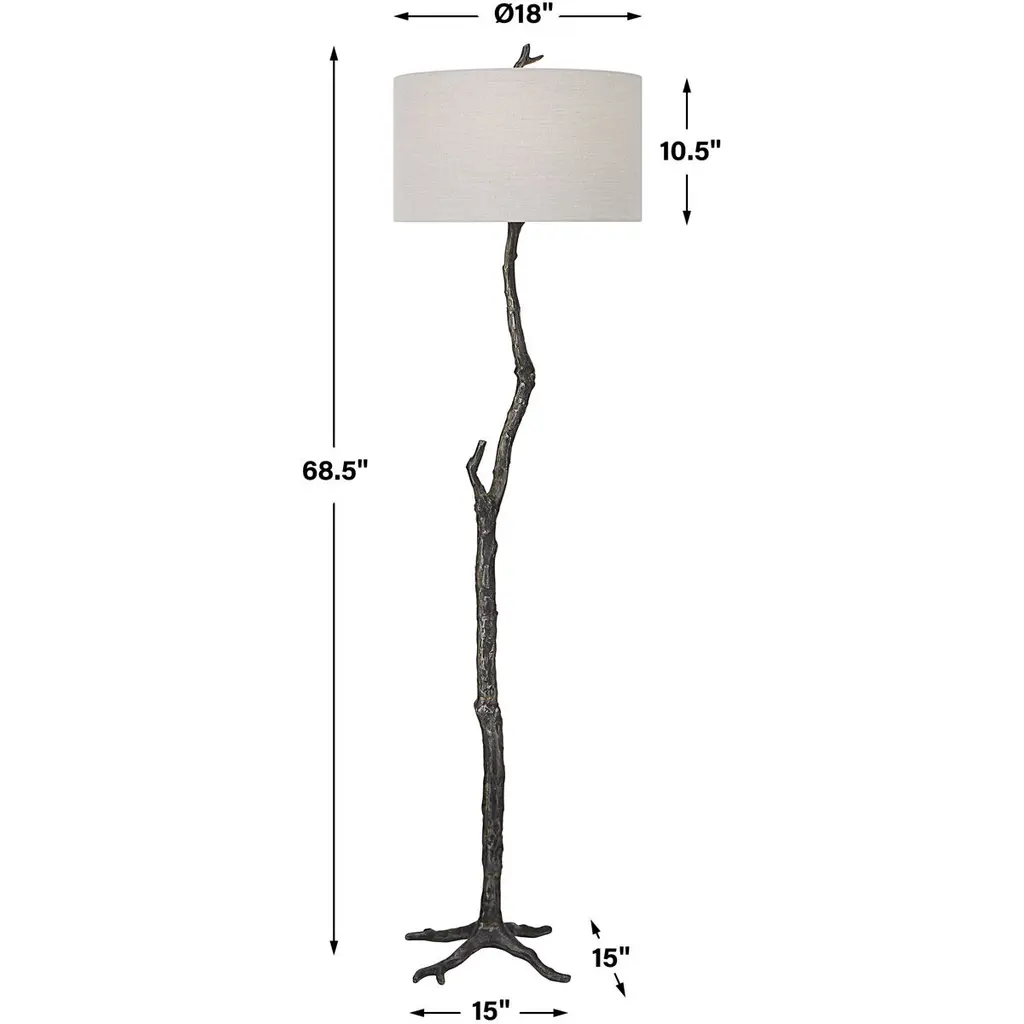 Drawing Inspiration From Nature, This Floor Lamp Is Handcrafted From Cast Iron With Sculpted Details Finished In Distressed Rustic Black And Subtle Silver Undertones. A Hardback Drum Shade In Light Gray Linen Fabric Accents The Piece.