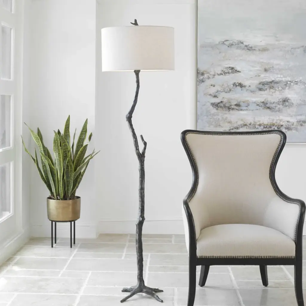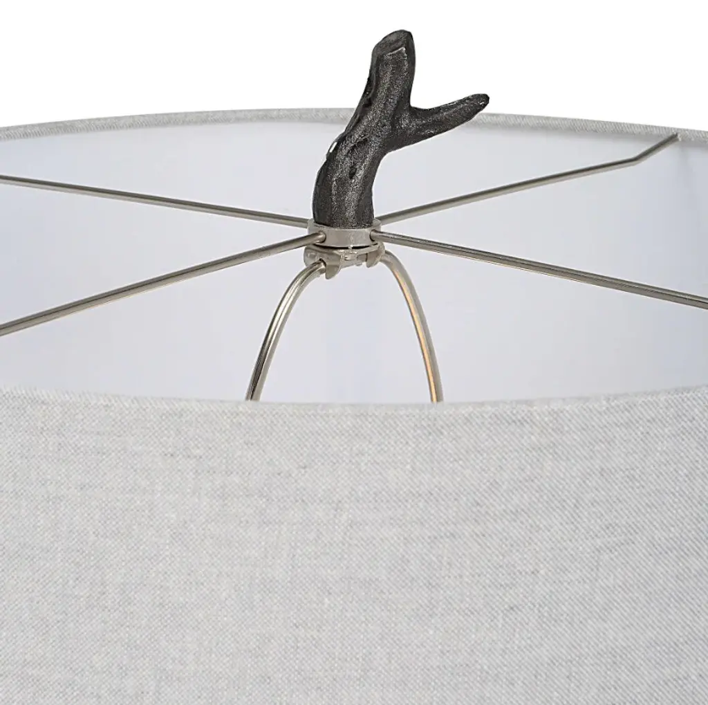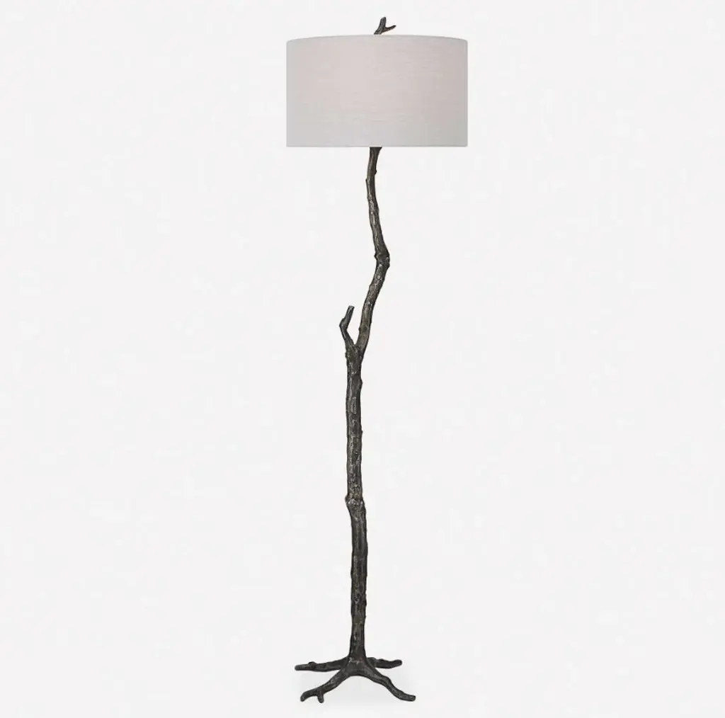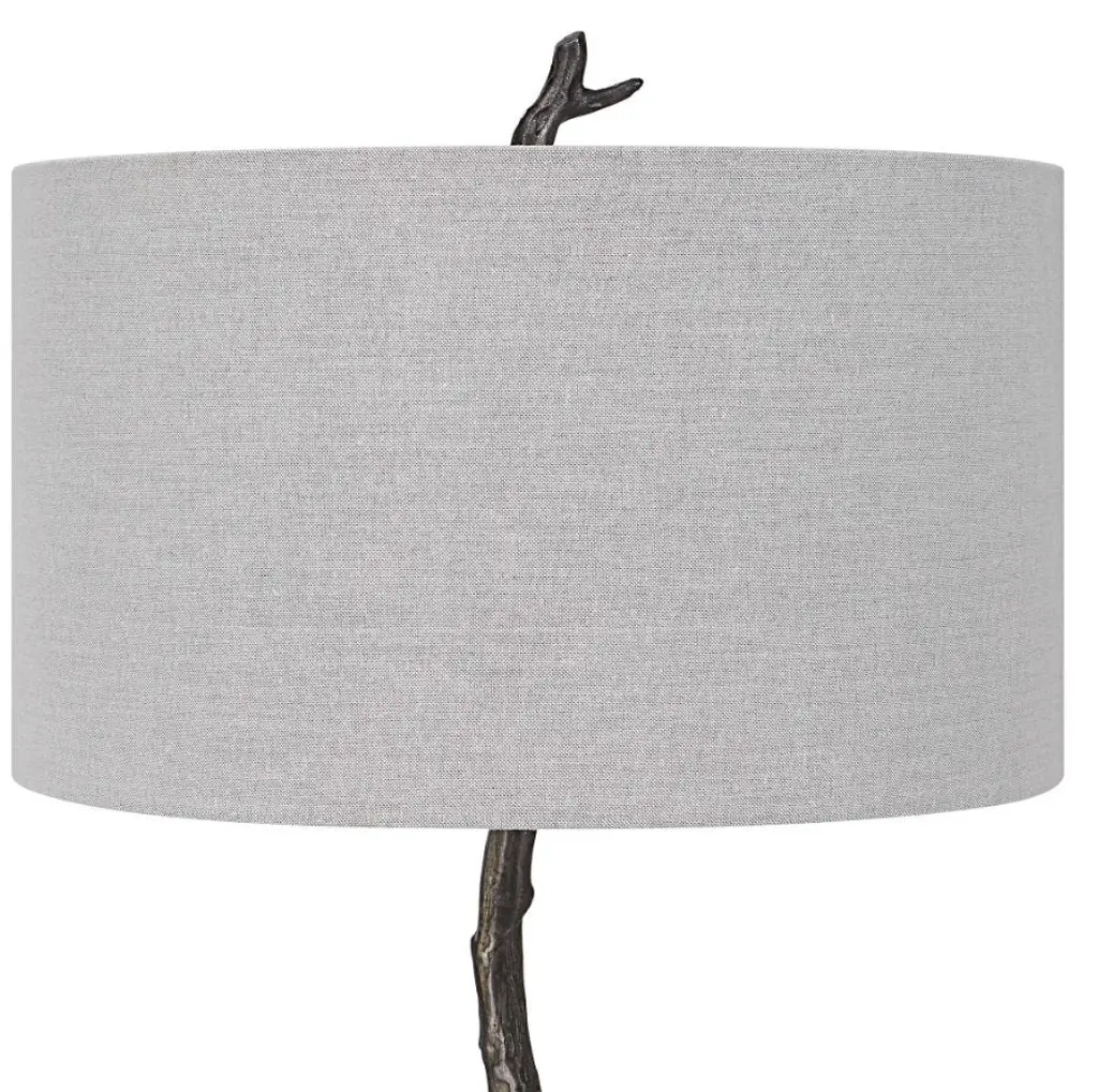 The Spruce floor lamp draws inspiration from nature and is handcrafted from cast iron, featuring sculpted details in a distressed rustic black finish with silver undertones. The piece is completed with a light gray linen fabric hardback drum shade, adding a touch of elegance to the design.