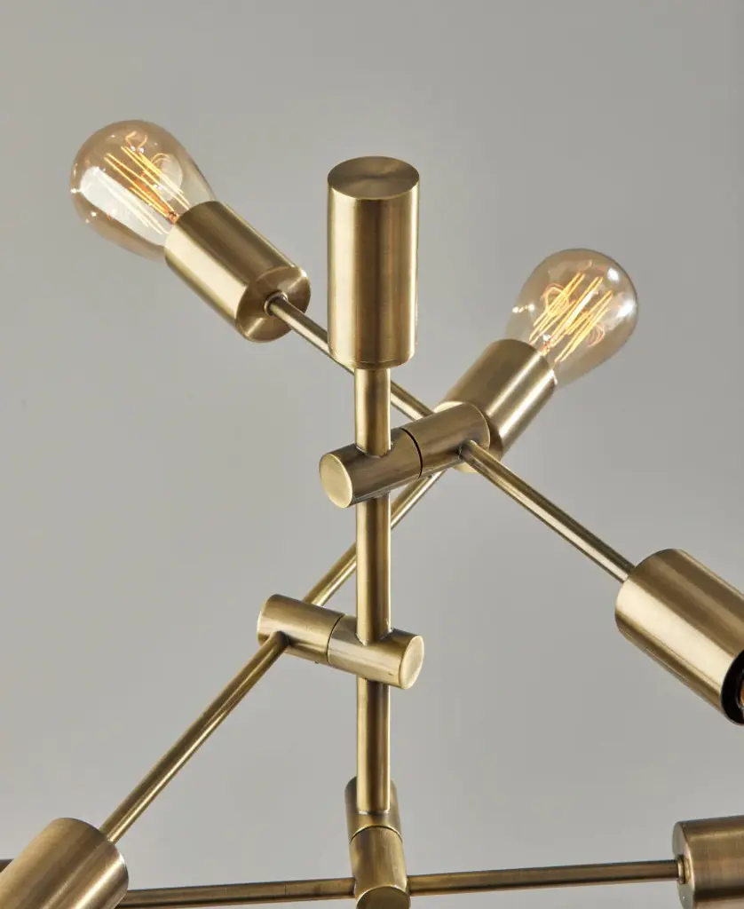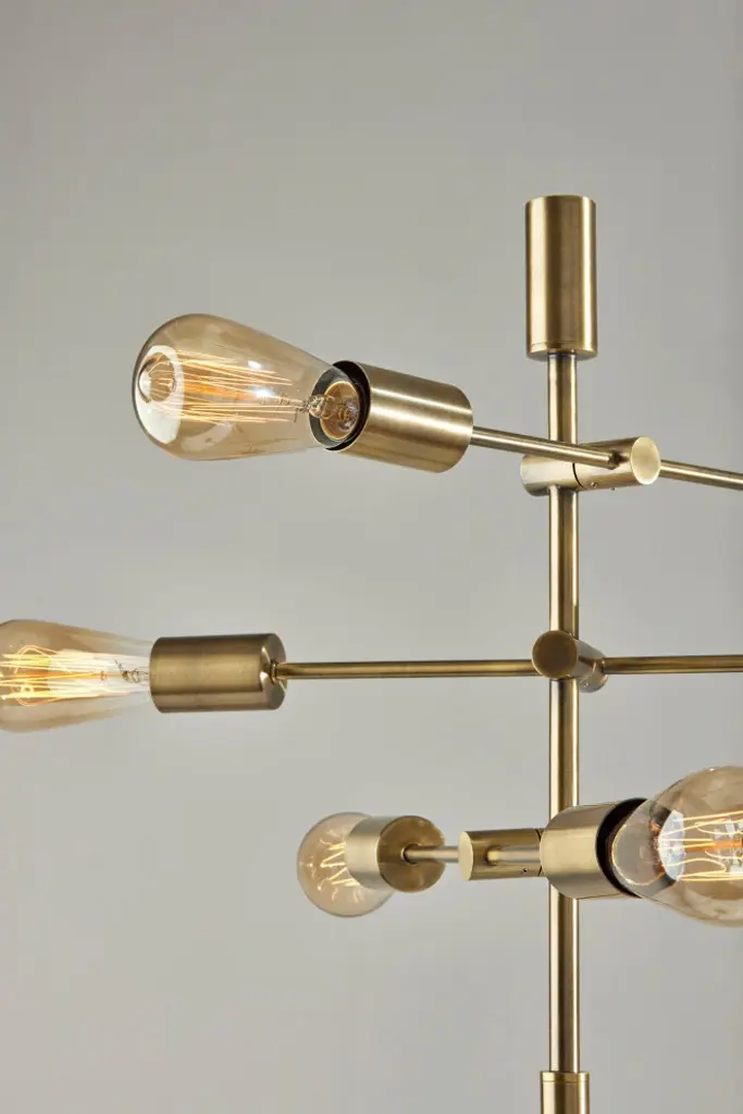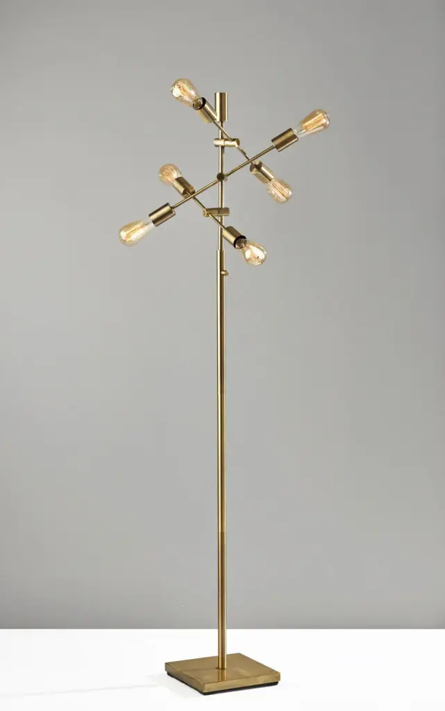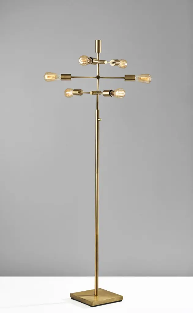 The Sputnik floor lamp''s innovative design exudes retro-modern style. Crafted of antique brass and featuring the quintessential mid-century modern Sputnik silhouette, this 67.5" tall lamp is a dramatic addition to living rooms, dining rooms, or bedrooms. The tall, slender antique brass pole is topped by three matching rods that lead to six 40W vintage Edison bulbs (included), illuminating your space with warm amber light in all directions. To maximize visual interest and create a unique geometry, the three rods are of varying lengths and set at offset heights and angles. The lamp is anchored by a 10" square base with an antique brass finish, while it is operated by a rotary switch located on the pole. For larger rooms or placement beside furniture, the Sputnik design is also available as a floor arc lamp.At 67.5" tall, 27.5" wide, and 25" deep, the lamp offers a compact footprint for any space.Antique brass construction and Sputnik design complement mid-century modern, vintage, and industrial décor.Six 40W vintage Edison bulbs are included.The three rods are positioned at varying angles and heights, dispersing the light in multiple directions.Also available as a larger Sputnik arc floor lamp for placement behind or beside furniture.6 x 40W Vintage Bulbs Included