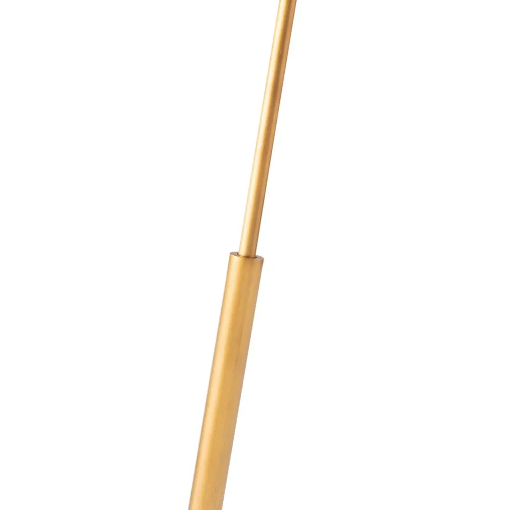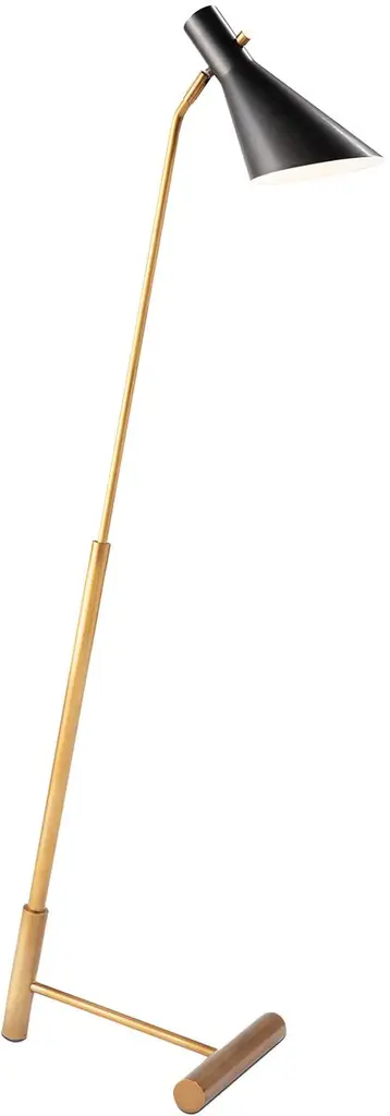 A 21st-century update of Mid-Century Modern finesse, this floor lamp pairs an angled body with an eye-catching kickstand base. The combination of white or blackened and bright brass finishes adds timeless sophistication.