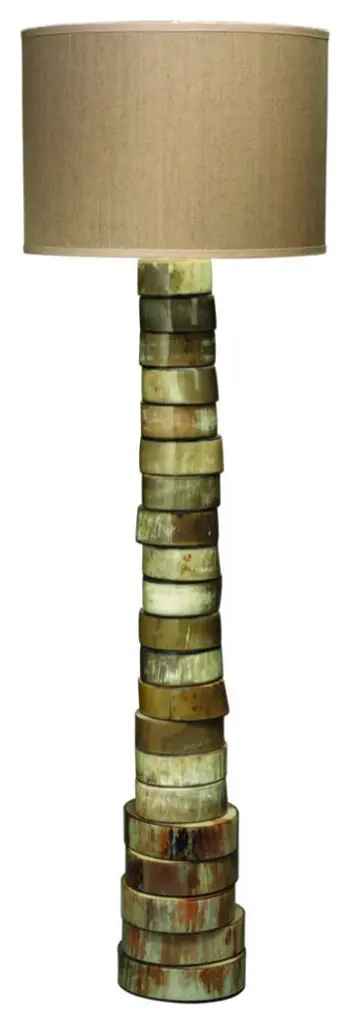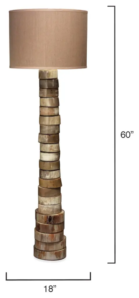 Add the spectacular beauty of buffalo horns with none of the cruelty to your home. The stacked horn rings are created by artisans from layers paper and lacquer in one-of-a-kind colors and patterns. Balanced with a hemp shade that makes this ideal for refined rustic or luxe lodge environments. •Crafted of Faux Horn•Elephant Hemp Drum Shade•Stacked Horn Design•Plug-InPattern and finish may vary, no two are exactly alike. These unique imperfections give our products character and individuality, with each piece having its own personality.•Lamp Dimensions: 47" H x 8" Footprint Diameter•Shade Dimensions: 13" H x 18" D x 18" W•1 bulb required; Bulb Not Included•150 Max Wattage; 120 Volts•E26 Bulb Base Type •8 Ft Clear Cord•3-way SwitchCare Instructions: We do not recommend using harsh or abrasive cleaners at any time as they can damage product. Wipe surfaces gently with soft, dry cloth. If needed, you may use a lightly damp cloth with water only on base.