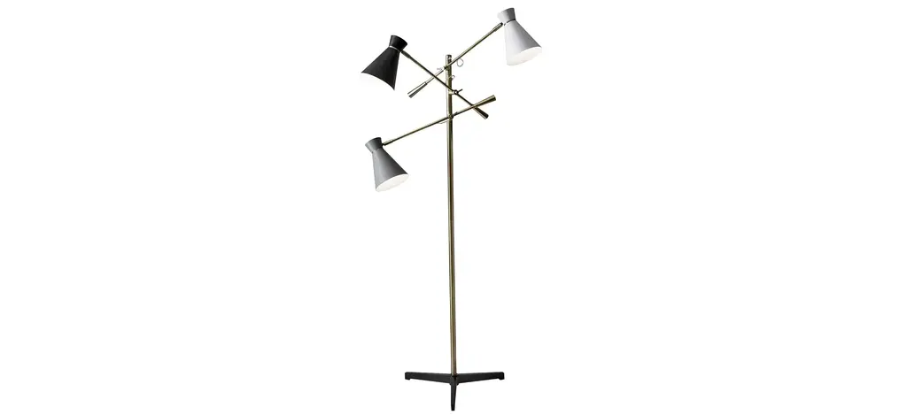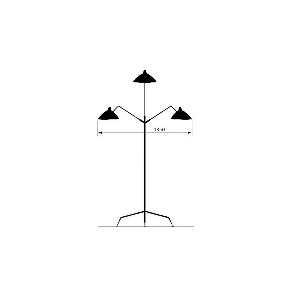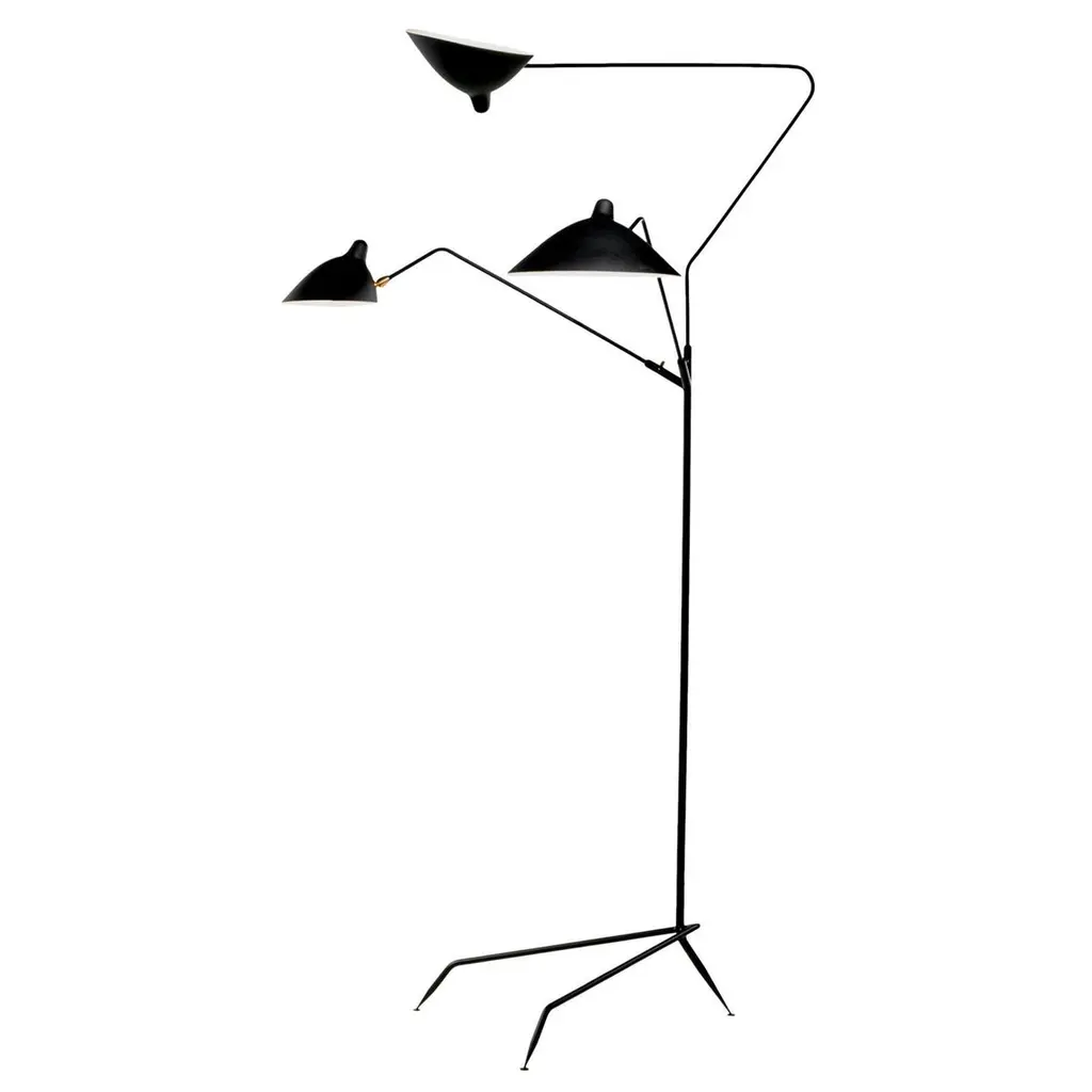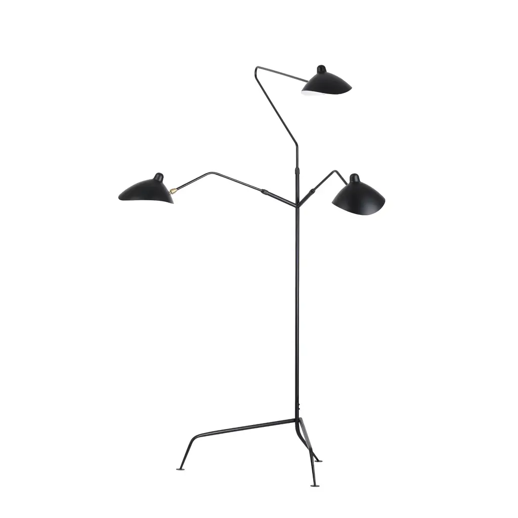 Standing lamp 3 rotating arms by Serge MouilleDimensions: D135 x W145 x H210 cmMaterials: Brass, steel, aluminiumOne of a King, Numbered.Also available in different colour.All our lamps can be wired according to each country. If sold to the USA it will be wired for the USA for instance.Reissue of an iconic 1952 model from the "Black Forms" series, this Serge Mouille 3-arm floor lamp has brass ball joints. Designed with three legs and three reflectors in black lacquered aluminum and white interior, it is made from steel rods painted black. Also available in white, this model will be delivered numbered with its certificate of authenticity as soon as possible.Serge MouilleBorn in Paris in 1922, Serge Mouille is today considered one of the greatest lighting designers in the world. He developed a talent for drawing and creation very early on and was the youngest student of his time to be admitted to the School of Applied Arts at the age of 13.Master goldsmith, Serge Mouille learned the art of modeling metal with a Hammer thanks to his mentor Gabriel Lacroix and worked for several goldsmith houses in Paris. It was his meeting with Jacques Adnet, director of the Compagnie des arts français, that would mark a turning point in his career.In 1951, Jacques Adnet commissioned Serge Mouille to create a “large light fixture” for his South American customers: the first three-arm floor lamp was born. This innovative Luminaire in molded black steel with organic shapes will influence his famous series of "Black Forms" and will forever mark the history of design. Serge Mouille then passes from the status of master craftsman to that of creative artist.At the beginning of the 1960s, Serge Mouille decided to radically distance himself from everything he had created until then by developing a series of light columns with fluorescent tubes. In 1963, he stopped producing lights to devote himself to teaching.Suffering from tuberculosis, Serge Mouille died in 1988 and his widow, Gin Mouille, decided to continue to bring his art to life by publishing under license his most emblematic creations. Each copy is made in France by Éditions Serge Mouille and has an engraved serial number, accompanied by a certificate of authenticity.