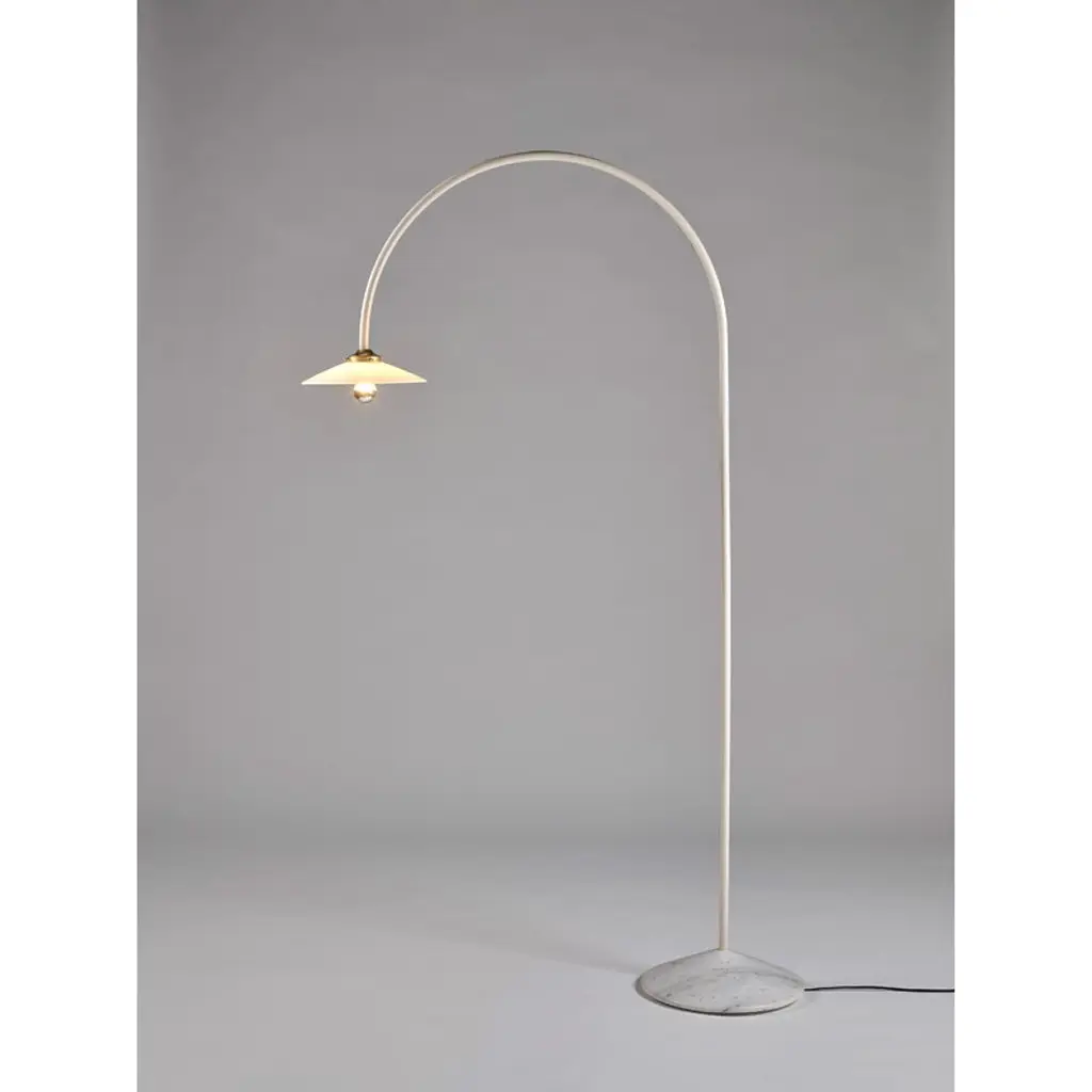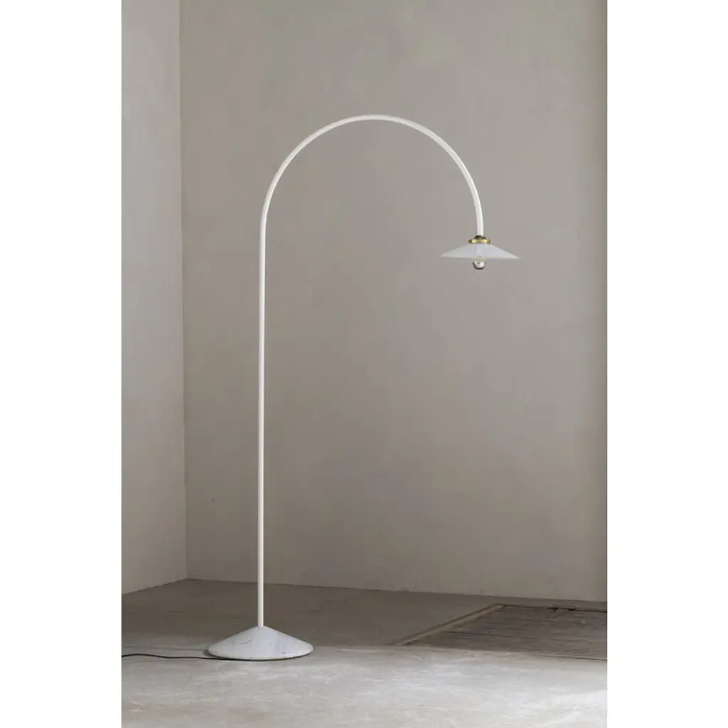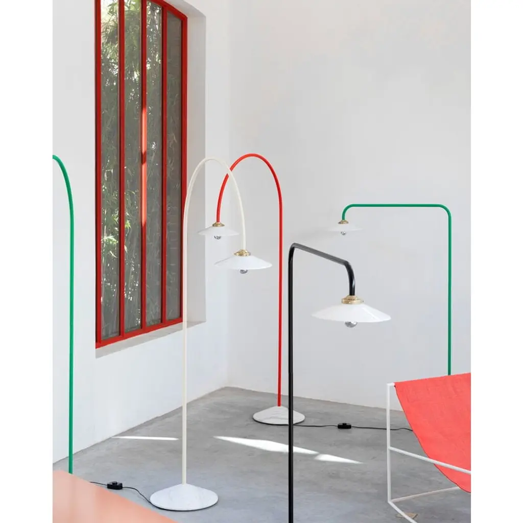 The Standing Lamp Marble, designed by Muller Van Severen for Valerie_objects, draws the eye with its minimal yet distinctly playful character. The luminaire's slender frame arcs upward and bends back toward the floor like a line drawing, ending in a classic glass shade. A solid marble base adds a touch of grounding contrast, making the Standing Lamp Marble an ideal reading light next to an armchair at home or a striking detail in cafés, hotel lobbies, and other public spaces.