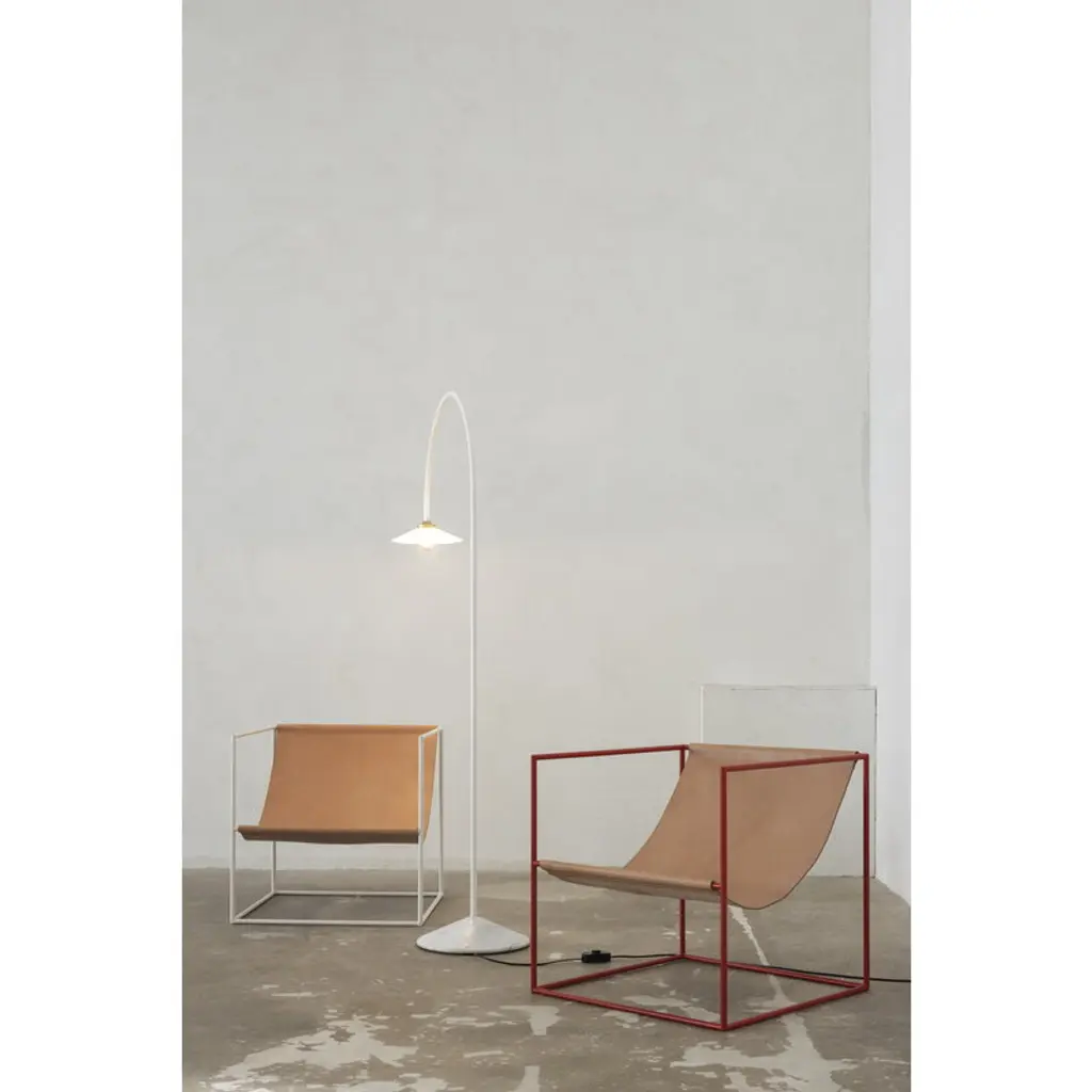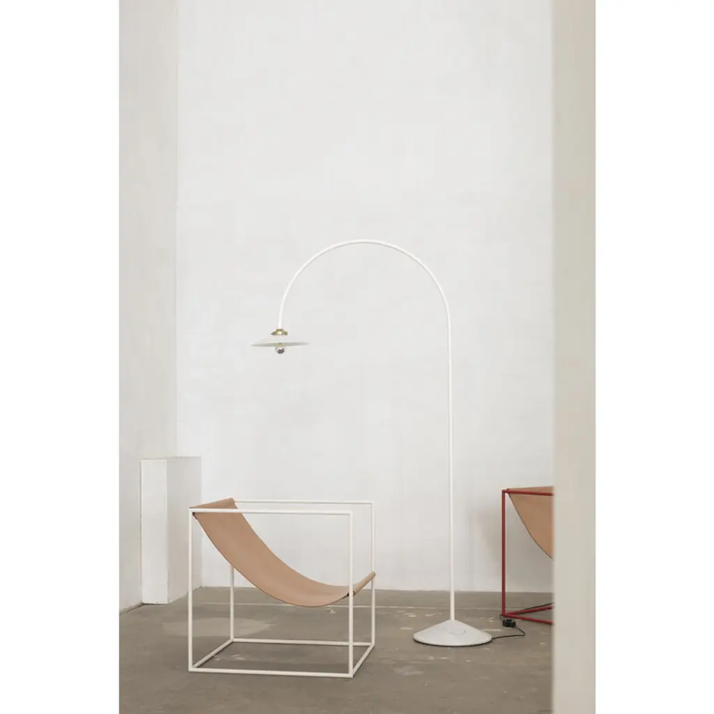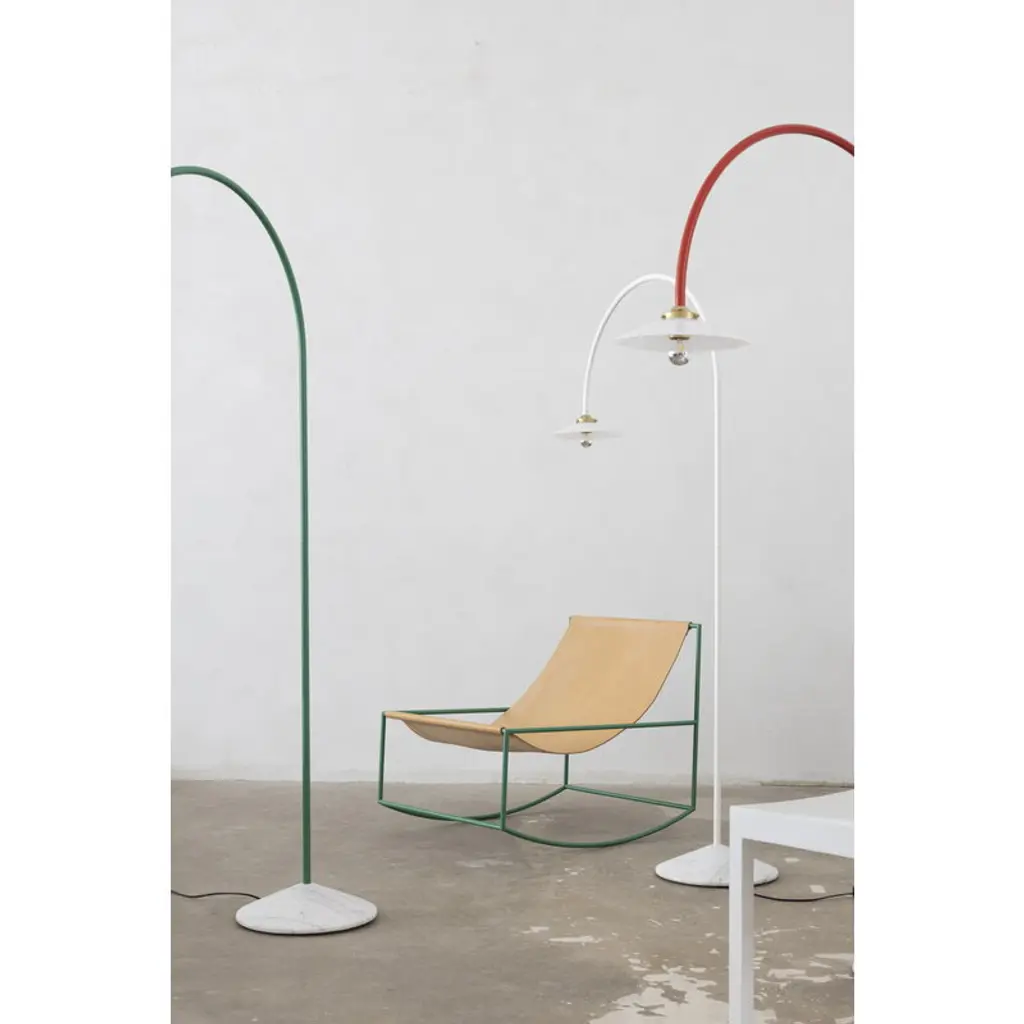The Standing Lamp Marble, designed by Muller Van Severen for Valerie_objects, draws the eye with its minimal yet distinctly playful character. The luminaire's slender frame arcs upward and bends back toward the floor like a line drawing, ending in a classic glass shade. A solid marble base adds a touch of grounding contrast, making the Standing Lamp Marble an ideal reading light next to an armchair at home or a striking detail in cafés, hotel lobbies, and other public spaces.