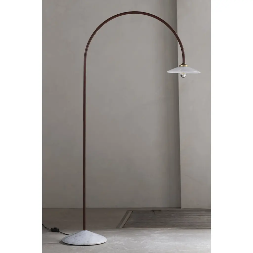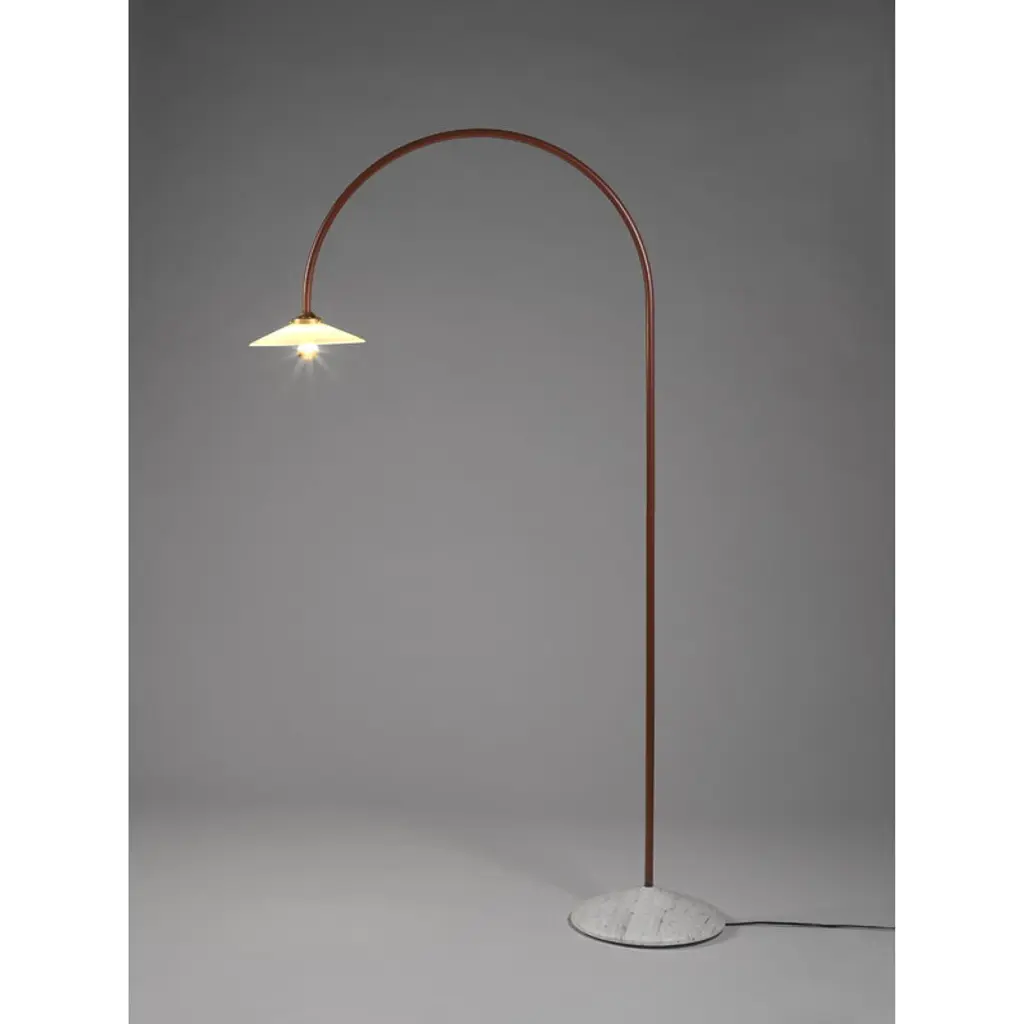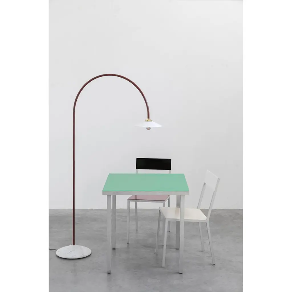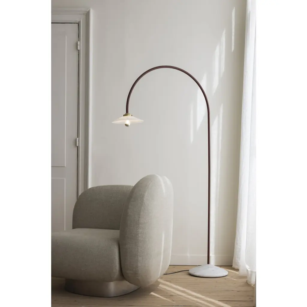 The Standing Lamp Marble, designed by Muller Van Severen for Valerie_objects, draws the eye with its minimal yet distinctly playful character. The luminaire's slender frame arcs upward and bends back toward the floor like a line drawing, ending in a classic glass shade. A solid marble base adds a touch of grounding contrast, making the Standing Lamp Marble an ideal reading light next to an armchair at home or a striking detail in cafés, hotel lobbies, and other public spaces.