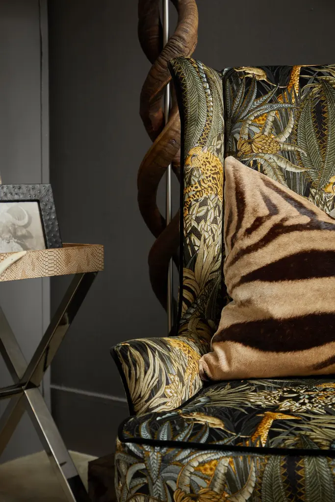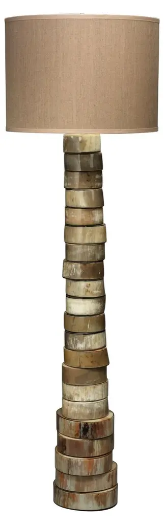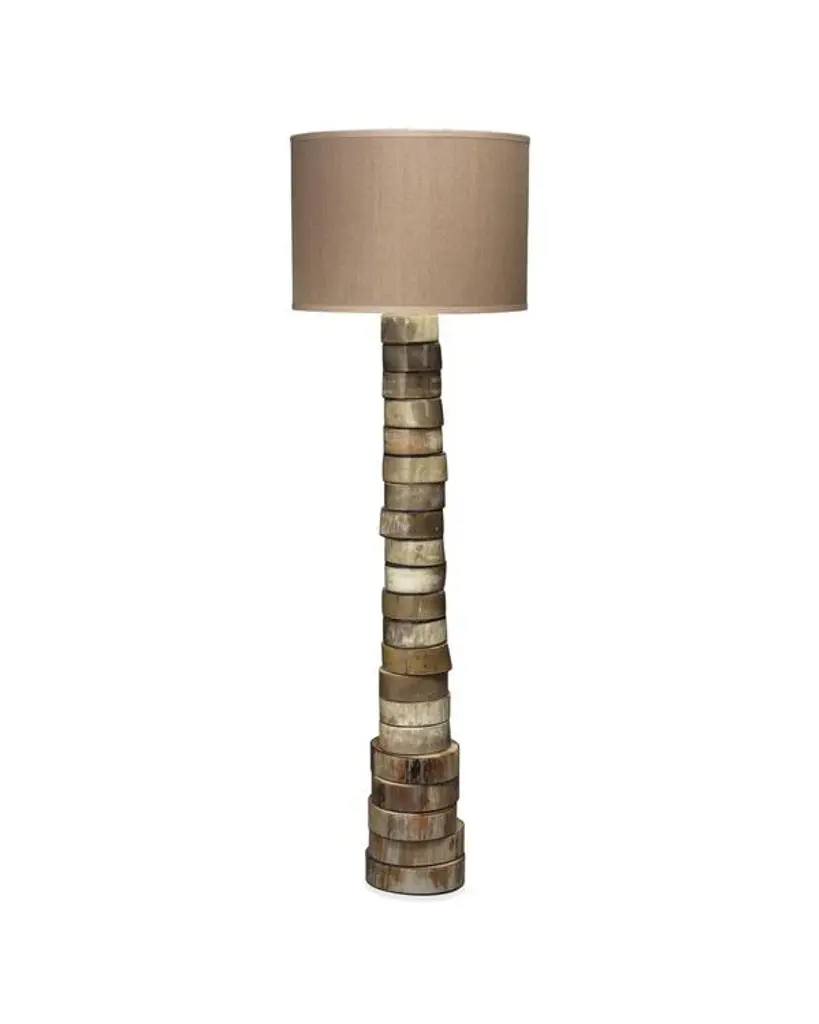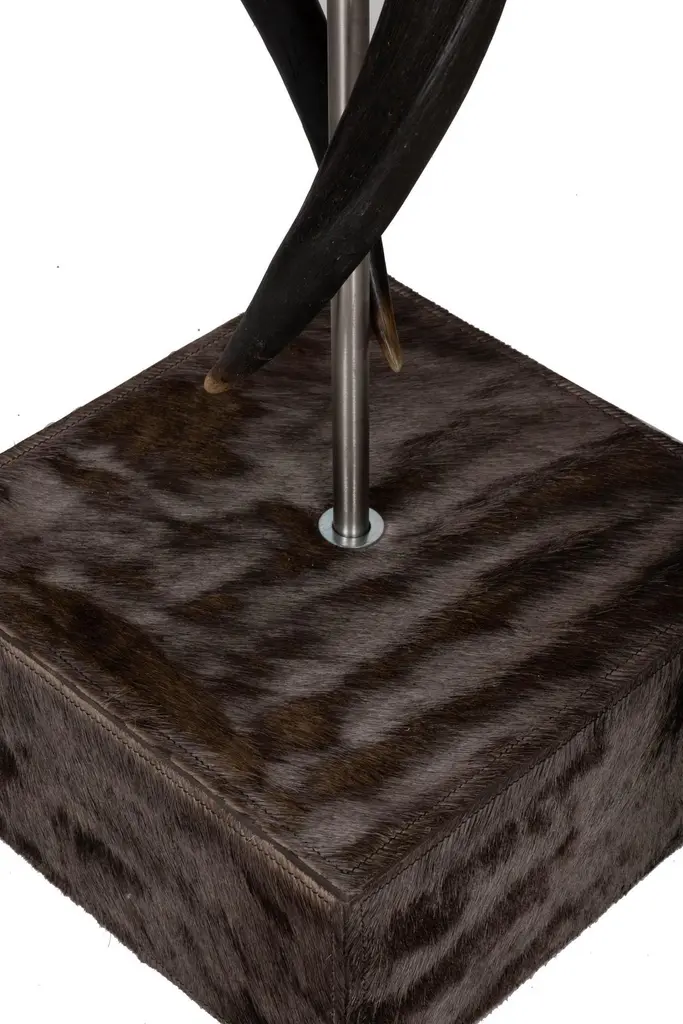 Handcrafted in South Africa, this naturally elegant floor lamp features four intertwined natural African kudu horns that appear to be suspended above a wooden base, which is wrapped in top-stitched wildebeest hide. . All hide and horn has been sustainably sourced as an agricultural byproduct. Due to the use of natural materials, each piece is unique and may vary slightly from image shown.Product informationBulb: 60WDimensions: 80" H x 20" W; base, 12" W - 8" Harp & FinialFinish: Natural Hide / Satin nickelMade of: Antelope Horn / HideMade in: Cape Town, South AfricaIncludes extra-large drum shade in natural Linen fabric - [19" x 20" x 14"].