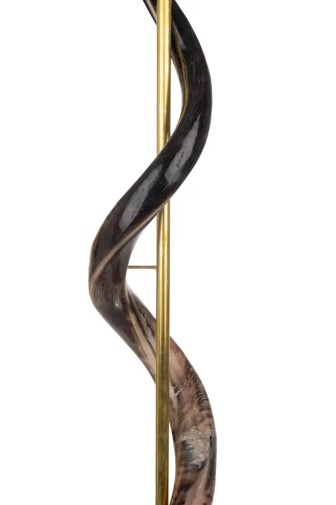 Handcrafted in South Africa, this naturally elegant floor lamp features two inverse African kudu horns encirling a brass rod above a round wooden base, which is wrapped in top-stitched embossed leather. All hide and horn has been sustainably sourced as an agricultural byproduct. Due to the use of natural materials, each piece is unique and may vary slightly from image shown.PRODUCT INFORMATIONBULB: 60W - E26DIMENSIONS: 69"height; base, 14" diameter. - 7" harp & FinialFINISH: brown / brass / naturalMADE OF: Antelope Horn / Embossed Leather / BrassMADE IN: Cape Town, South AfricaIncludes large drum shade in natural linen fabric - [17" x 18" x 12"].