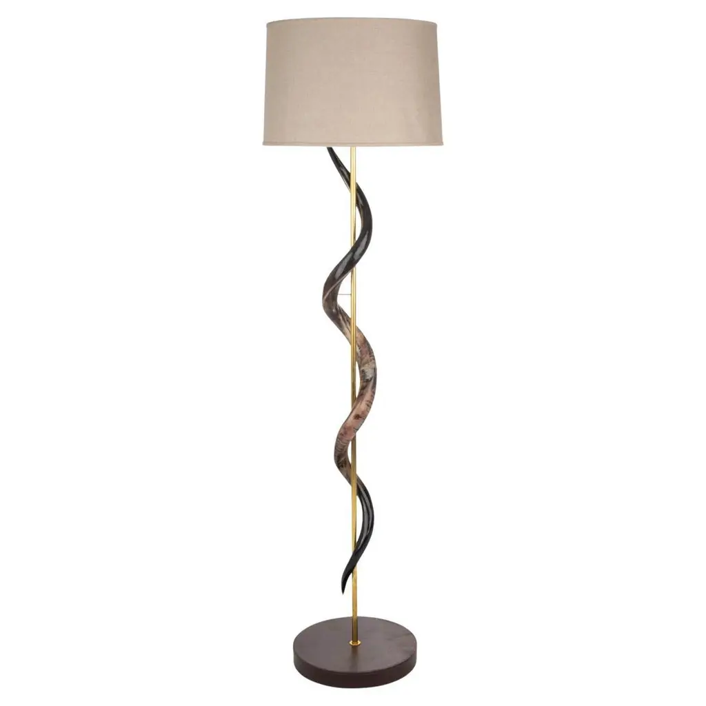 Handcrafted in South Africa, this naturally elegant floor lamp features two inverse African kudu horns encirling a brass rod above a round wooden base, which is wrapped in top-stitched embossed leather. All hide and horn has been sustainably sourced as an agricultural byproduct. Due to the use of natural materials, each piece is unique and may vary slightly from image shown.PRODUCT INFORMATIONBULB: 60W - E26DIMENSIONS: 69"height; base, 14" diameter. - 7" harp & FinialFINISH: brown / brass / naturalMADE OF: Antelope Horn / Embossed Leather / BrassMADE IN: Cape Town, South AfricaIncludes large drum shade in natural linen fabric - [17" x 18" x 12"]
