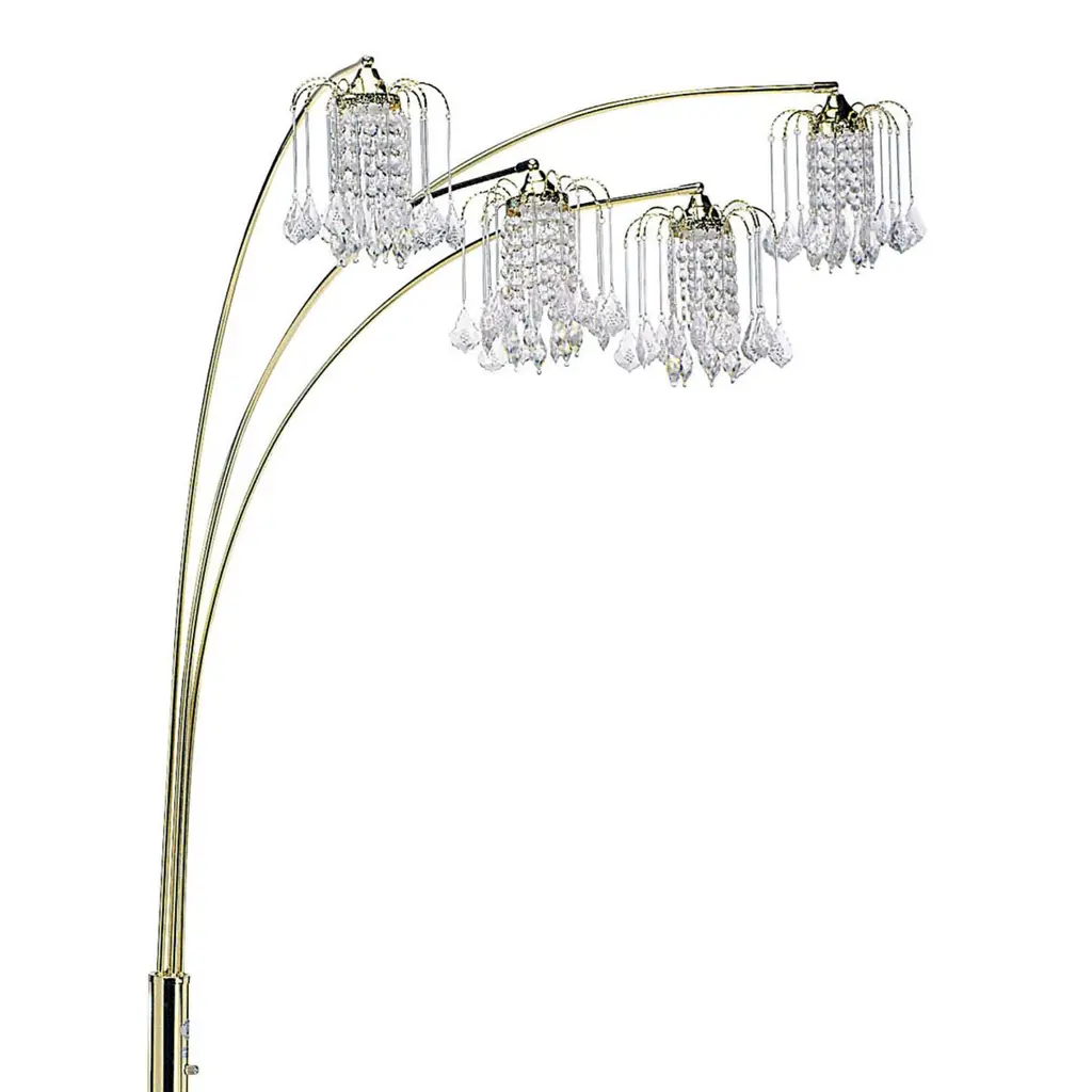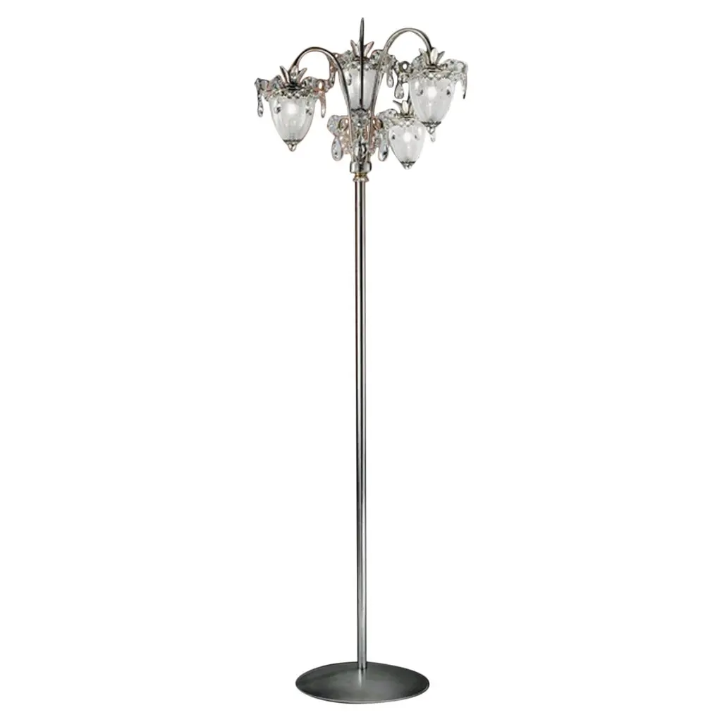 The lavish silhouette of this exquisite floor lamp raises from a circular base in a vertical ramification of curvy metal elements with leaf-like decorations all enriched with gold leaf. The six ES bulbs (G9 max 33W each) cast a warm light from the top of the lamp, with two LED lights (GU10 ad 8W) placed beneath. The cascade of hand-tied glass petals hanging from the metal frame distinguishes the character of this mesmerizing floor lamp.