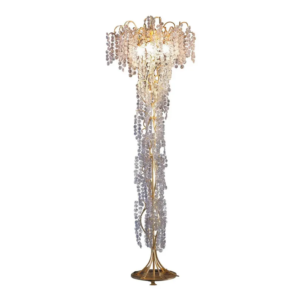 The lavish silhouette of this exquisite floor lamp raises from a circular base in a vertical ramification of curvy metal elements with leaf-like decorations all enriched with gold leaf. The six ES bulbs (G9 max 33W each) cast a warm light from the top of the lamp, with two LED lights (GU10 ad 8W) placed beneath. The cascade of hand-tied glass petals hanging from the metal frame distinguishes the character of this mesmerizing floor lamp