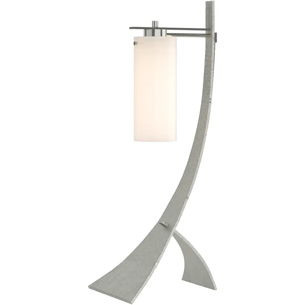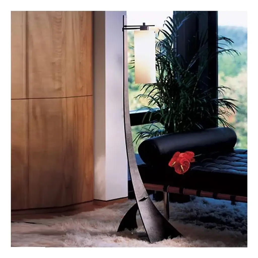 Stasis, meaning inactivity caused by opposing equal forces, is manifested in the Stasis Floor Lamp with Glass from Hubbardton Forge to create a balanced design. Sweeping hand-forged iron tapers upwards holding the glowing opaque lampshade, all while being bolstered by a similarly tapered piece less than a quarter of its size. Incandescent bulbs encased in the beautiful cylindrical lampshade help make for warm ambient lighting. It is an ideal piece when paired with a love seat, sofa, or lounge chair.