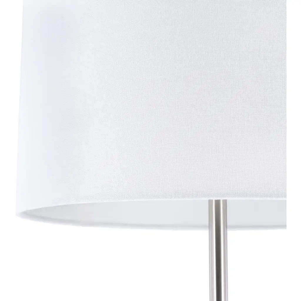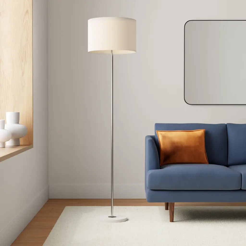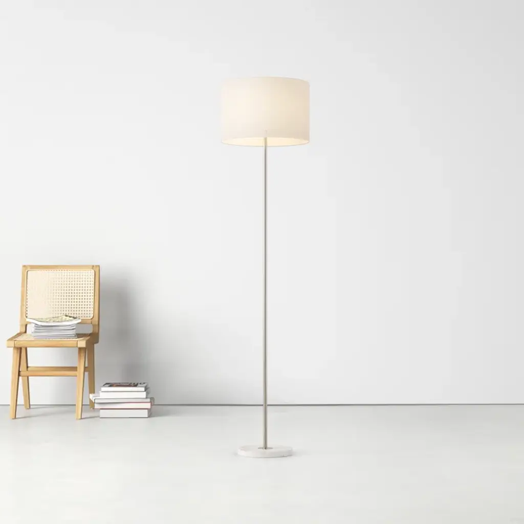 Brighten up in minimal style. This floor lamp leans into its scaled-back design for a sleek look in your space. Crafted with a circular stone-look base and a slim, silver-finished metal arm, this lamp features a sleek, simple silhouette. A white fabric drum shade caps off the top, diffusing the light of the 100W bulb (sold separately). ambiently throughout your space while complementing the minimalist look. This lamp is powered by a 3-way switch.