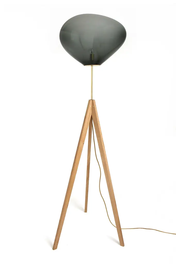 Stati x amber iridescent floor lamp by eloa. No ul listed material: glass, steel, silver, led bulb, brass, walnut,oak. Dimensions: d 62 x w 62 x h 180 cm. Inspired by the stars in design and name, the stati x combines function with a uniquely eccentric style. With its handmade wooden tripod base, featuring finely crafted metal fixings, it carries us off in much the way that a telescope would- showing us a sky of endless possibilities. Off to the side or as a centerpiece, its presence is subtle but always regal. With this hand-blown lamp, you can easily adjust its brightness of mood to your preference. Stati x comes in two wonderful color variations. The amber iridescent version, with its exclusive hand-blown bulb, brings the glow of a sunset into the realm of your personal living space. In silver smoke, this lamp surrounds you with the quietly elegant serenity of moonlight. These heavenly beings have a presence all their own; stabilizing and illuminating. Light objects float weightlessly in space. Fragile, iridescent, timeless. Eloa is a modular lighting system composed of unique handcrafted glass pieces. Select from a variety of hand blown forms, which are one of a kindin shape, size and color - unique. Solitary or in constellation, the eloa lights create individual light concepts and associate with star constellations. Each glass piece is named after a star or a planet. They exist as hanging, floor, standing and wall luminaries. Eloa combines the craft of ancient glassblowing with a simple, yet distinct design. up to 250v (europe/uk standard).