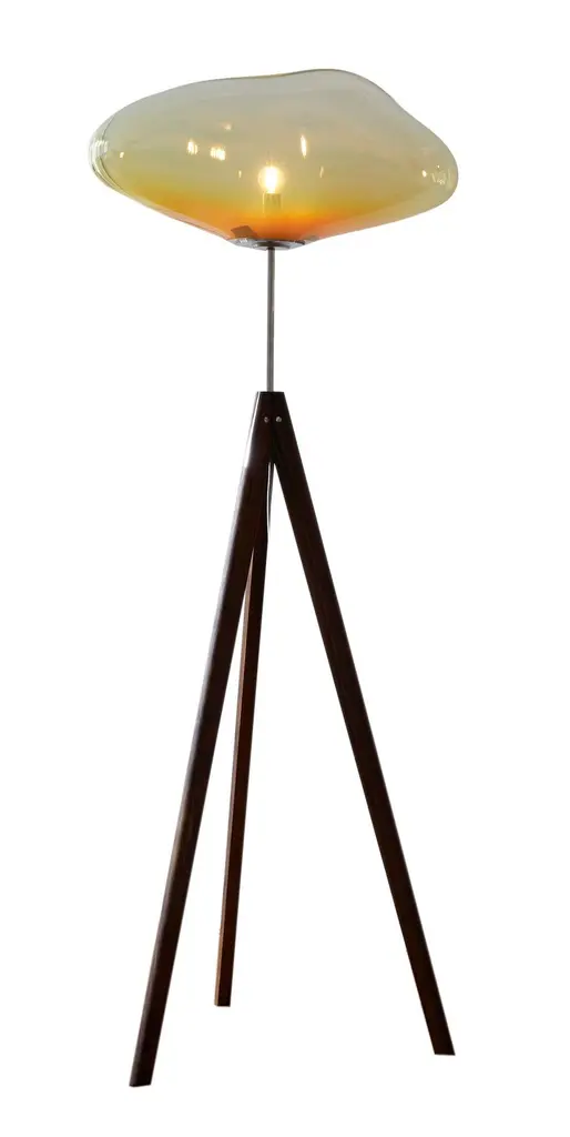 Stati X silver smoke floor lamp by EloaNo UL listed Material: glass, steel, silver, LED bulb, brass, walnut, oakDimensions: D60 x W60 x H160 cmAlso available in different colours and dimensions.All our lamps can be wired according to each country. If sold to the USA it will be wired for the USA for instance.Inspired by the stars in design and name, the STATI X combines function witha uniquely eccentric style. With its handmade wooden tripod base, featuringfinely crafted metal fixings, it carries us off in much the way that a telescope would- showing us a sky of endless possibilities. Off to the side or as a centerpiece, its presence is subtle but always regal. With this hand-blown lamp, you can easily adjust its brightness of mood to your preference. STATI X comes in two wonderful color variations. The Amber Iridescent version, with its exclusive hand-blown bulb, brings the glow of a sunset into the realm of your personal living space. In Silver Smoke, this lamp surrounds you with the quietly elegant serenity of moonlight.These heavenly beings have a presence all their own; stabilizing and illuminating.Light objects float weightlessly in space. Fragile, iridescent, timeless. ELOA is amodular lighting system composed of unique handcrafted glass pieces. Select from a variety of hand-blown forms, which are one of a kindin shape, size andcolor - unique.Solitary or in constellation, the ELOA lights create individual light concepts andassociate with star constellations. Each glass piece is named after a star or a planet.They exist as hanging, floor, standing and wall luminaries.ELOA combines the craft of ancient glassblowing with a simple, yet distinct design.In order to achieve the large size of the glass objects and working without forms, it takes a high level of refined craftsmanship and skill performed by only a few master glassblowers.