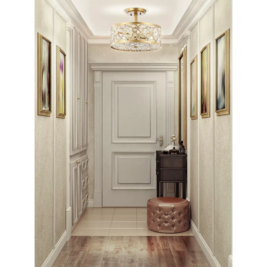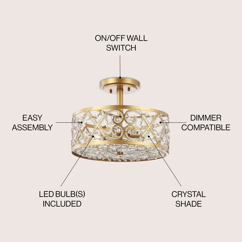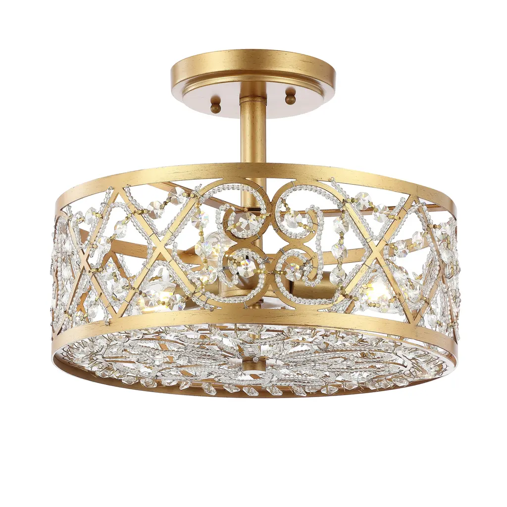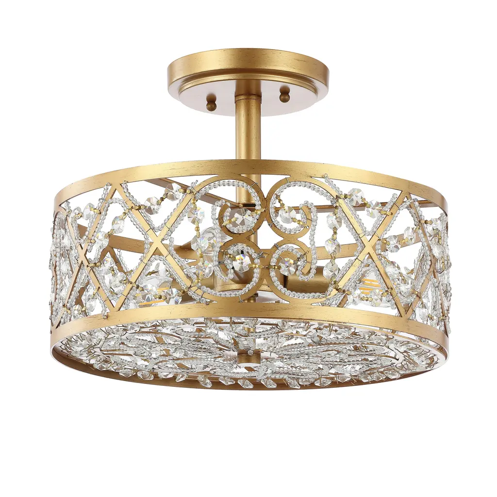 Add drama and sparkle to your ceiling with our modern, feminine semi-flush light fixture. Crystal beads define the scrolls of a gold filigree metal drum shade. This light fixture is a glamorous addition to your hallway, bedroom or bathroom. Three dimmable LED bulbs provide plenty of light.Features:Dimensions:About us:You see a lamp.We see a decorative work of art.A perfectly curved shade casts a dramatic shadow on a floor. Compatible with LED lightbulbs: as easy on the environment as they are on the eyes. The JONATHAN Y Lighting collection considers every detail from impeccably sourced materials to designer styling. And our prices are so attractive, we've transformed a functional necessity into a fashion accessory.JONATHAN Y Lighting - a fashion revolution in home decor.