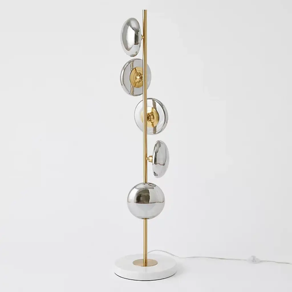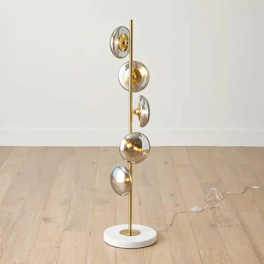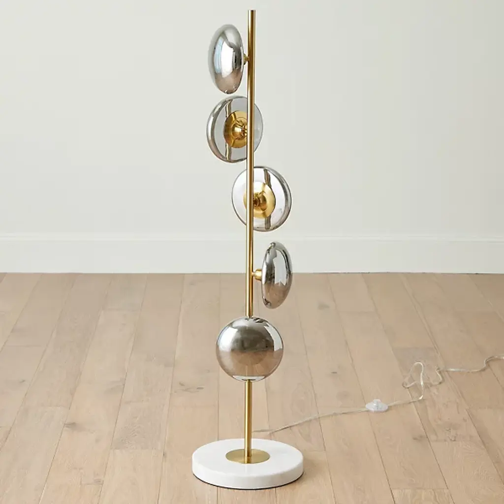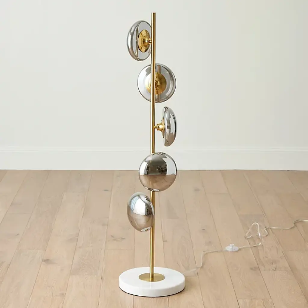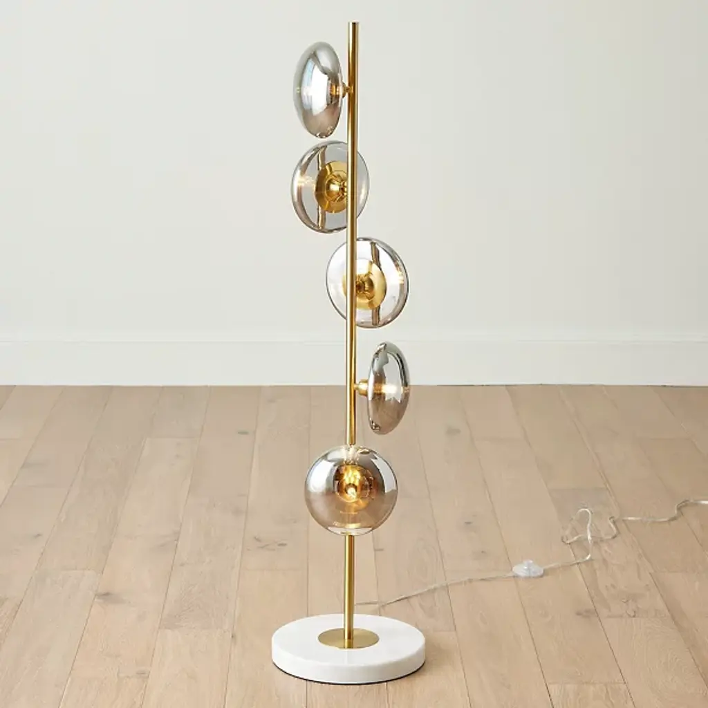 The Stellar Floor Lamp from Global Views offers slim, artistic elegance to larger living spaces. A circular marble base anchors a tall, slender metal stem studded with small lamps, which ascends with graceful simplicity. Dome-shaped shades made of smoke-textured glass surround each lamp and gently filter the light within, diffusing a soft, ambient glow. The combination of polished metal, rich marble, and darker glass creates a refined character able to cast bright light in dark corners, creating an unforgettable accent beside seating, sofas, and more.