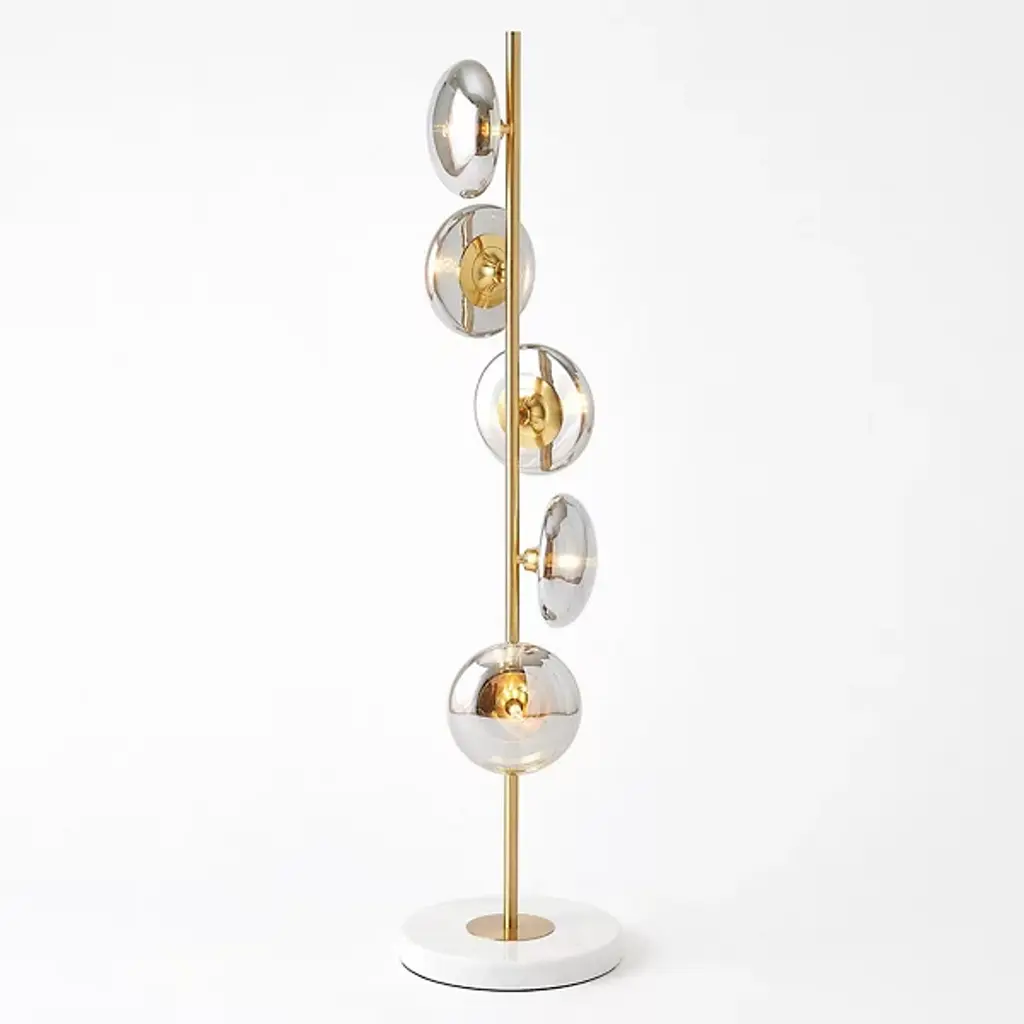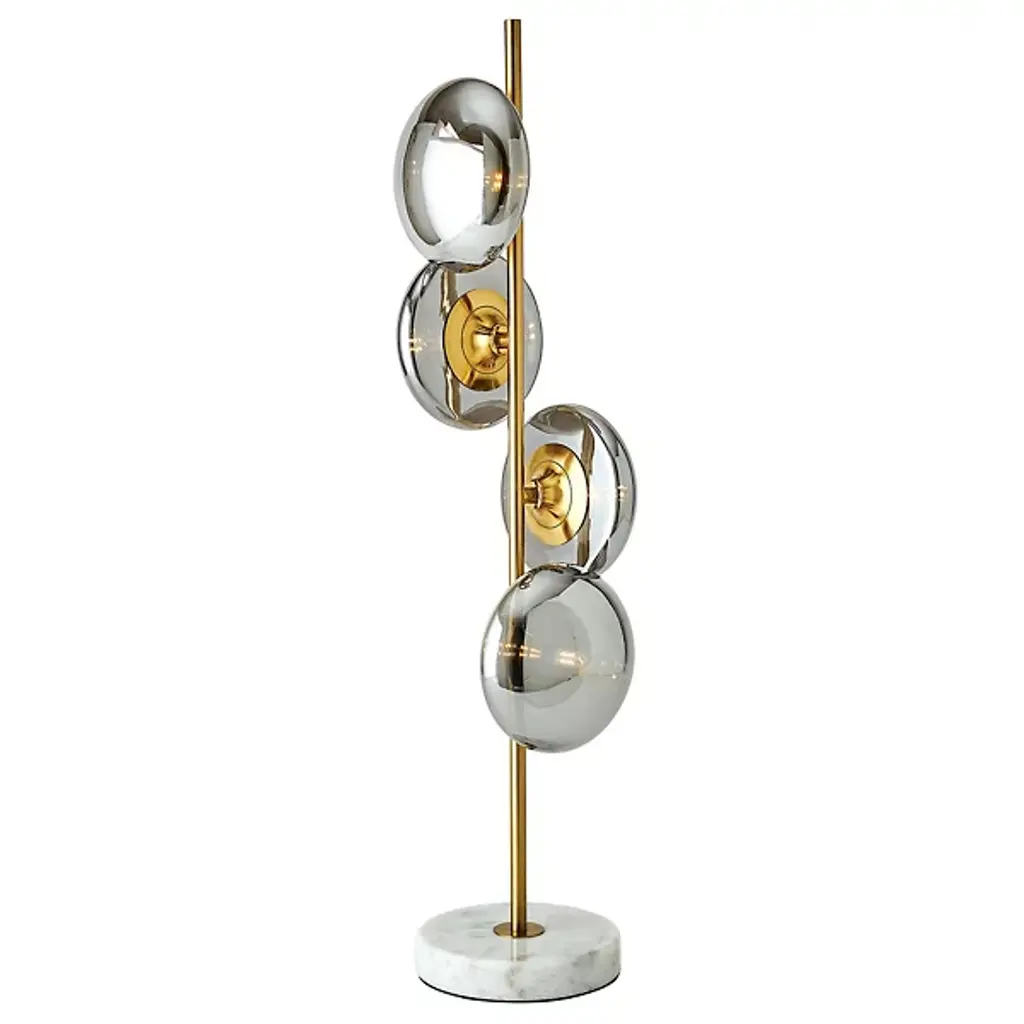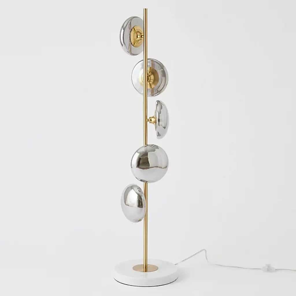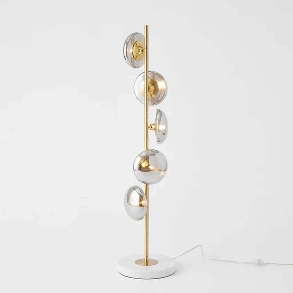 The Stellar Floor Lamp from Global Views offers slim, artistic elegance to larger living spaces. A circular marble base anchors a tall, slender metal stem studded with small lamps, which ascends with graceful simplicity. Dome-shaped shades made of smoke-textured glass surround each lamp and gently filter the light within, diffusing a soft, ambient glow. The combination of polished metal, rich marble, and darker glass creates a refined character able to cast bright light in dark corners, creating an unforgettable accent beside seating, sofas, and more.
