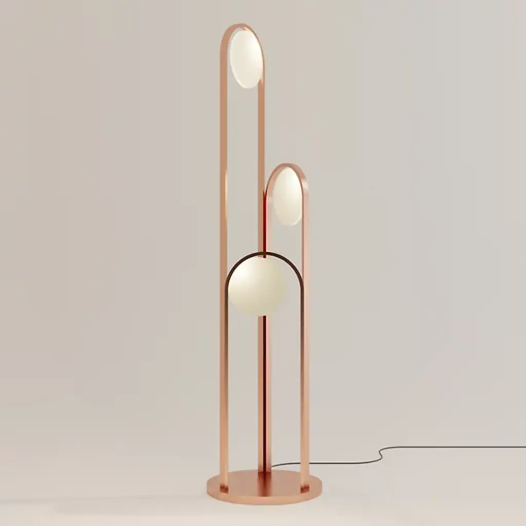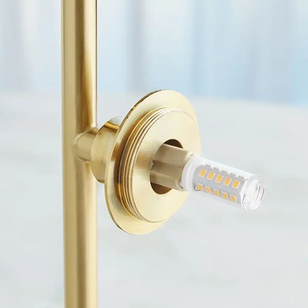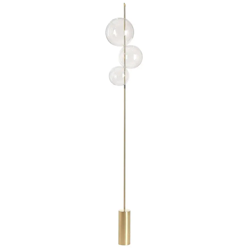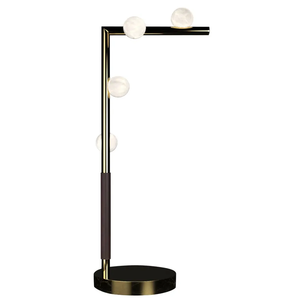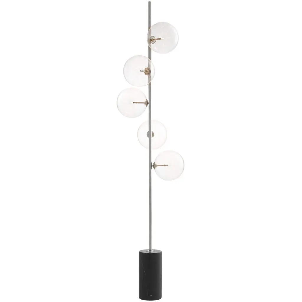 The Stellar Floor Lamp from Global Views offers slim, artistic elegance to larger living spaces. A circular marble base anchors a tall, slender metal stem studded with small lamps, which ascends with graceful simplicity. Dome-shaped shades made of smoke-textured glass surround each lamp and gently filter the light within, diffusing a soft, ambient glow. The combination of polished metal, rich marble, and darker glass creates a refined character able to cast bright light in dark corners, creating an unforgettable accent beside seating, sofas, and more.