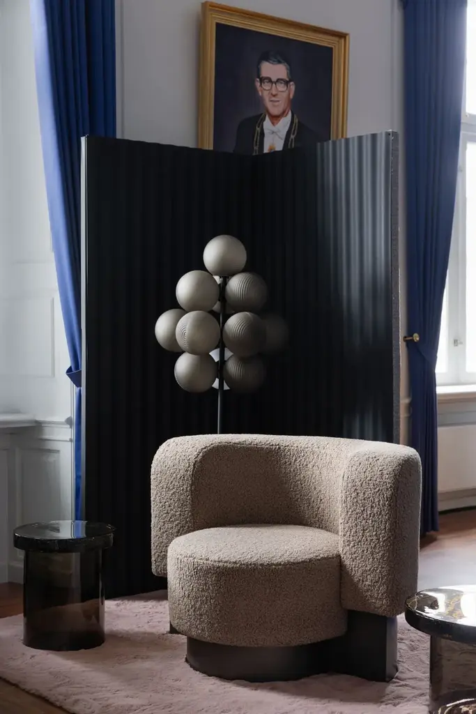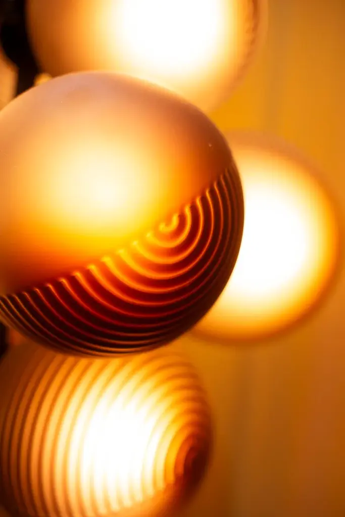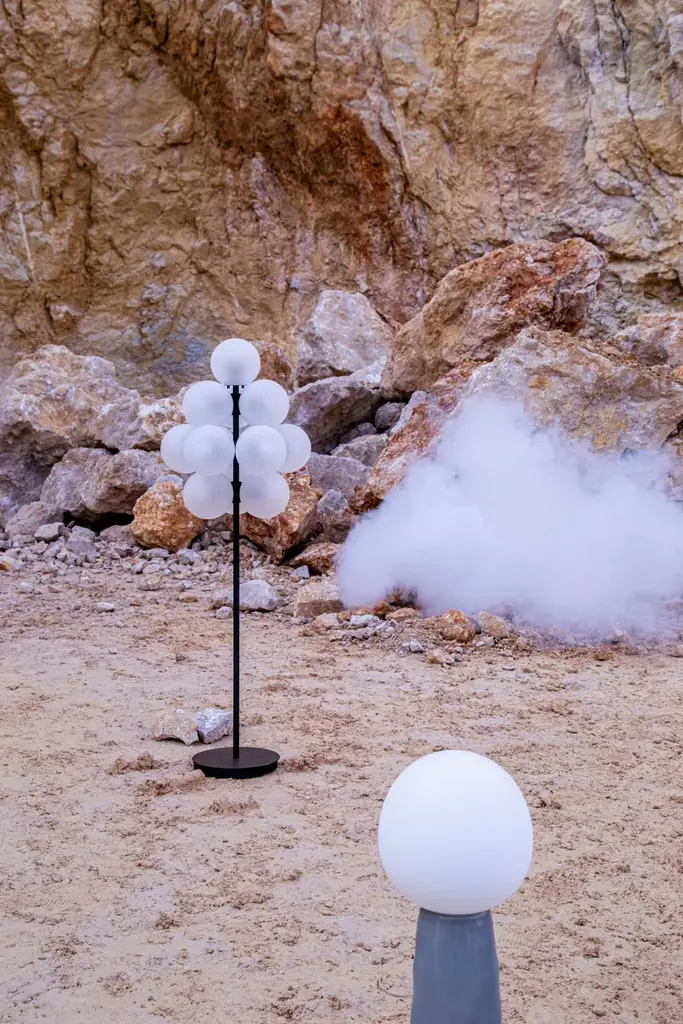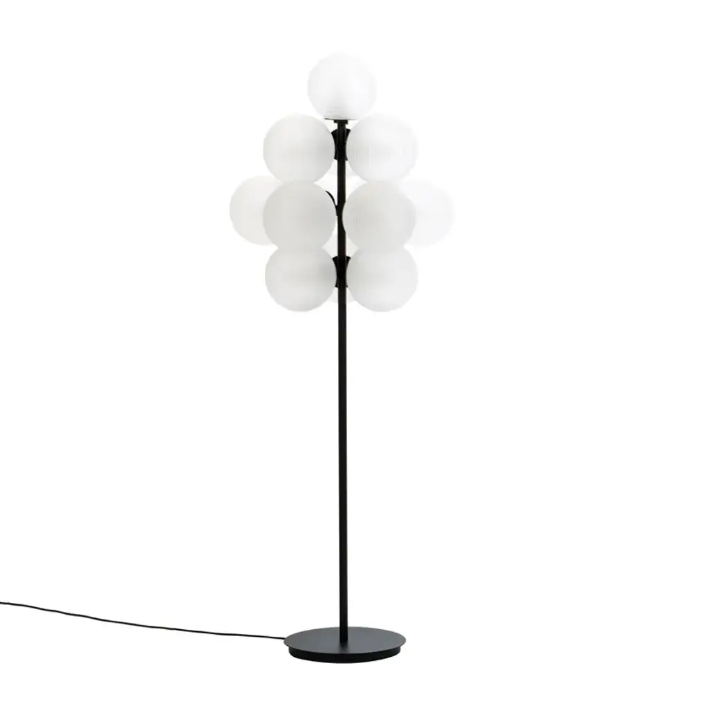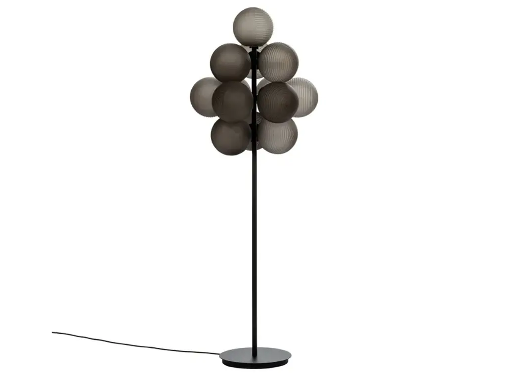 stellar grape big: Raised up above the clouds on a simple black powder coated steel base, the stellar grape big floor lamp will shine across your interior universe. A grouping of star-like spheres mixes frosted acetate illumination with a textured ripple. These handblown glass spheres offer the perfect mix of elegance and mystery for the rest of your interior to orbit.Each piece is created from handblown glass with a frosted acetate finish to one side. Bubbles, streaks and other variations in size and colour are part of the production process. The stand and base are produced from black powder coated steel.