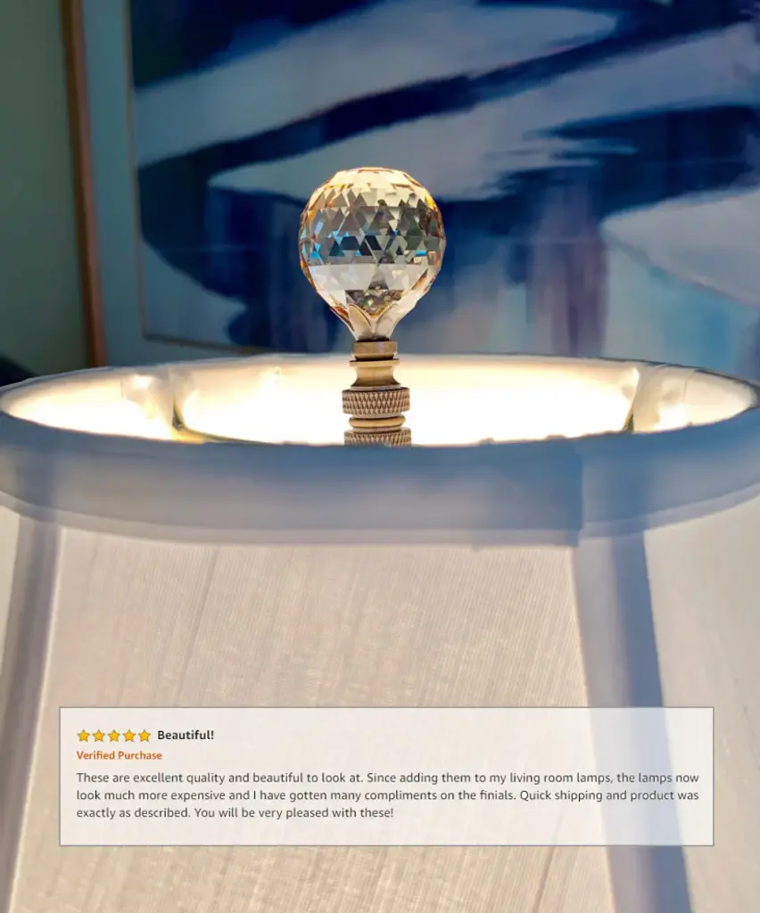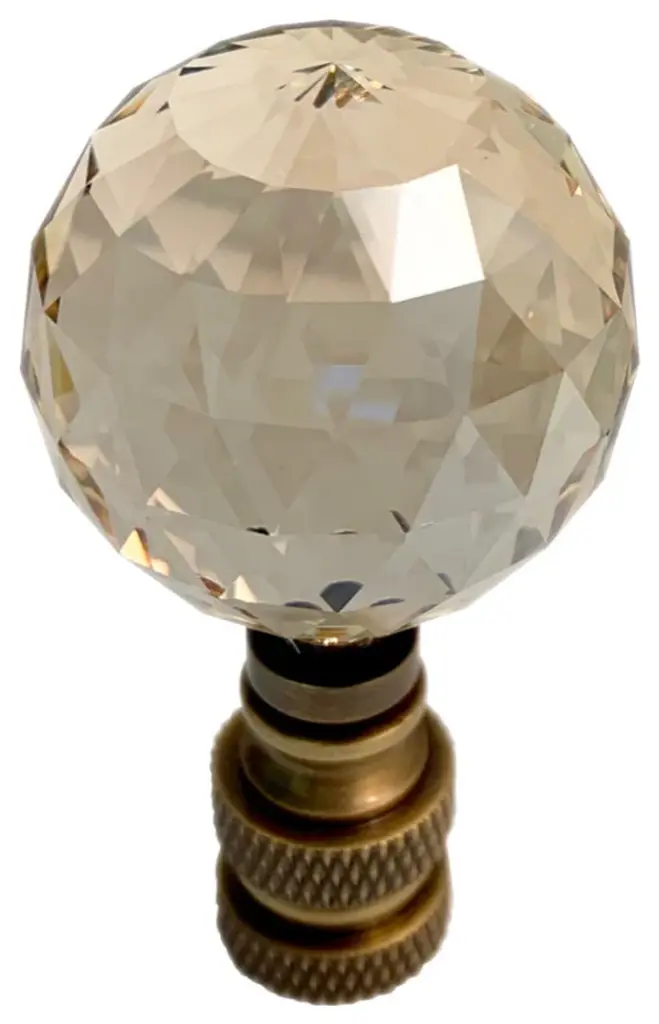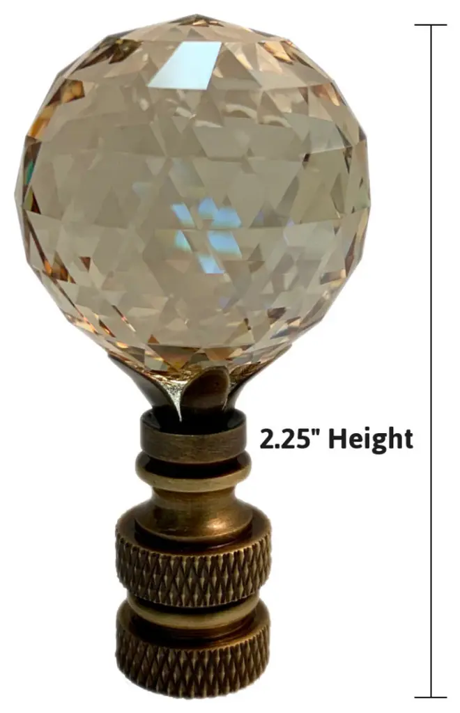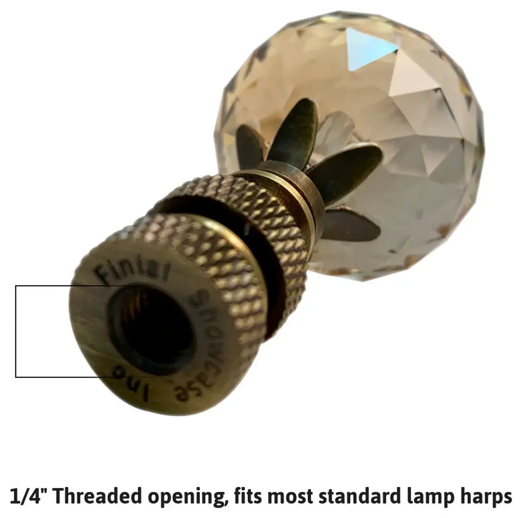A new lamp finial is the perfect way to complete your new or favorite lamp. Quality finial that is sure to dress up your tired lamp. Finials have a standard 1/4"-27 thread, which will fit the harp on almost every lamp. (This means the opening is 1/4" wide and there are 27 threads per inch.) 95% of all lamp harps will fit this finial. Finial measures 2 " Height and 1.25" width. Material: Genuine Stephanov Crystal with Antique Brass Base.STEPANOV CRYSTAL - Multi-Faceted Ball SHAPE - 1.25" width medium sized multi Faceted spherical lamp finial. "Champagne Crystal" has a Dusty rose hue. A perfect Accent to top off your table or floor lampANTIQUE BRASS FINISH - Antique brass will most lamps and room decor.PERFECT SIZE - Proportional sized to fit most standard table or floor lamps. Finial measures 2 " Height and 1.25" width. Threaded at 1/4" wide opening, threaded for standard 27 threads per inch.FUNCTIONAL - Secures your lampshade to standard table or floor lamp.EASY TO USE - Easily screws on/off. Fits standard lamp harps that measure 1/4" wide with 27 threads per inch.