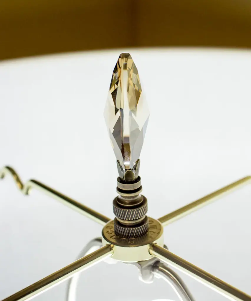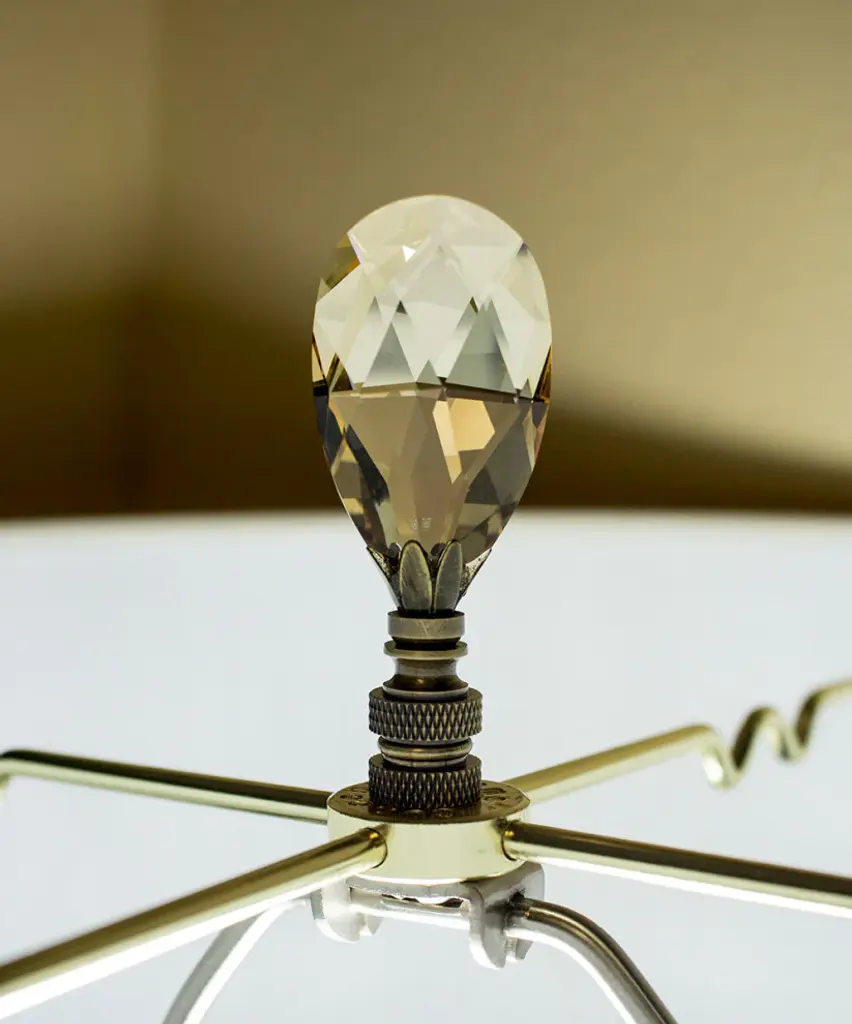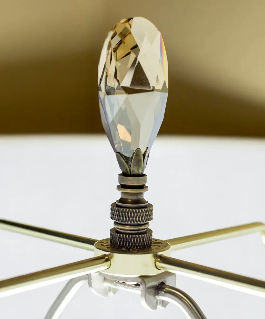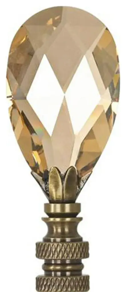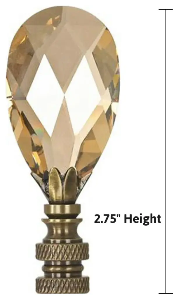 A new lamp finial is the perfect way to complete your new or favorite lamp. Quality finial that is sure to dress up your tired lamp. Finials have a standard 1/4"-27 thread, which will fit the harp on almost every lamp. (This means the opening is 1/4" wide and there are 27 threads per inch.) 95% of all lamp harps will fit this finial. Finial measures 2.5" Height and 1.2" width. Material: Genuine Stephanov Crystal with Antique Brass Base.Large Teardrop SHAPE - 1.2" width, 2.75" high Large Teardrop lamp finial. A perfect accent to top off your table or floor lamp.GENUINE STEPANOV CRYSTAL -Champagne Crystal is a dusty rose hue with multi-facets.PERFECT SIZE - Proportional sized to fit most standard table or floor lamps. Finial measures 2 Height and .8" width. Threaded at 1/4" wide opening, threaded for standard 27 threads per inch.FUNCTIONAL - Secures your lampshade to standard table or floor lamp.EASY TO USE - Easily screws on/off. Fits standard lamp harps that measure 1/4" wide with 27 threads per inch.