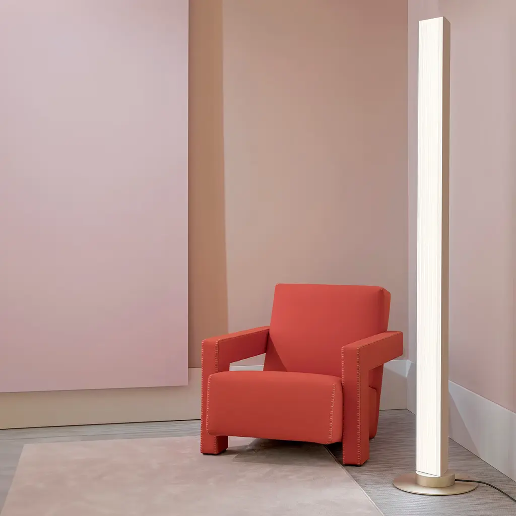 Straightforward and refined in its streamlined silhouette, this floor lamp makes for a superb mate for armchairs and chaise longues in refined contemporary settings. A subtle sheen owed to the satin golden finish embellishes the bar-like nickel structure, which also incorporates a ridged Plexiglas diffuser along one of its sides for a neat light output.