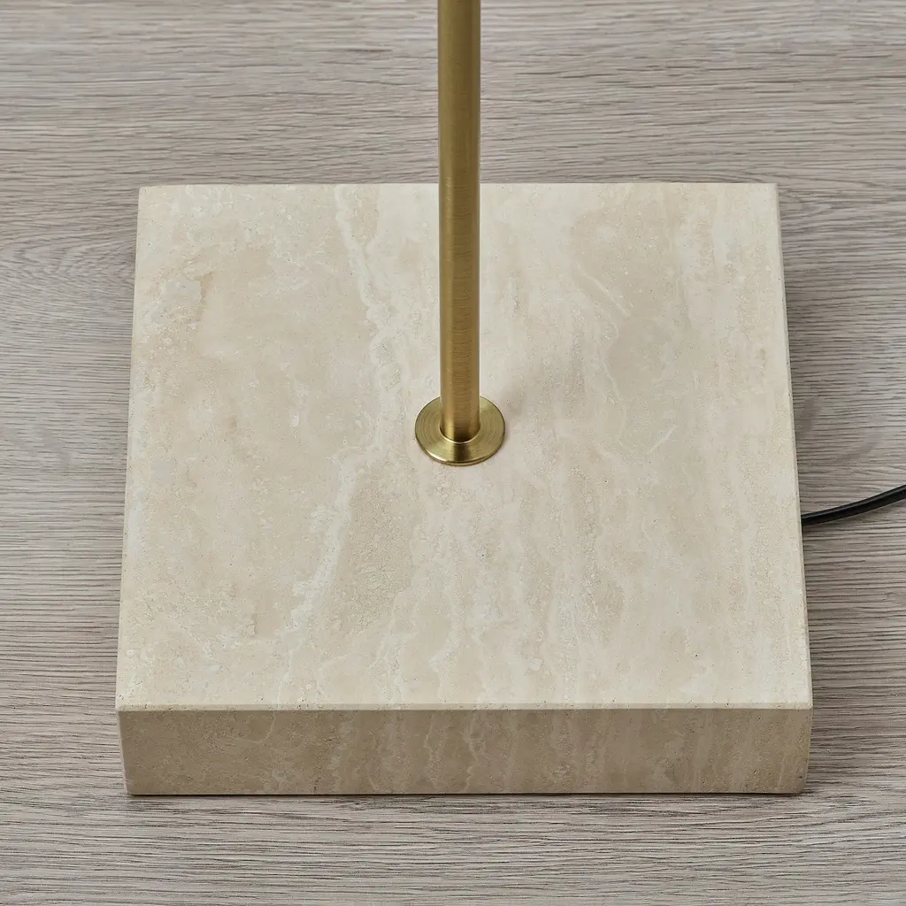 STOCKHOLM 2025 Floor lamp - white textile/brass plated 63 ". Fabric shade gives a diffused and decorative light. The lamp base is made of a natural stone called travertine, which gives it a unique expression with natural variations. The lamp stands stable thanks to the heavy stone base.