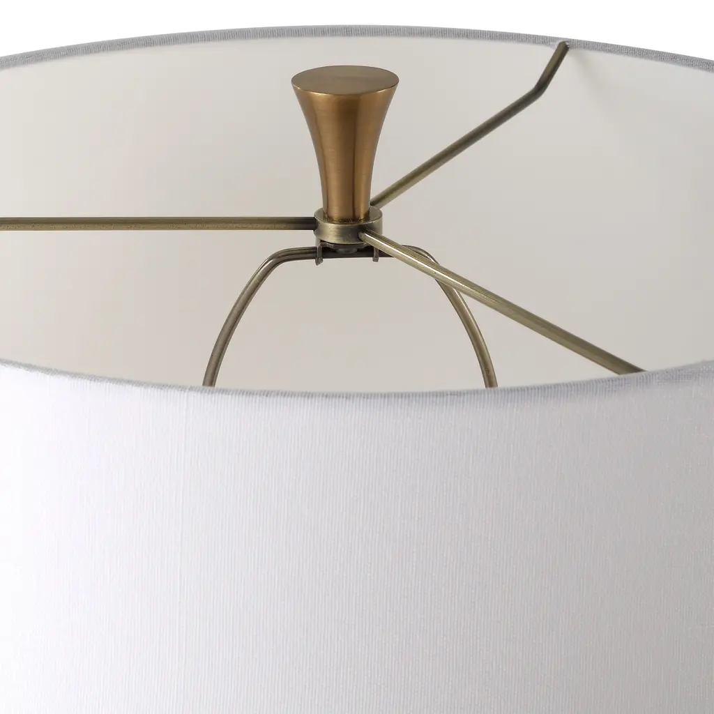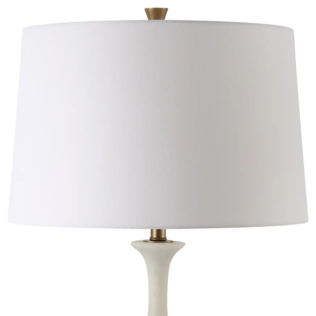 This floor lamp adds an air of elegance and sophistication to any space. The base replicates the look of Thasos marble, accented by plated antique brass details, and is displayed on a crystal foot. Topped with a tapered round hardback shade covered in white linen fabric, this lamp seamlessly blends classic charm with contemporary style, enhancing any room with its refined design. Product Features: Decorative floor lamp with white shade Lamp features a crystal foot base Solid iron details finished in plated antique brass Tapered round hardback shade Recommended for indoor use only Additional Features: Wattage: 150W Bulb type: type A Socket type: 3-Way Dimensions: Overall dimension: 69" high Shade dimension: 12" high x 17" diameter Material(s): iron/crystal/rice stone/linen fabric