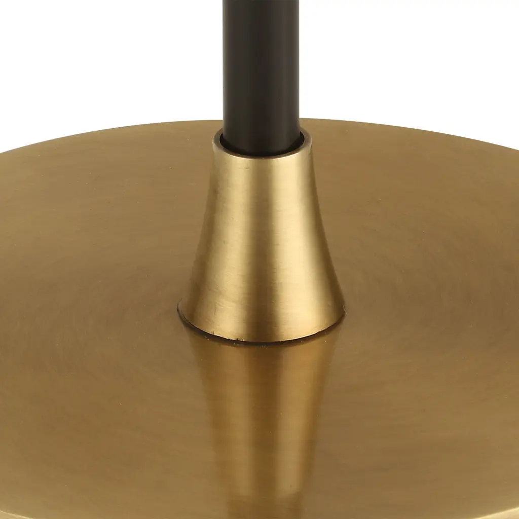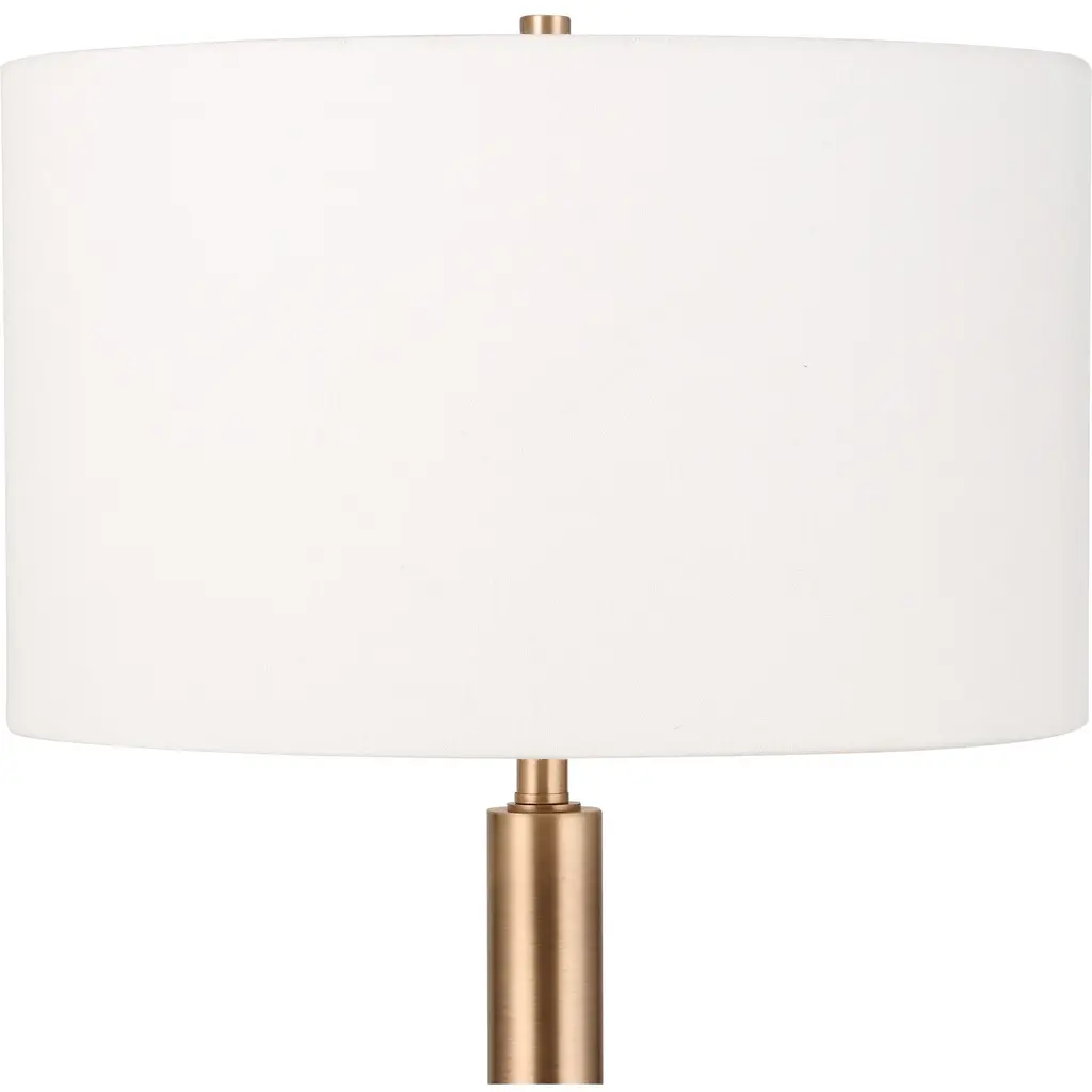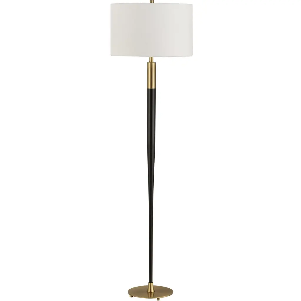 The Stowe Floor Lamp Features A Tapered Metal Stem Finished In A Sleek Satin Black, Accented With Brass Plated Details. The Round Hardback Drum Shade Is Covered In A Crisp White Linen Fabric.