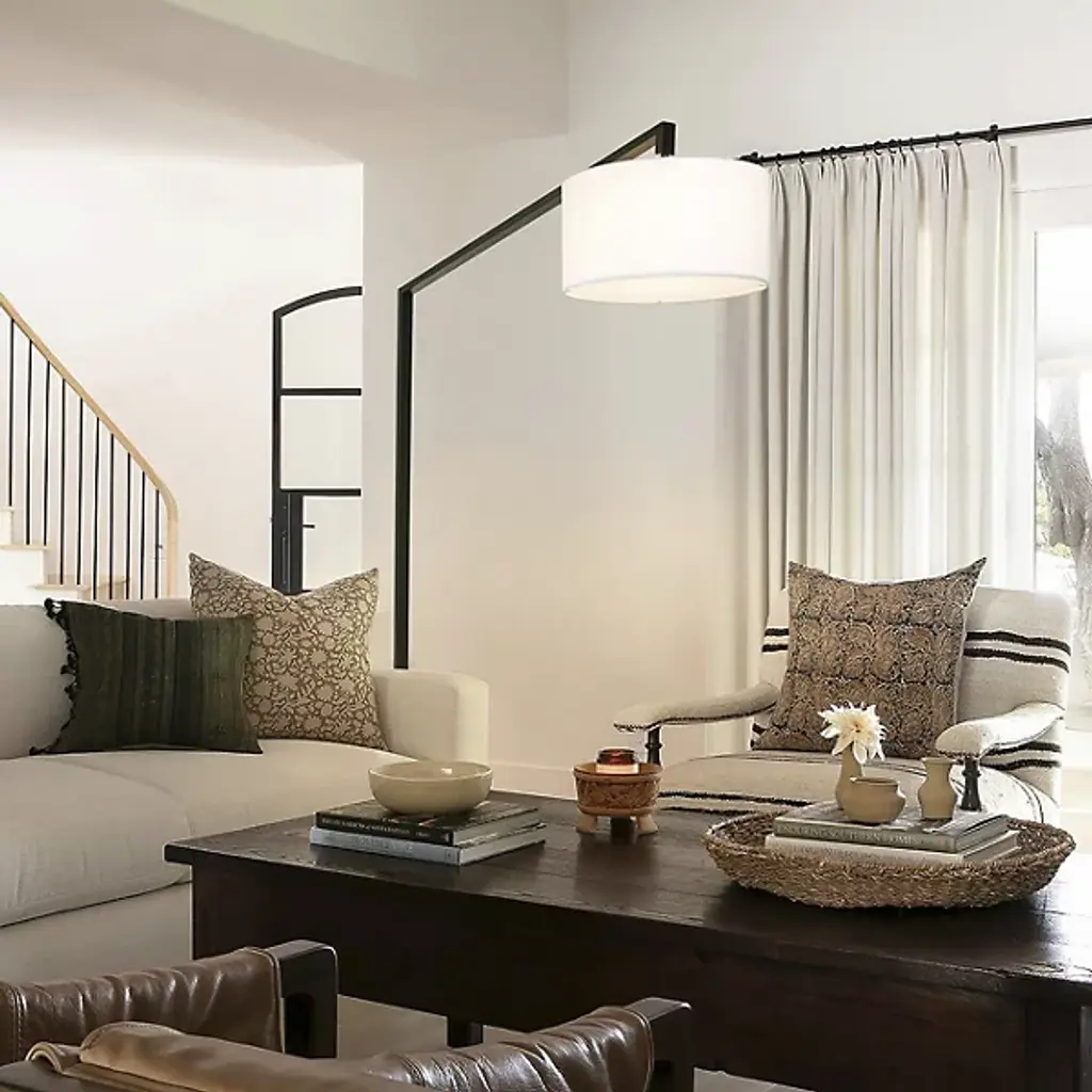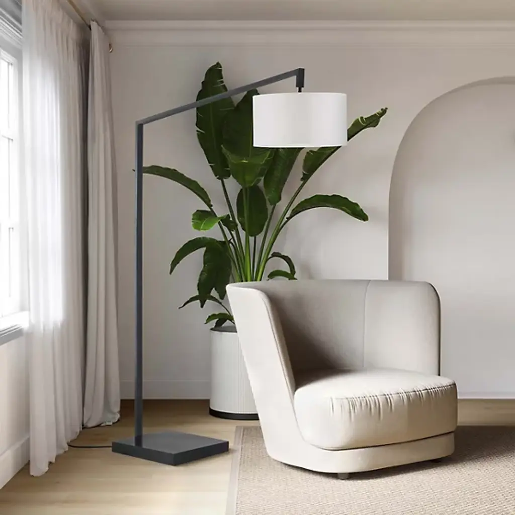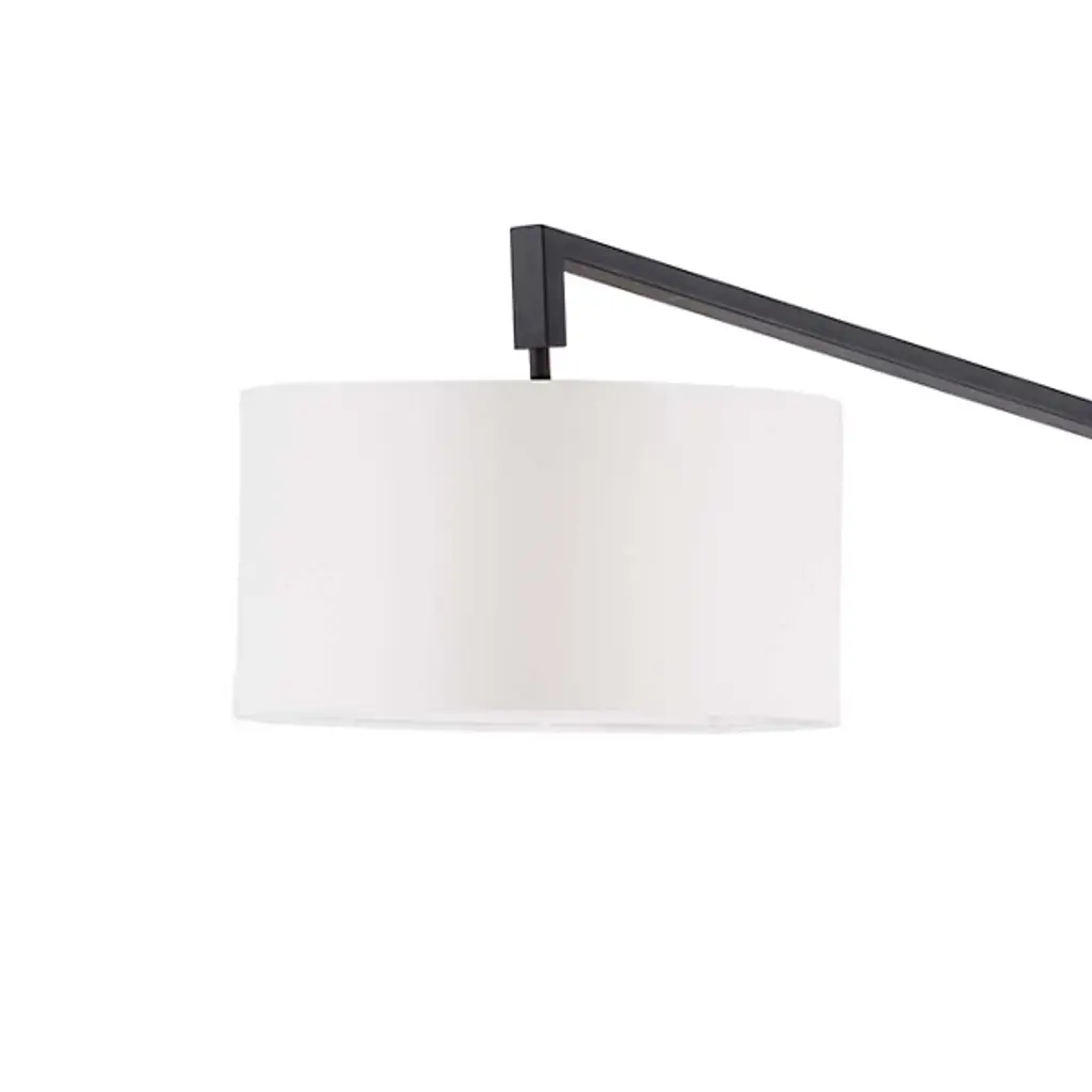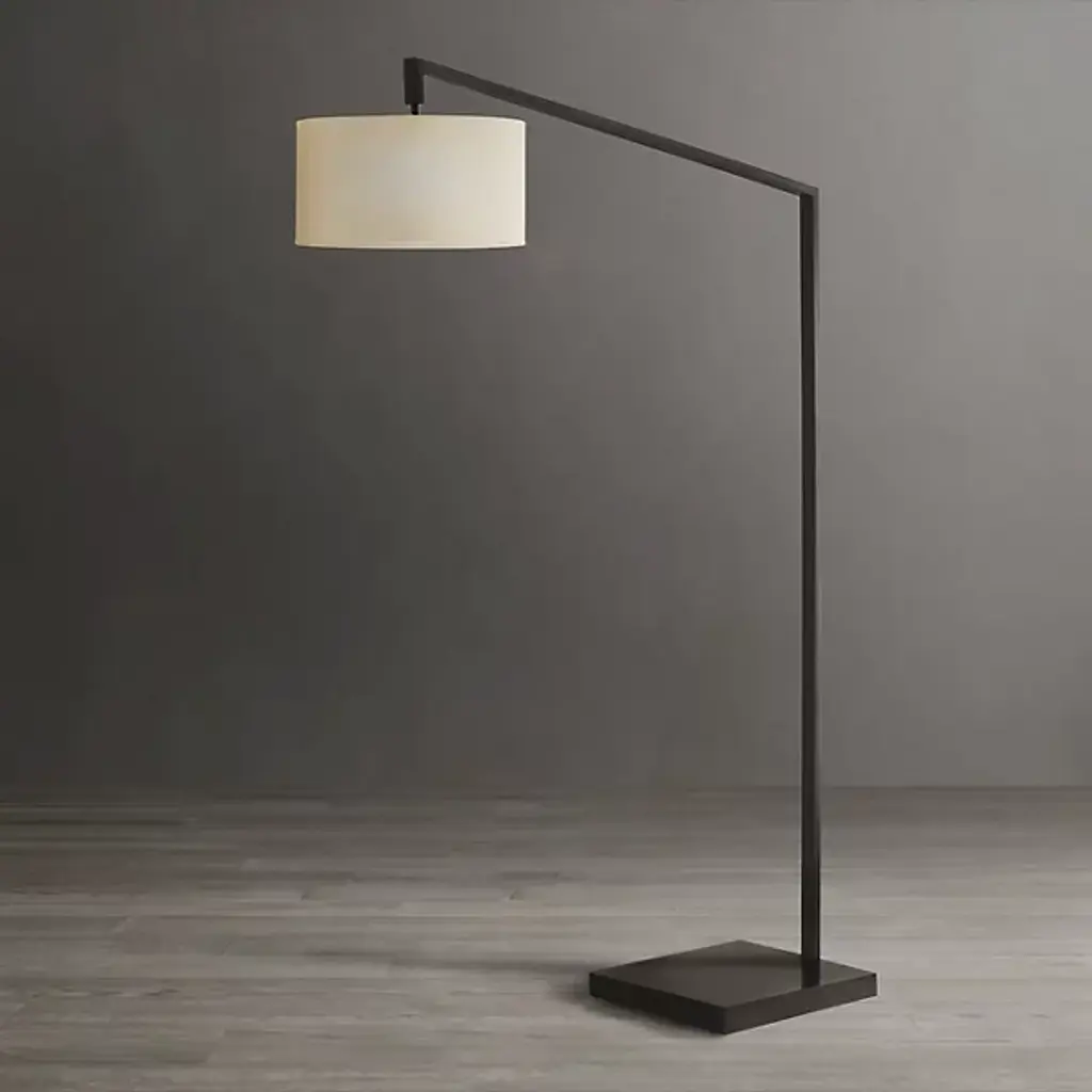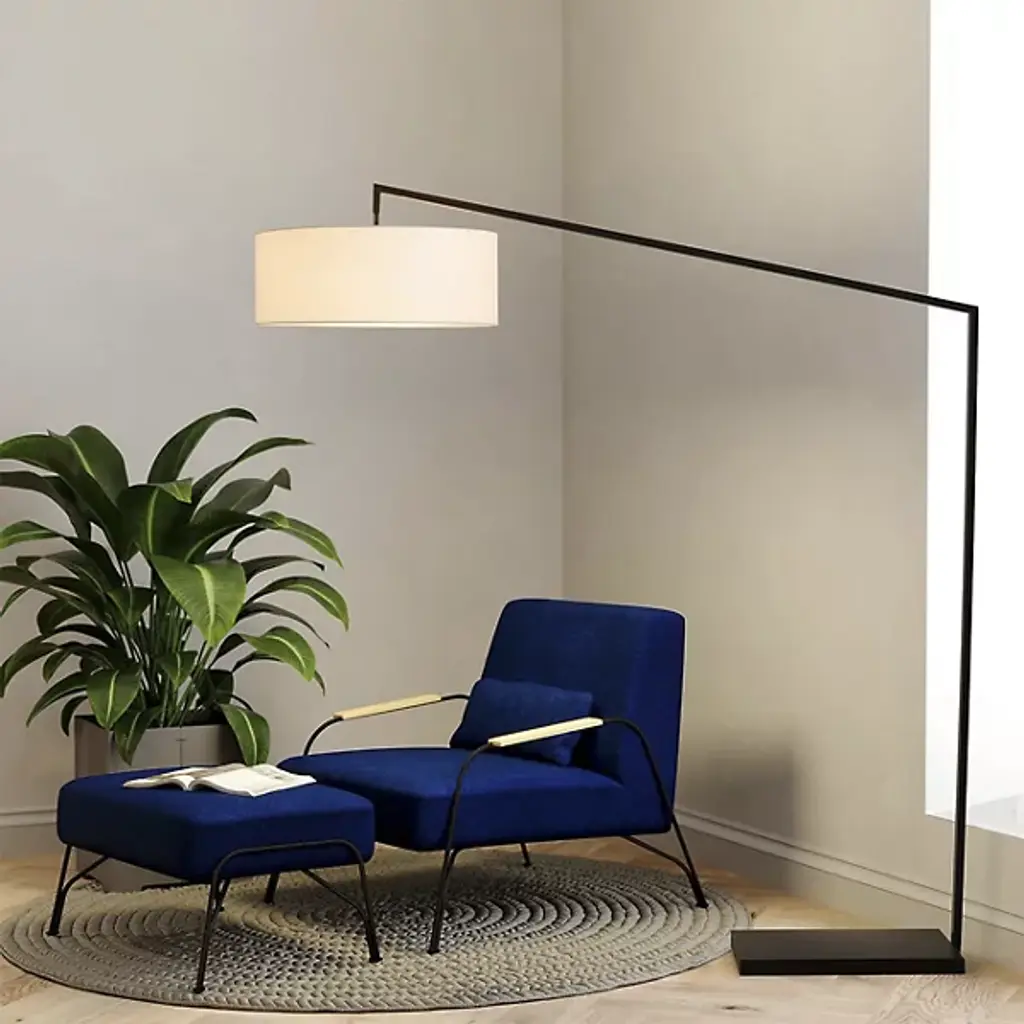 The Stretch Arc Floor Lamp by Nova of California is a bold, modern way to bring an additional layer of overhead lighting to sitting spaces. Anchored by a square base, an offset stem reaches up, angling to suspend a drum-shaped linen shade. The shade both softens the crisp, geometric lines used in this floor lamp as well as the light it filters onto surroundings. A step-switch makes turning this handsome design on and off convenient, so it is simple to brighten up a room.