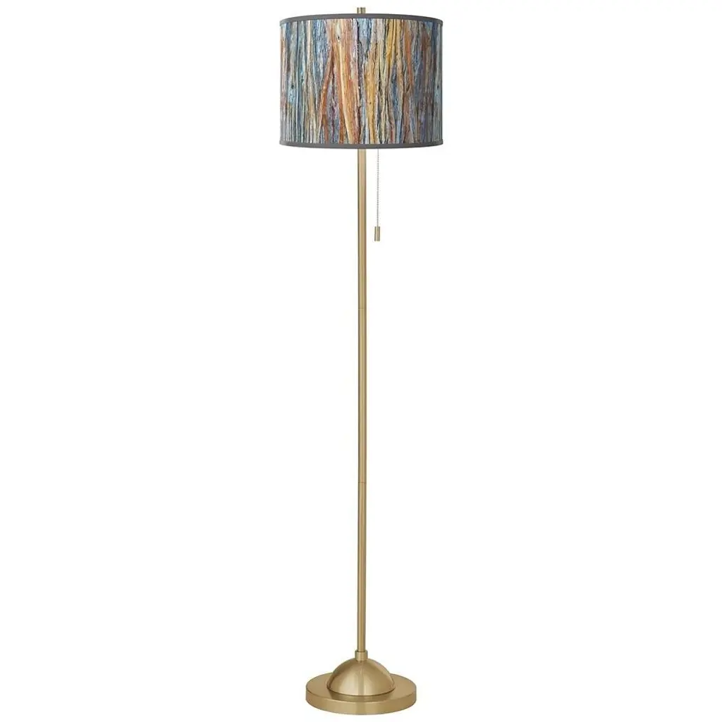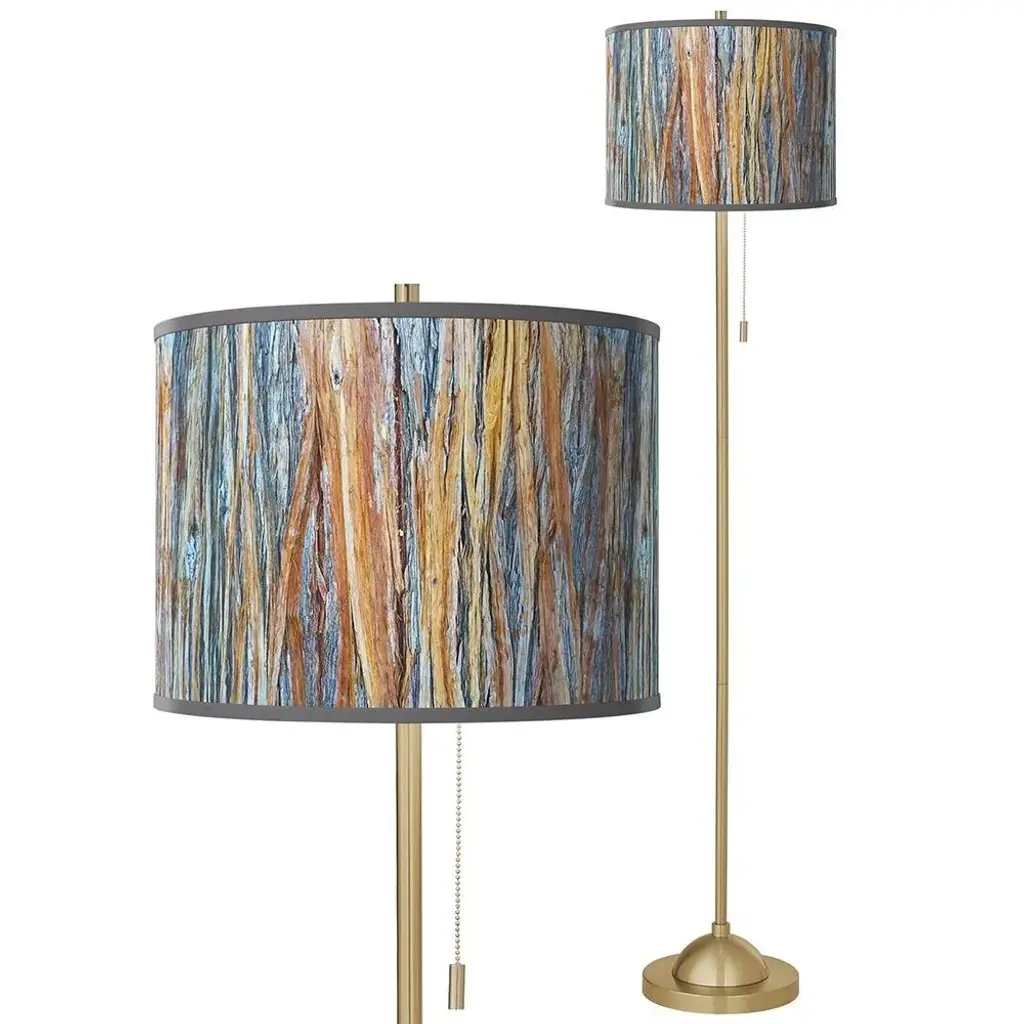 PRODUCT DETAILS: 62" high overall. Drum shade is 13 1/2" wide across the top and bottom x 10" high. Base is 10" wide x 1 1/4" high. Weighs 12 lbs. Uses one maximum 100 watt standard-medium base light bulb (not included). On-off pull chain for easy lighting control. Stick floor lamp from the Giclee Glow brand. Custom printed Striking Bark pattern lamp shade. Note that the shade has a printed pattern on canvas and does not use real wood material. Shade printing process U.S. Patent # 7,347,593. Warm gold finish. Metal construction. 8-foot long cord. DESCRIPTION: Brighten your home with this modern style stick floor lamp. It features a warm gold finish and is topped by a classic drum shade for a clean look. The shade has an exclusive Striking Bark pattern and is giclee printed and made to order. An on-off pull chain switch allows for easy lighting control.