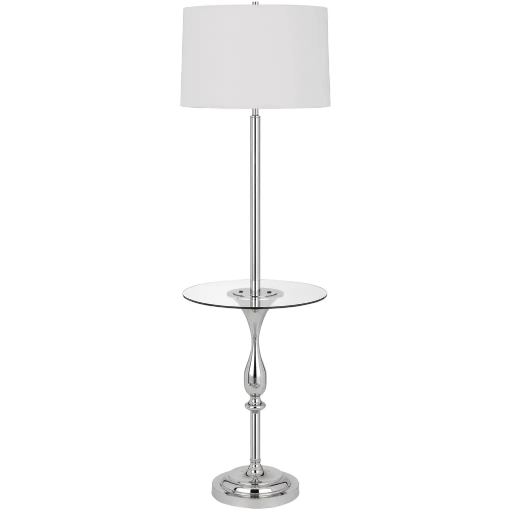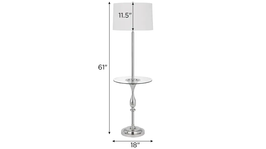Brighten up your space with this stylish Sturgis Floor Lamp. It features a high gloss chrome finish with a fully functional center glass table with USB entry ports. With its clean and modern aesthetic, this lamp is sure to be a great addition next to your favorite chair or sofa.