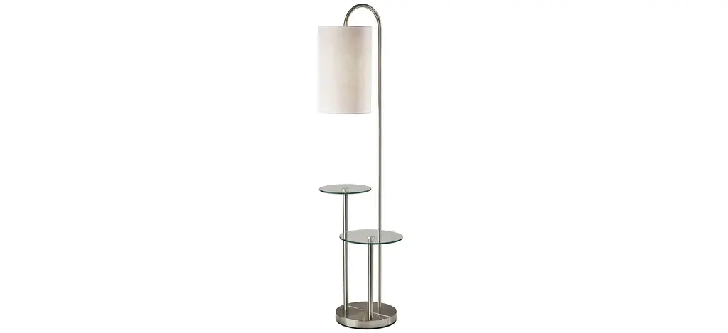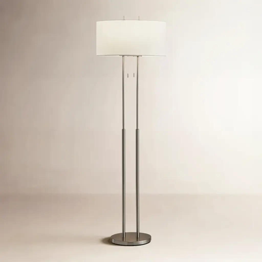StyleCraft's Brushed Steel Floor Lamp features a contemporary double curve shape with matching patterned shades. Place this modern steel and linen floor lamp in the living room, bedroom, or dining area for an attractive polished look.This mid century modern floor lamp has a classic "S" shaped neck that turns one regular lamp into double the use.The pattern is simplistic with its grey and white combo which compliment the polished silver metal accents.The foot switch is located on the cord for ease of use and to preserve the overall sleek design.Due to the production process, each lamp will have a different finish and unique overall design - especially any glazed, painted, and oil rubbed designs.Material: 80% Steel, 20% LinenWeight: 12.54 poundsSwitch Type: On/OffSwitch Location: On CordSystem Type: Plug-InBattery Details: No BatteriesSocket Quantity: 2Bulb Shape: A19Socket Type: E26Voltage: 120VFixture Dimmable: No