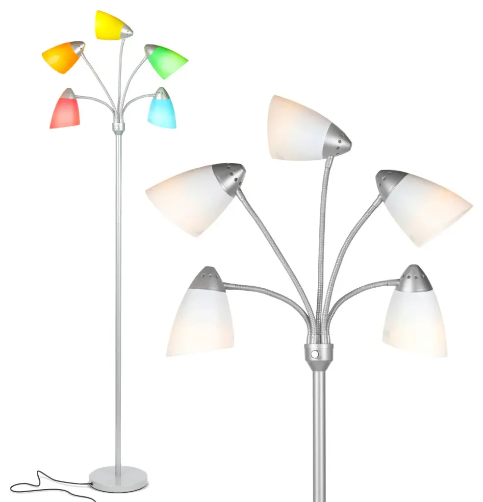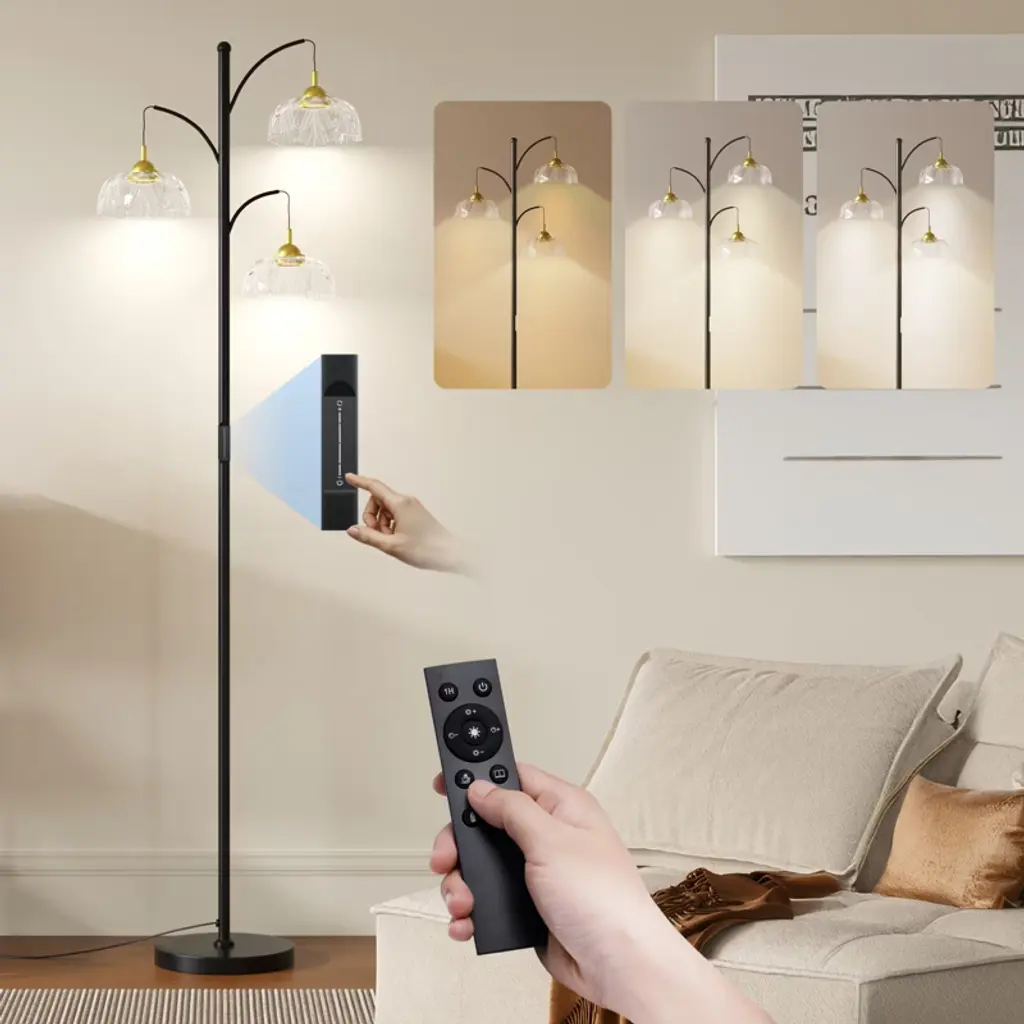 Bring elegance and modern convenience into your home with this 3-Light LED Flower Floor Lamp. Designed with unique petal-shaped glass shades and sturdy black support, it blends artistic style with functionality. The lamp features stepless dimmable brightness and 3 adjustable color temperatures (3000K Warm, 4500K Natural, 6000K Cool), making it ideal for reading, relaxing, or working. With both touch and remote control (up to 15m/49ft range), you can easily adjust lighting to suit any mood. Perfect for living rooms, bedrooms, and offices. Features 3-light flower-inspired LED floor lamp with elegant petal glass shades. Remote control + touch control for dual convenience. Adjustable brightness (10%–100%) and 3 color modes (3000K/4500K/6000K). Stable round base prevents tipping and ensures safety. Energy-efficient 24W LED with long-lasting performance. Specifications Item Number: MF240048 Color: Black with transparent petal glass shades Material: Metal + Glass Dimensions: 60 in height, 17.7 in width (shade diameter 25 cm) Wattage: 24W Color Temperature: 3000K–6000K (adjustable) Control: Touch dimmer switch on pole + Remote control Voltage: Input 110–240V, Output 24V, 50–60Hz Remote Range: Up to 15 meters (49 feet) Modes: Reading, Leisure, Breastfeeding, Work, Night light Assembly: Tool-free, easy setup