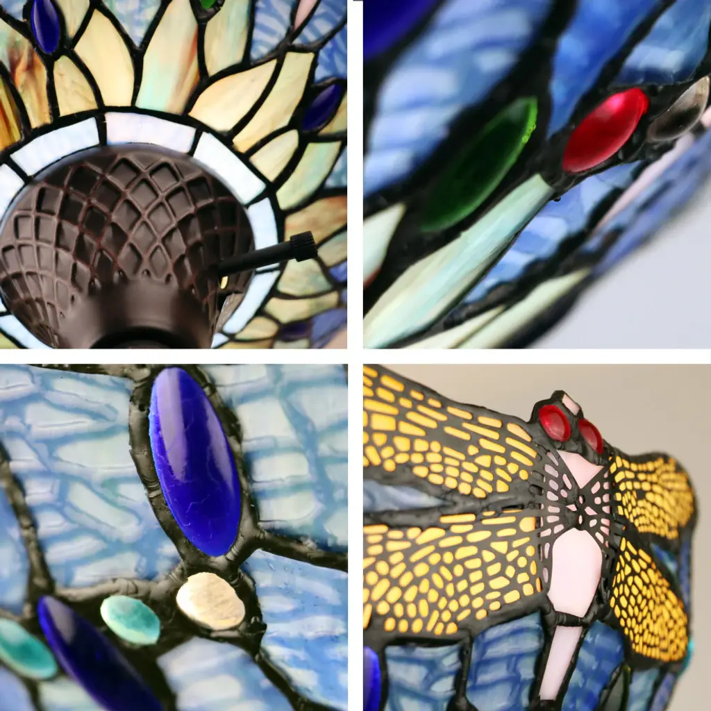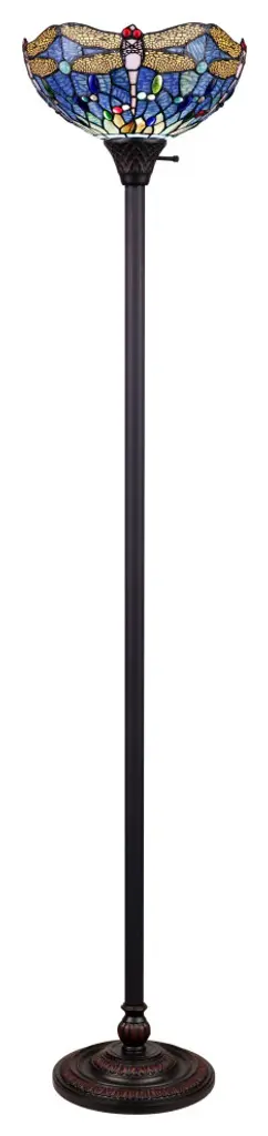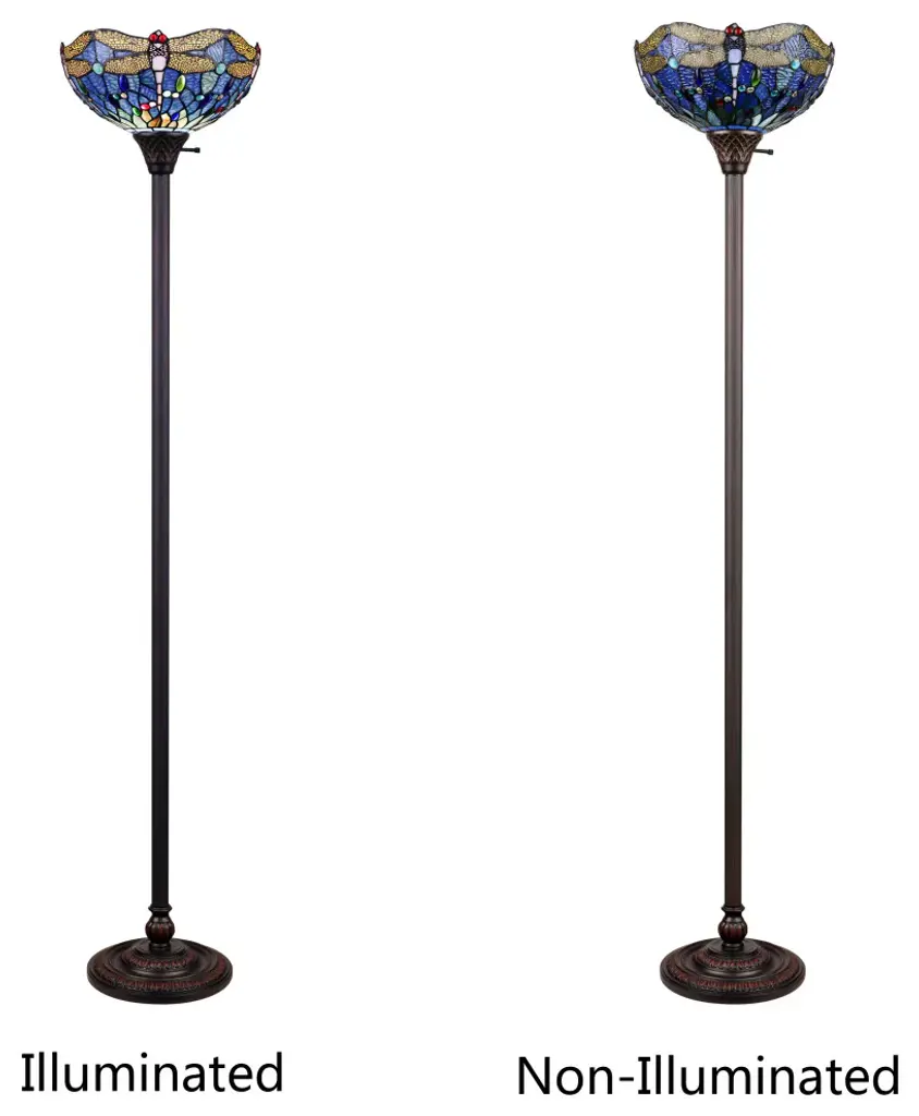 This is a Dragonfly design 1 light, Tiffany-style torchiere floor lamp that would be a perfect fit in a bedroom, office and livingroom! The shade is hand-crafted, using the same methods developed by Louis Comfort Tiffany in the early 1900''s. This process entails using 205 hand cut stained art glass pieces and 75 glass beads, each wrapped in fine copper foil and soldered together at extremely high temperatures to form each unique piece. Exact size to the nearest inch may vary, and exact color of each glass piece may vary due to each piece being hand crafted. First image is with the light shining through, second image is with no light. Dry listed and recommended for an indoor setting.