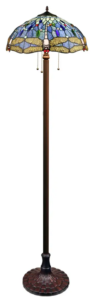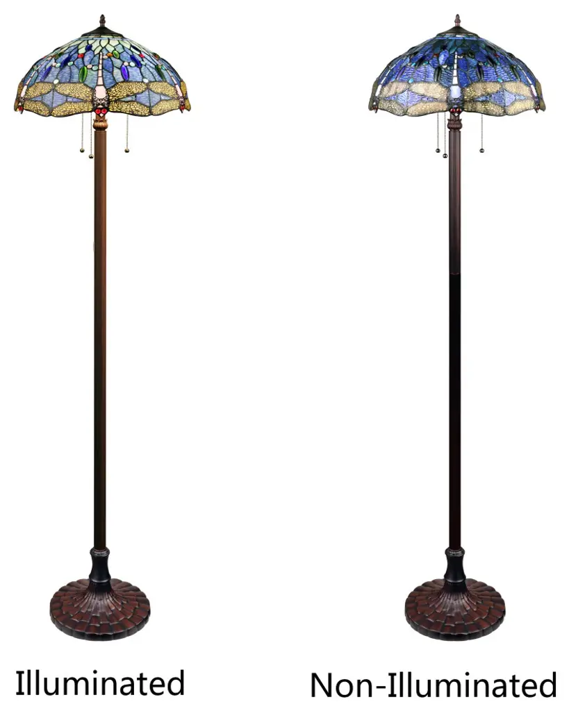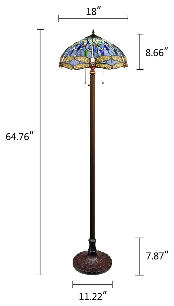 This is a Dragonfly design 3 light, Tiffany-style floor lamp that would be a perfect fit in a bedroom, office and livingroom! The shade is hand-crafted, using the same methods developed by Louis Comfort Tiffany in the early 1900''s. This process entails using 264 hand cut stained art glass pieces and 96 glass beads, each wrapped in fine copper foil and soldered together at extremely high temperatures to form each unique piece. Exact size to the nearest inch may vary, and exact color of each glass piece may vary due to each piece being hand crafted. First image is with the light shining through, second image is with no light. Dry listed and recommended for an indoor setting.