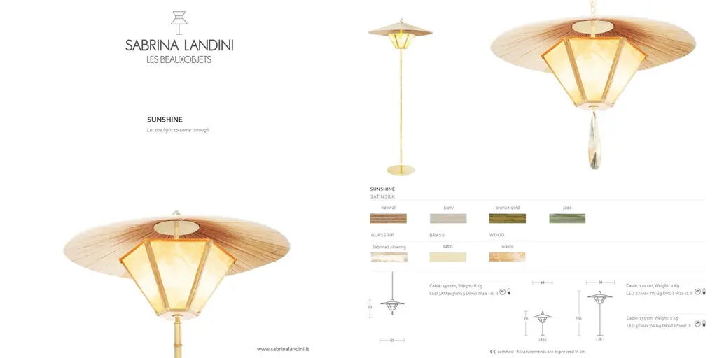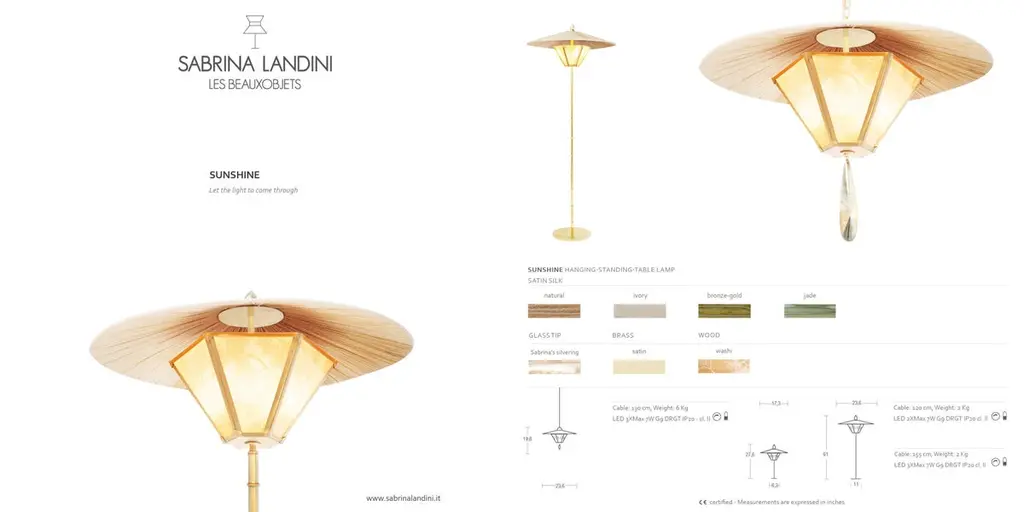 SUNSHINE , floor lampLet the light to come through!Thanks to the Italian manufacturing technique used in our workplace, each item is a testament to our commitment to craftmanship, with attention to detail and the finest materials.Here original Japanese papers, with Italian expertise, are recontemporized to create "Sunshine". A delicate Kioto’s paper, engraved as a Japanese garden, shines from a precious glass-brass theca and combines with a lampshade wrapped by hand with a vintage Japanese paper ribbon. Sabrina’s jewel, the silvered crystal drop. A new testament to Sabrina's heritage and dedication to high quality Available in version Hanging lamp and floo lampLampshade colors available on request CE certified and US wired with 3xG9 lamp holders, we recommend dimmable bulbs with warm light