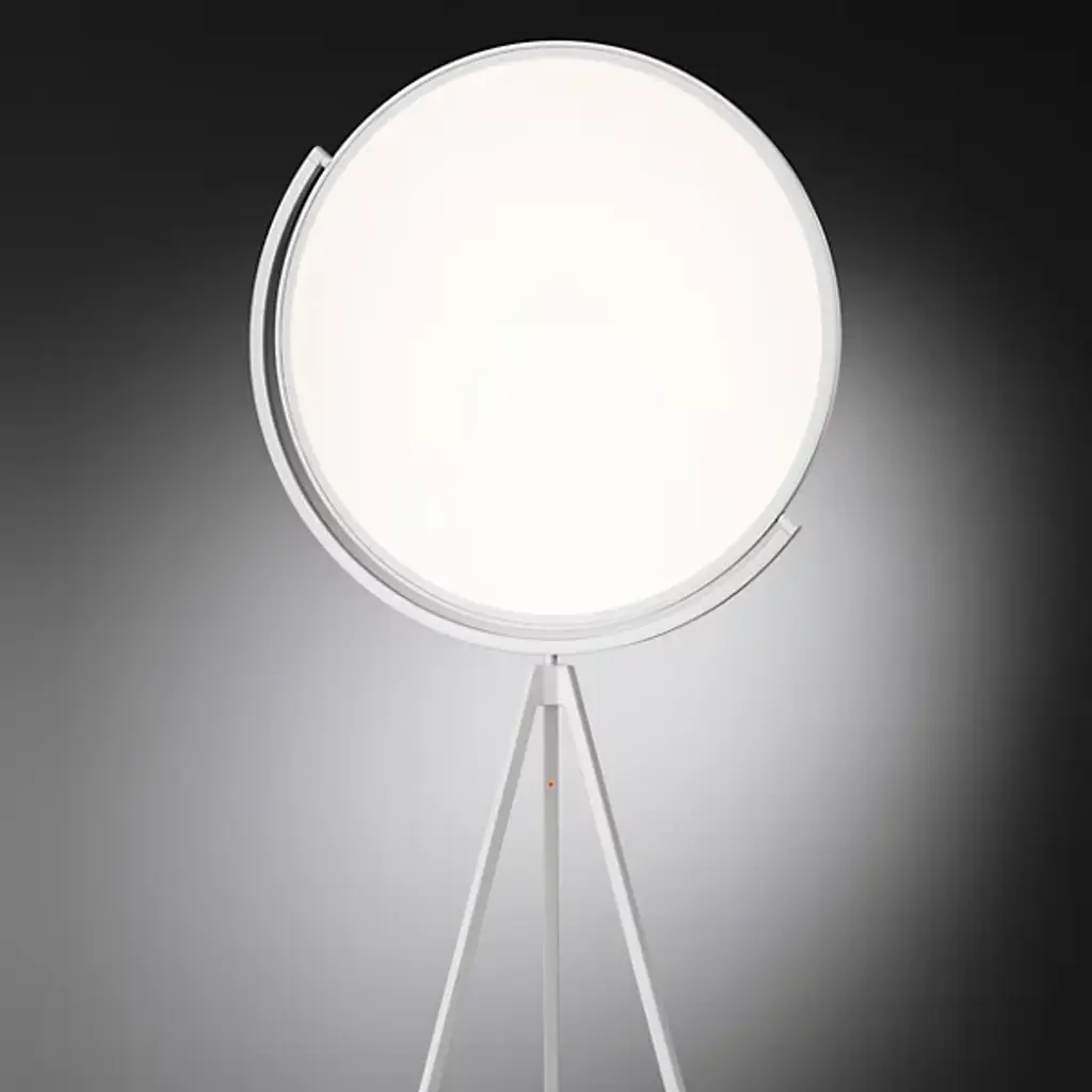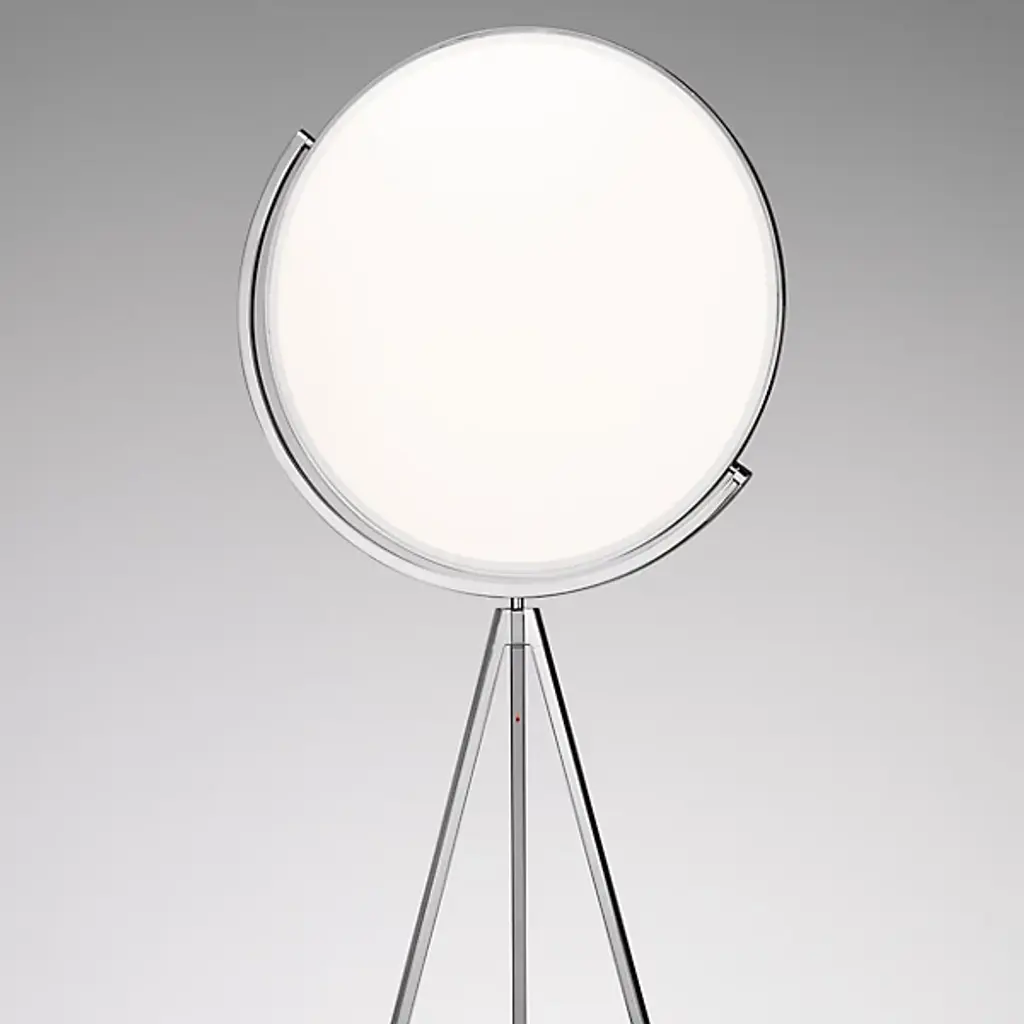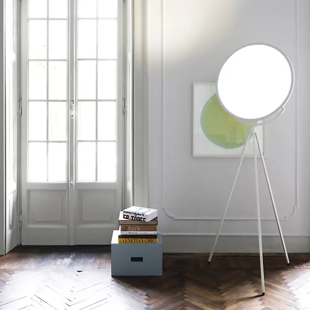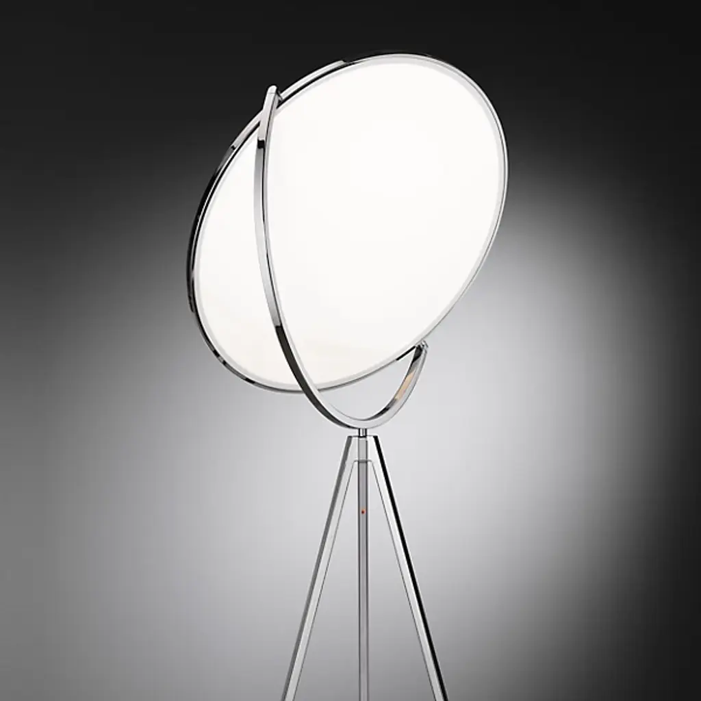Reminiscent of the glow of the moon, the FLOS Superloon Floor Lamp is an innovative, wonder-inspiring piece that provides ambient lighting and direct light for areas like living rooms and bedrooms as well as commercial spaces. The lamp features a head made of metal that spins, an extruded stem, die-cast joints and a Dim-to-Warm function that causes the tone of the light to shift from colder to warmer as it dims in intensity. Designed by Jasper Morrison, the piece uses energy efficient LED "Edge Lighting" that incorporates the light in the edge of a translucent, white disc.