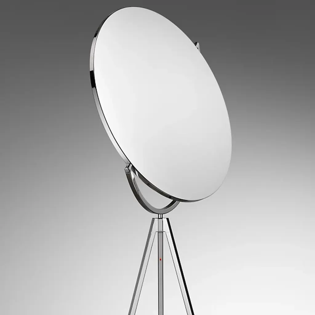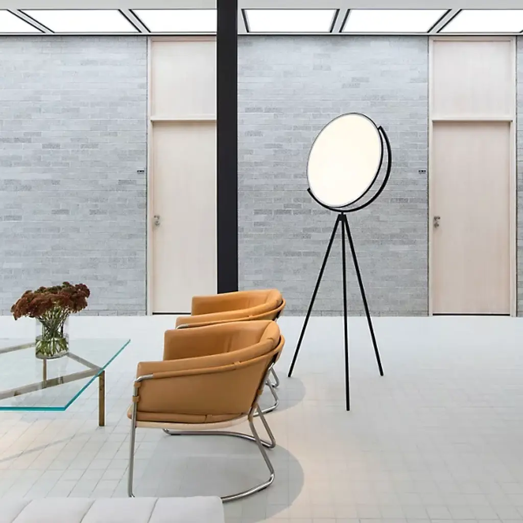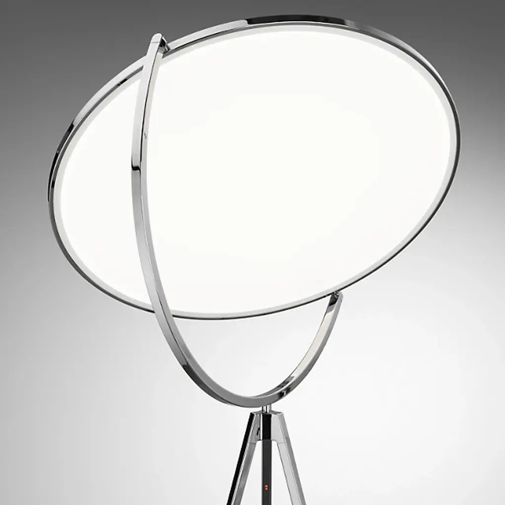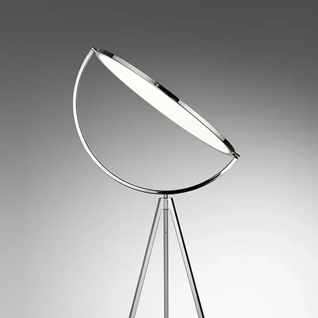 Reminiscent of the glow of the moon, the FLOS Superloon Floor Lamp is an innovative, wonder-inspiring piece that provides ambient lighting and direct light for areas like living rooms and bedrooms as well as commercial spaces. The lamp features a head made of metal that spins, an extruded stem, die-cast joints and a Dim-to-Warm function that causes the tone of the light to shift from colder to warmer as it dims in intensity. Designed by Jasper Morrison, the piece uses energy efficient LED "Edge Lighting" that incorporates the light in the edge of a translucent, white disc.