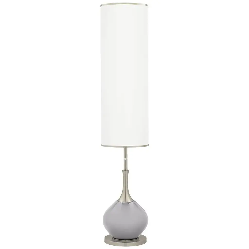 PRODUCT DETAILS: 62" high overall. Bottom base is 11" wide. Shade is 36" high x 12" wide. Weighs 15 lbs. Uses one maximum 150 watt standard-medium base bulb (not included). On-off rotary switch. Contemporary modern glass floor lamp from the Color + Plus lighting collection. Swanky Gray designer finish. Round glass body. Brushed nickel finish accents. Metal construction. White linen cylinder shade with top and bottom metal trim. 8-foot long silver cord and plug. DESCRIPTION: Liven up your living space with this contemporary floor lamp from the Color + Plus™ collection. It comes in a brushed nickel finish metal frame, which supports a round glass body in a designer Swanky Gray finish. A long white cylinder shade covers over half the design. The result is an eye-catching modern glass floor lamp with brilliant coloring.