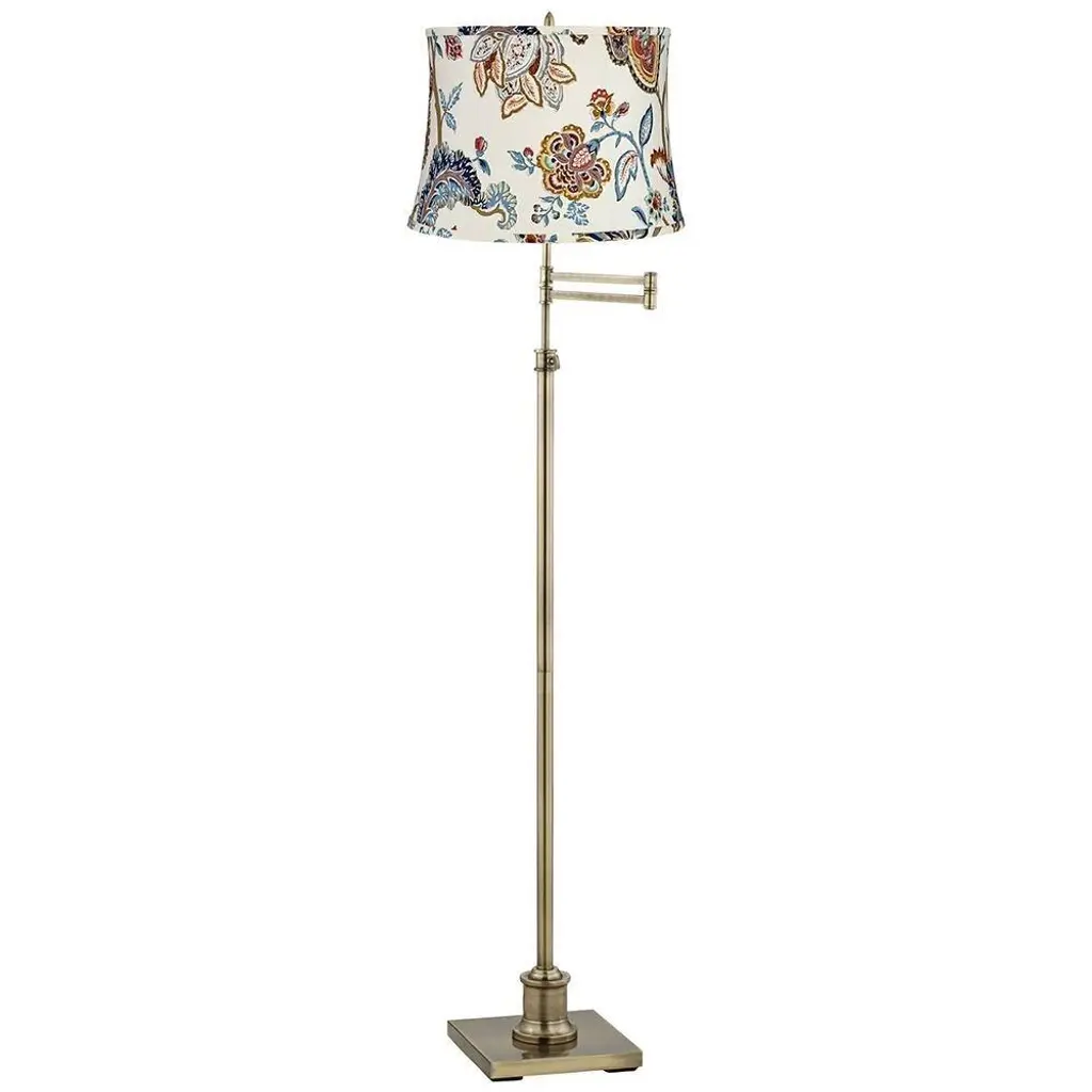 PRODUCT DETAILS: 62" to 70" adjustable height. Square base is 9 1/2" wide. Maximum arm extension is 13". Shade is 14" across the top x 16" across the bottom x 11 1/2" high. Uses one maximum 100 watt standard-medium base light bulb (not included). On-off socket switch. Adjustable floor lamp from 360 Lighting brand. Lamp pole is adjustable in height. Position of the top light is also adjustable with the swing arm feature, allowing you to position the shade and light just where you want it. Antique brass finish base and pole. Metal construction. Paisley pattern fabric shade with multi-color flowers on an off-white background. 8-foot long cord. DESCRIPTION: A chic addition to a wide variety of decor styles, this transitional floor lamp comes in a classic antique brass finish. Its thin profile and base design offer an easily adjustable swing arm and height for optimum convenience. Adorned with its white paisley shade, this contemporary floor lamp is sure provide warm, inviting lighting.
