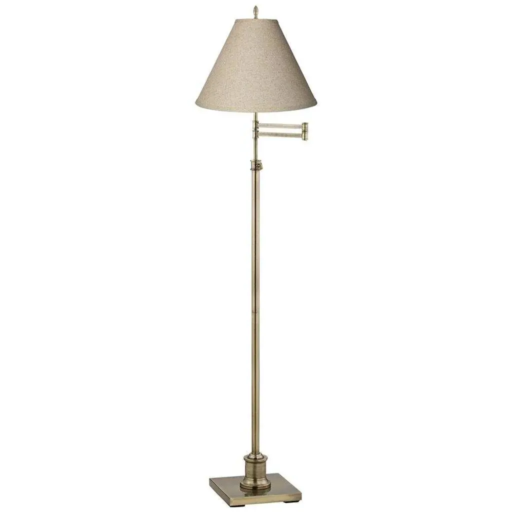 PRODUCT DETAILS: Adjustable from 62" to 70" high. Base is 9 1/2" square. Maximum arm extension of 13". Shade is 6 1/2" across the top x 15" across the bottom x 11" high. Uses one maximum 100 watt standard-medium base light bulb (not included). On-off socket switch. Adjustable swing arm floor lamp. Traditional style adjusts in both height and placement of the top light. From the 360 Lighting brand. Antique brass finish base, column, and swing arm. Metal construction. Fine burlap cotton blend fabric empire shade. 8-foot long cord. DESCRIPTION: Wearing an antique brass finish, this transitional floor lamp maintains timeless style. Its swing arm design and adjustable height allow it to cater to your ideal level of comfort and convenience. Topped with a fine burlap cotton blend empire shade, this modern lamp is as chic as it is functional.