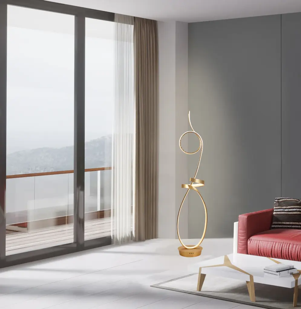 Light up your living room, bedroom or office with this Sleek, Modern and Unique Design "Symphonie" LED Floor lamp from Artiva USA. Artiva "Symphonie" LED floor lamp Design is a perfect addition to any room with modern or contemporary decor. The "Symphonie " floor lamp holds 68W LED(5000 Lumen) and warm LED lights( 3000K ). The artistic curved design adds a soft note to any of your decor. Standing over 63"H, the fixture has a statuesque appearance and draw attention. The Artiva "Symphonie" LED floor lamp allows you to place the light wherever you need it and provide ample lighting for creating a spot light , in the setting next to the couch, in the corner or in the center of your living room. Super Bright integrated LED included. Perfect conversation pieces.Features exclusive 68W (5000 Lumens) integrated Super bright 63"H LED Floor lamp . 25000 hrs rated --last over 20 years . never have to change bulb again.Compare to 300W lamp, this Artiva LED lamp uses only 68W of electricity and will save you over $50 every year off of your electric bill (based on 6-hours per day usage and 11 cents per kilowatt)Sleek, Modern and Unique Design. Beautiful Anodize Gold finishFoot On-off Switch. Smart Outlet Compatible . Works with Smart outlets that are Alexa, Google Home assistant or Apple Home Kit enabled to turn the lamp on/off.