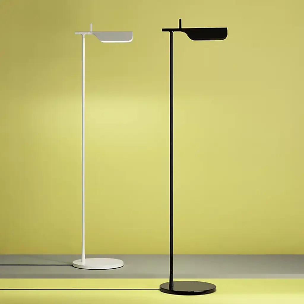 The Flos Tab LED Floor Lamp was designed by Edward Barber and Jay Osgerby to add bright, adjustable lighting and slick contemporary style into modern interiors. Made entirely out of die-cast aluminum--from the top of the adjustable head down to the round base--with a porcelain reflector inside the head.