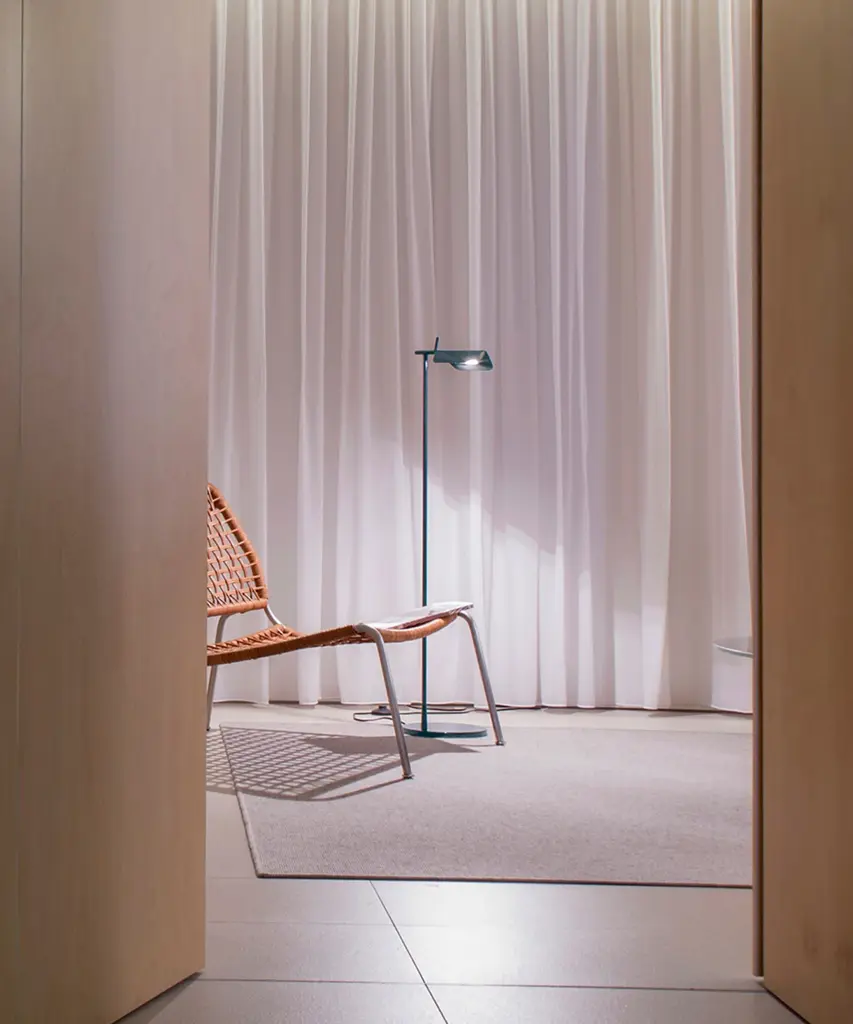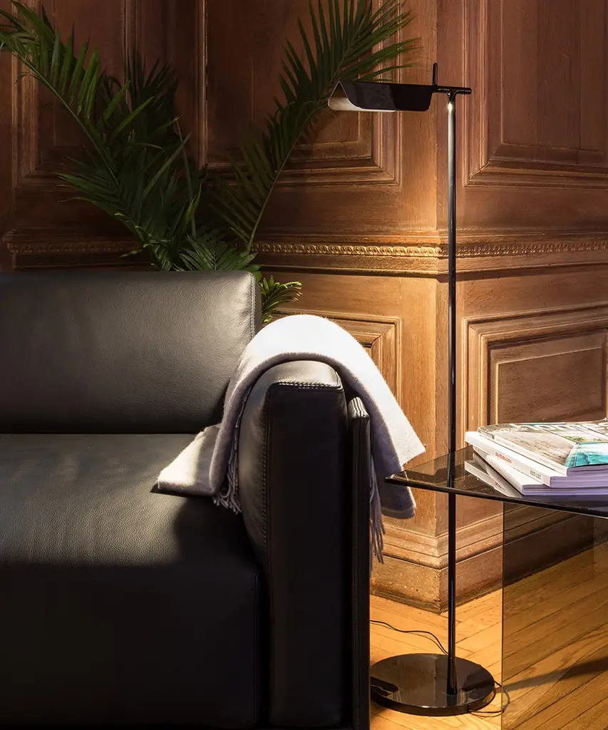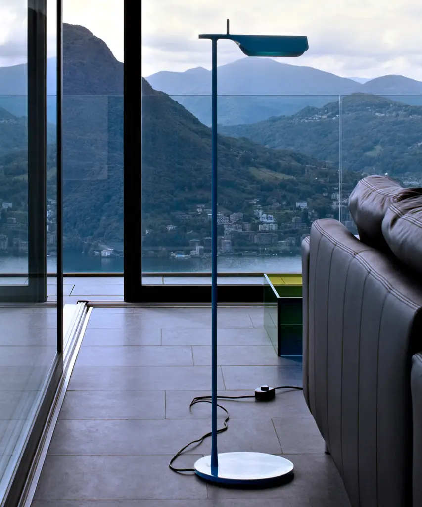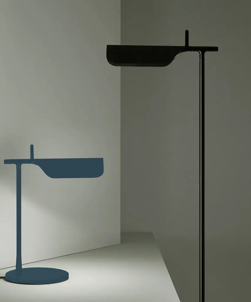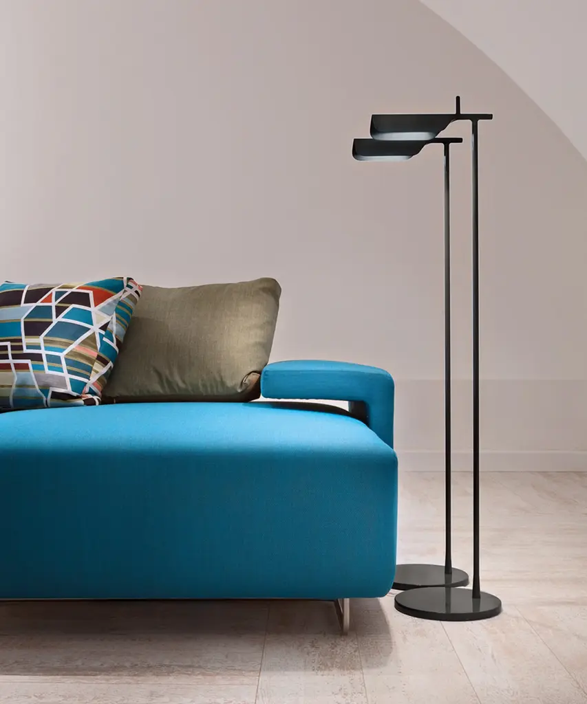 A brand new edition of the Tab family, now with new capabilities in new colors. This new edition of Tab floor lamp has an adjustable head with a 90-degree rotation capability emitting non-dimmable, direct light. Available in 2 new finishes matte blue and matte dark green as well as the original black and white. Brought to life by the design duo of Edward Barber and Jay Osgerby originally designed in 2011, the Tab floor lamp is a tribute to the spirit of innovation. The lamp body is painted with pressofused aluminum. Its multi-led diffuser is specially designed PMMA (Polymethyl methacrylate), created to avoid a multi-shadow effect and dazzle. The inspiration behind the design: Designers Edward Barber and Jay Ogersby keep one goal in mind when they begin a creation: Challenge everything. When we are commissioned to design a product, we seek to re-evaluate the archetype, to challenge precedents. We always look at different ways in which products can be manufactured, not necessarily by using new materials or radical rethinking, but maybe by using existing techniques in a more original or intelligent way. This authentic design is produced in Italy exclusively by Flos.