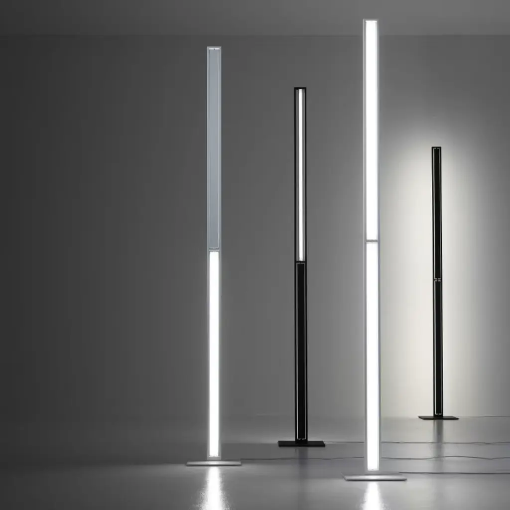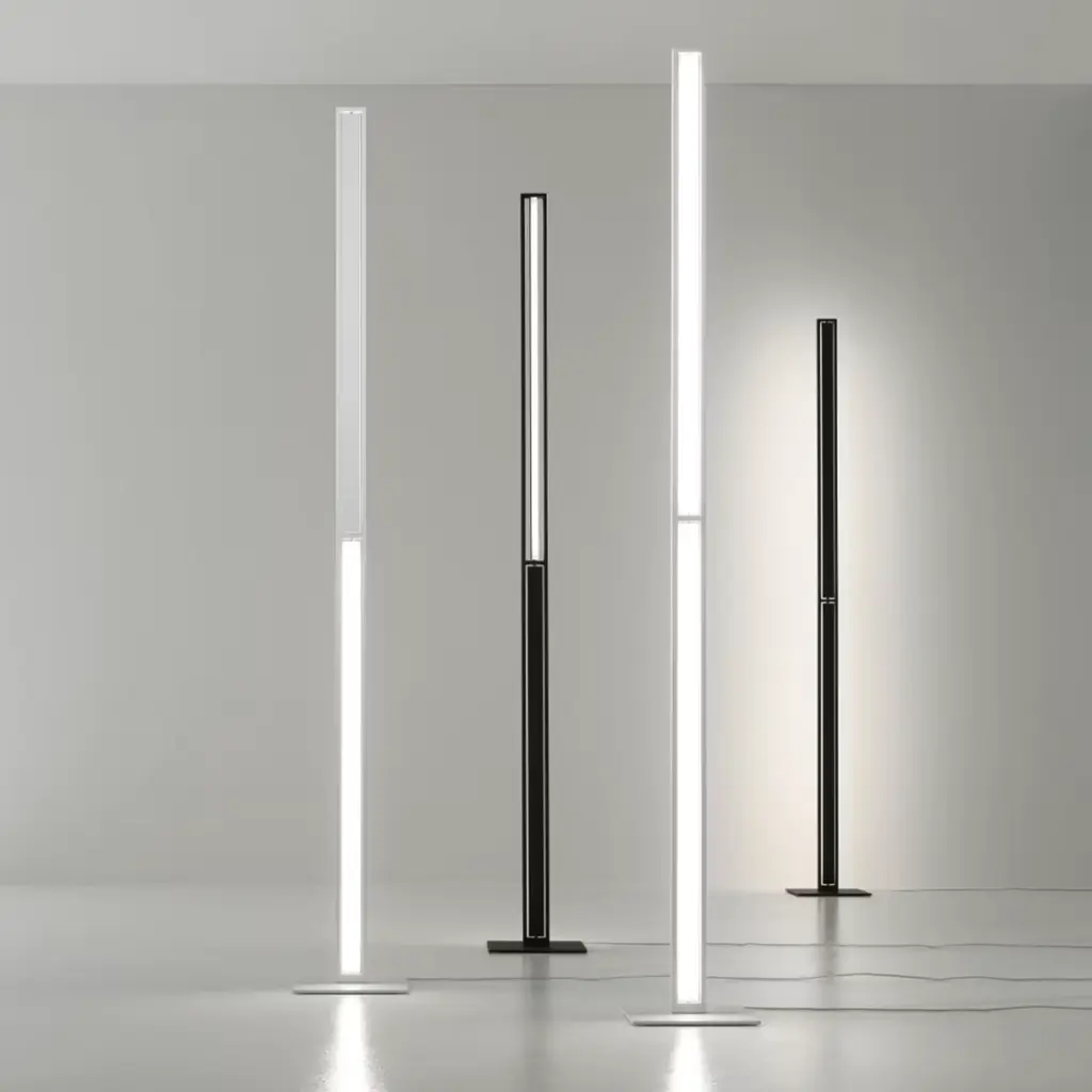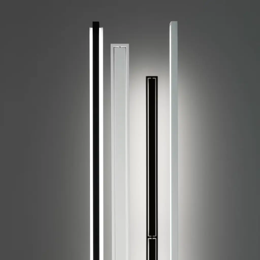 A design aluminum upright with metal base, white or black finish. Rectangular, slender, and minimal in shape, it has two swivel modules in series with topLED sources and a polycarbonate diffuser. Controlled at 350°, the light on each support can be directed in all directions or limited to defined portions of the room, acting as ambient light or for relaxation corners. Single emission floor lamp for indoor application.
